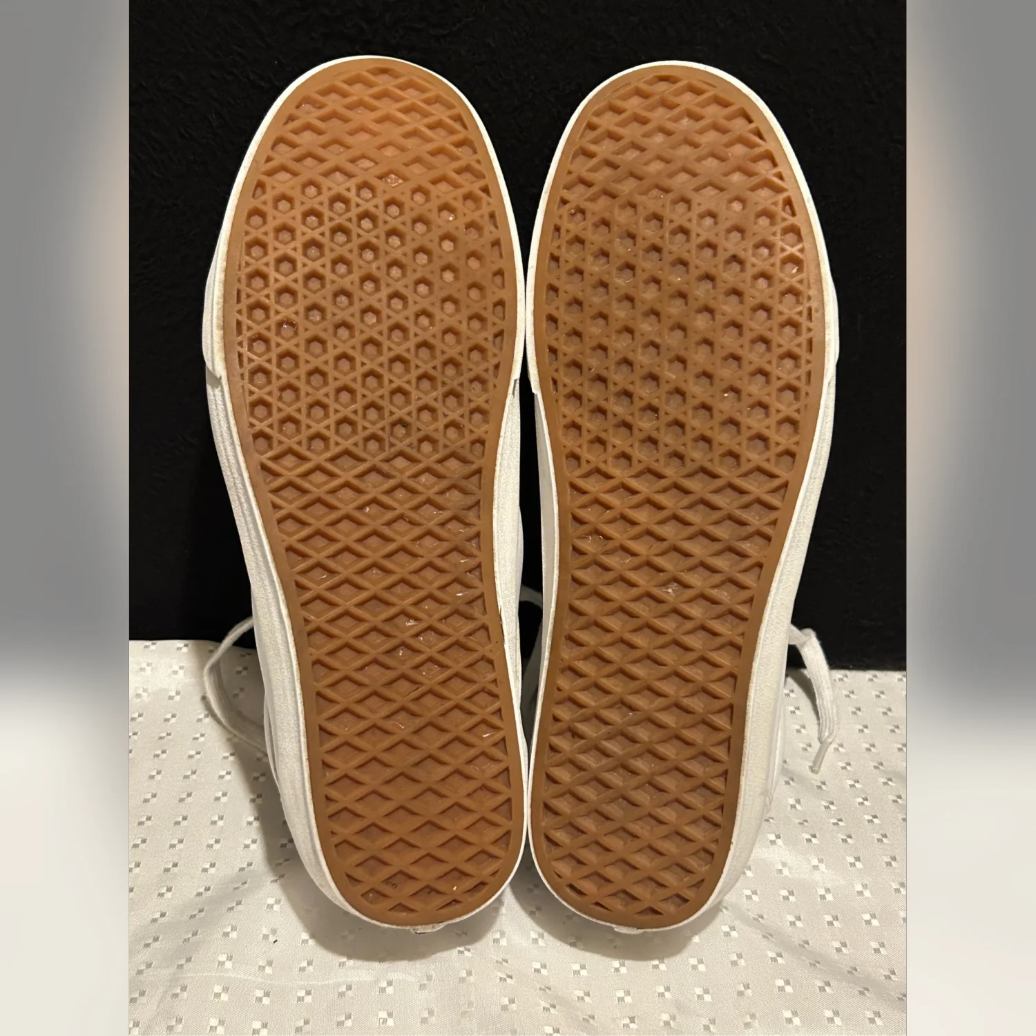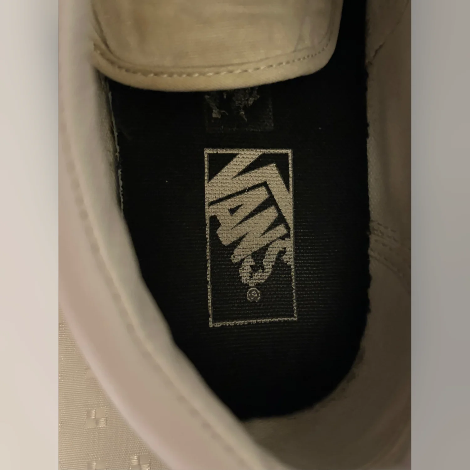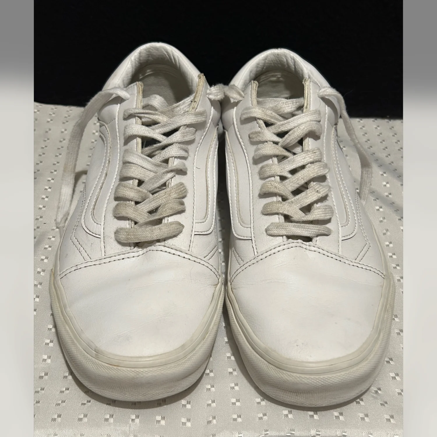 This is a pair of Vans Old Skool low top sneakers in an all-white colorway, featuring leather uppers and the signature Vans side stripe. This model is popular for its classic skate style and versatility.
