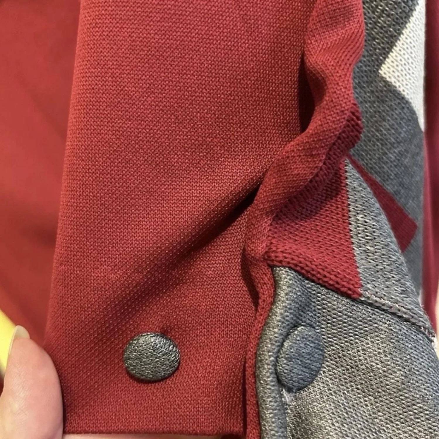 This is a vintage long-sleeve shirt featuring a bold geometric pattern in burgundy, gray, and white, with a wide pointed collar typical of 1970s fashion. The shirt is made from a textured double knit polyester, a popular material of the era, and has original matching buttons. The label reads 'Diplomat Double Knit,' indicating a likely mid-tier brand from the period.