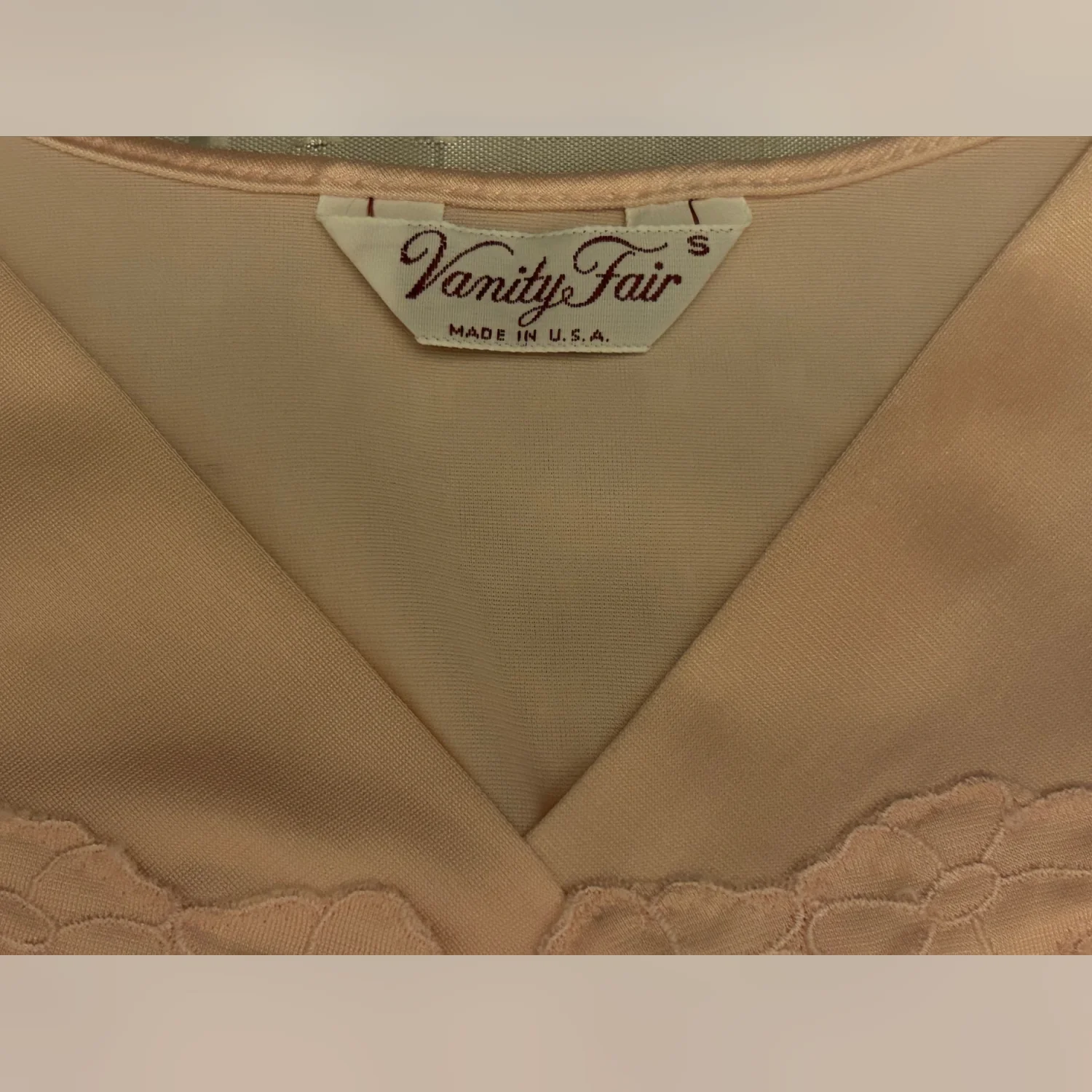 The Vintage 70s Pink Nylon Nightgown by Vanity Fair is a charming and elegant piece of women's sleepwear. This sleeveless midi nightgown in a feminine pink color exudes a retro 1970s vibe, perfect for a nostalgic eveningwear look. Made of soft nylon material, this original piece was crafted in the United States, adding a touch of American-made quality to your wardrobe. With its Size Small fit, this nightgown is a lovely addition to any vintage clothing collection.