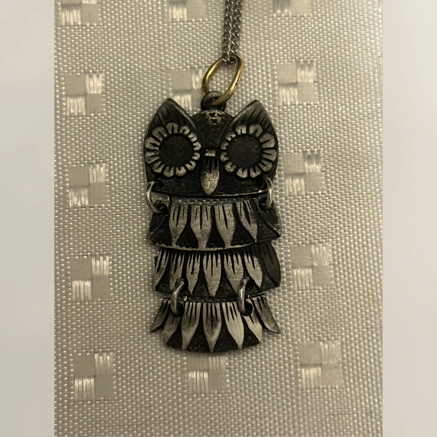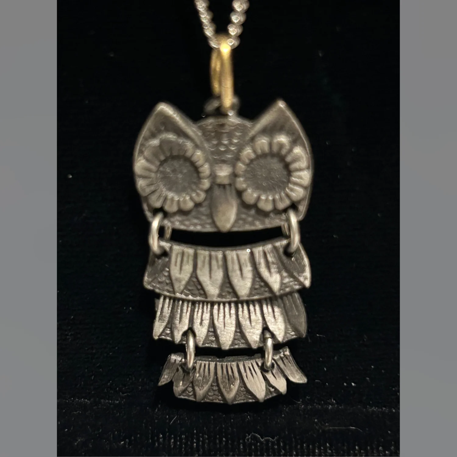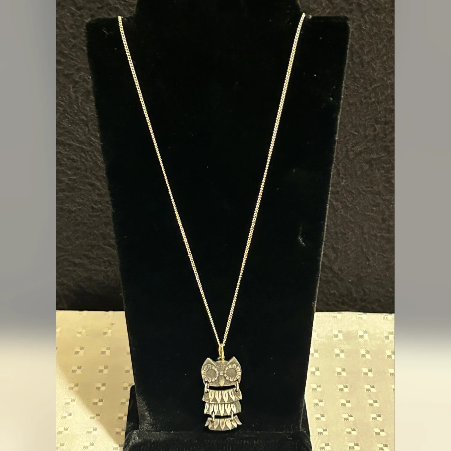 This is a vintage owl pendant necklace featuring a carved owl design. The pendant is attached to a metal chain, showcasing intricate detailing on the owl's features.