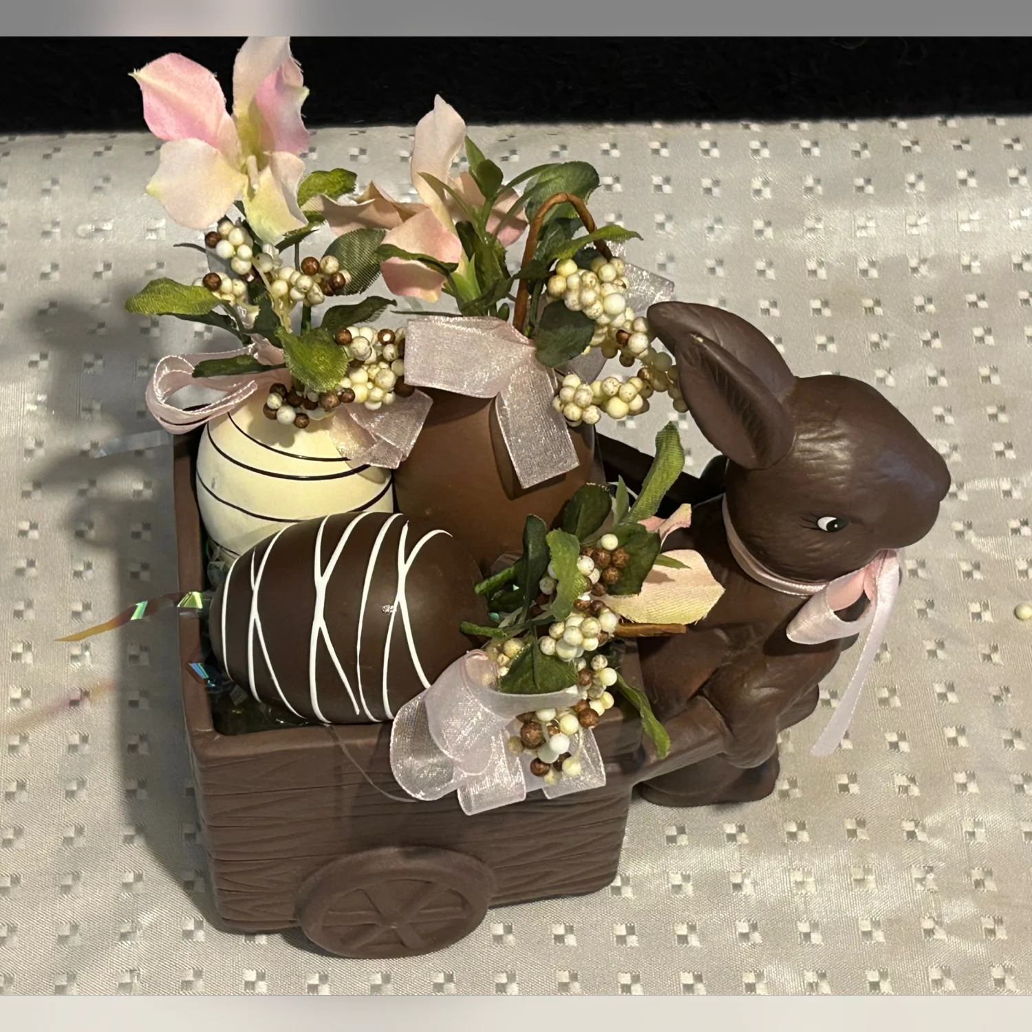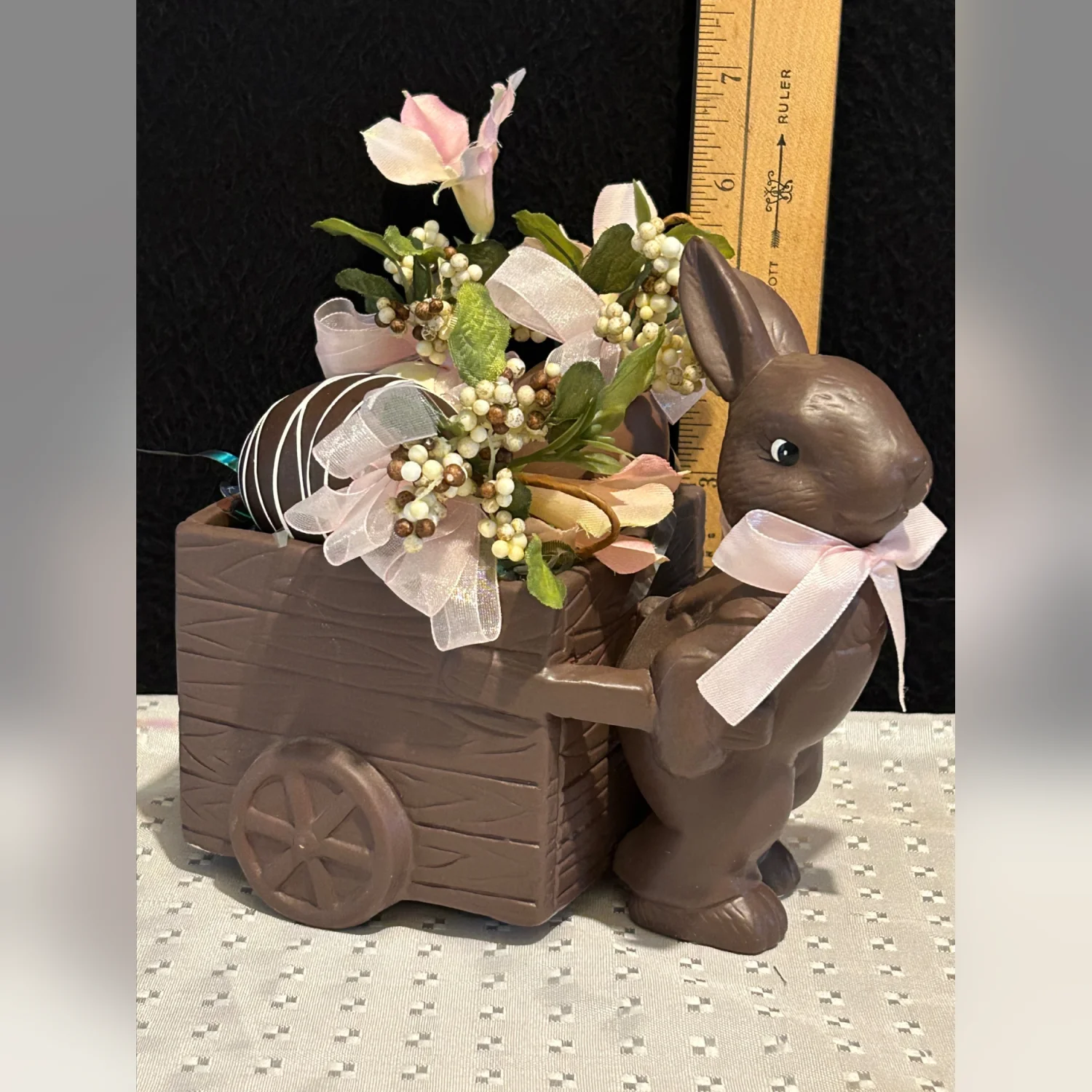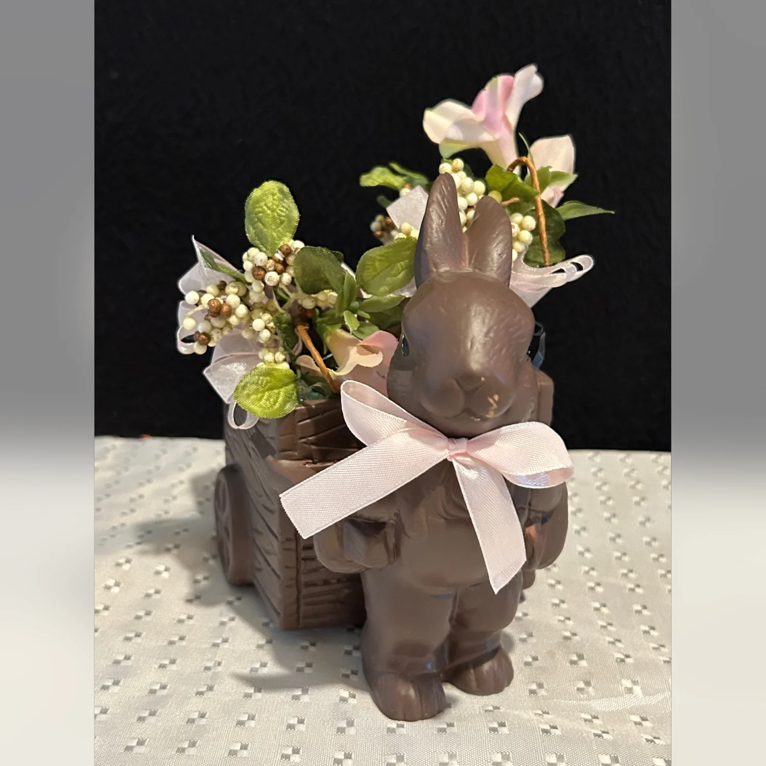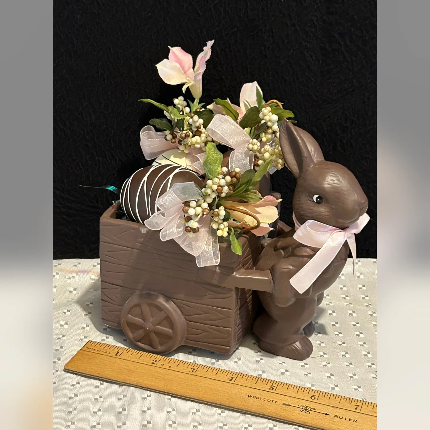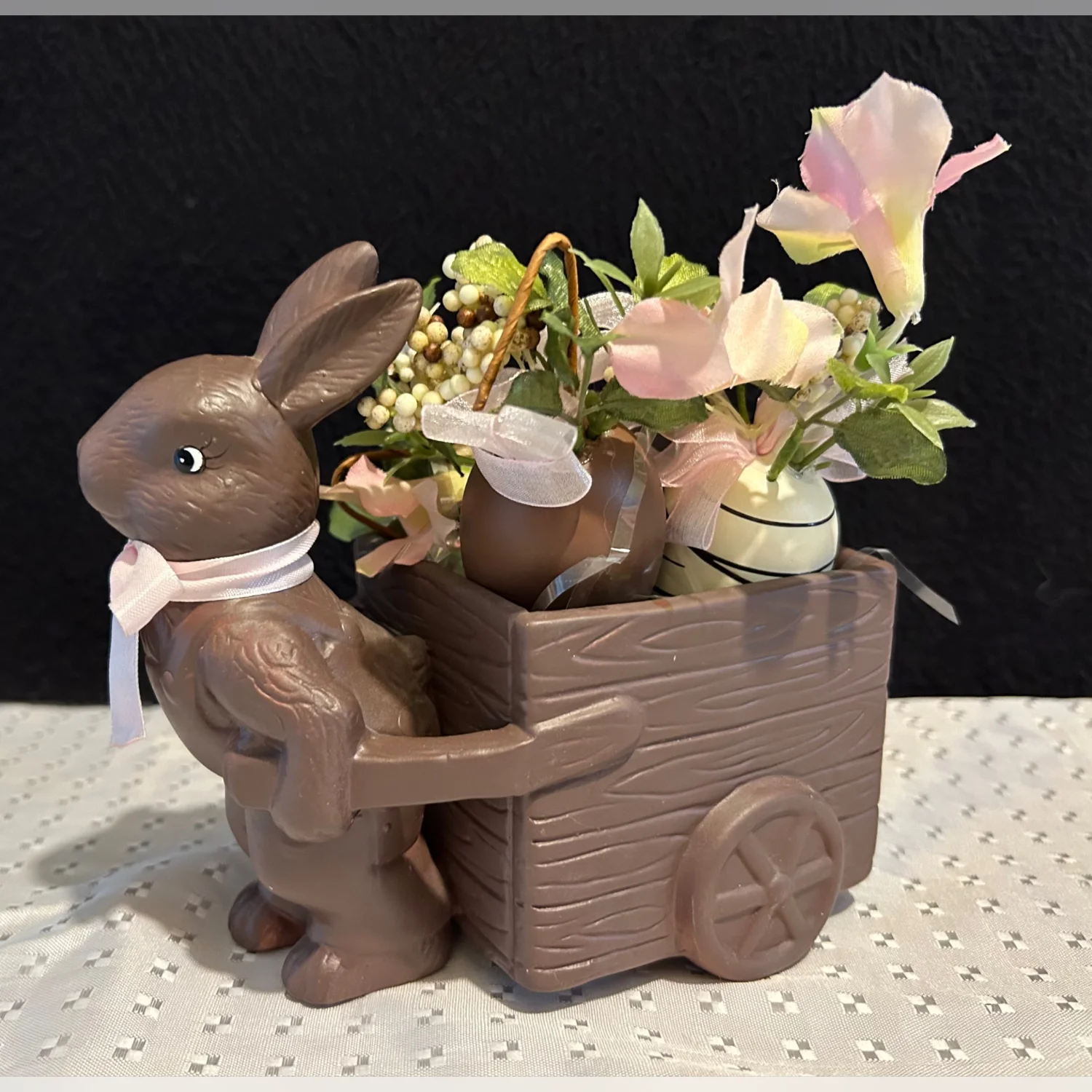 Vintage Ceramic Faux Chocolate Matte Easter Bunny w/ Cart And Faux Choc. Candies