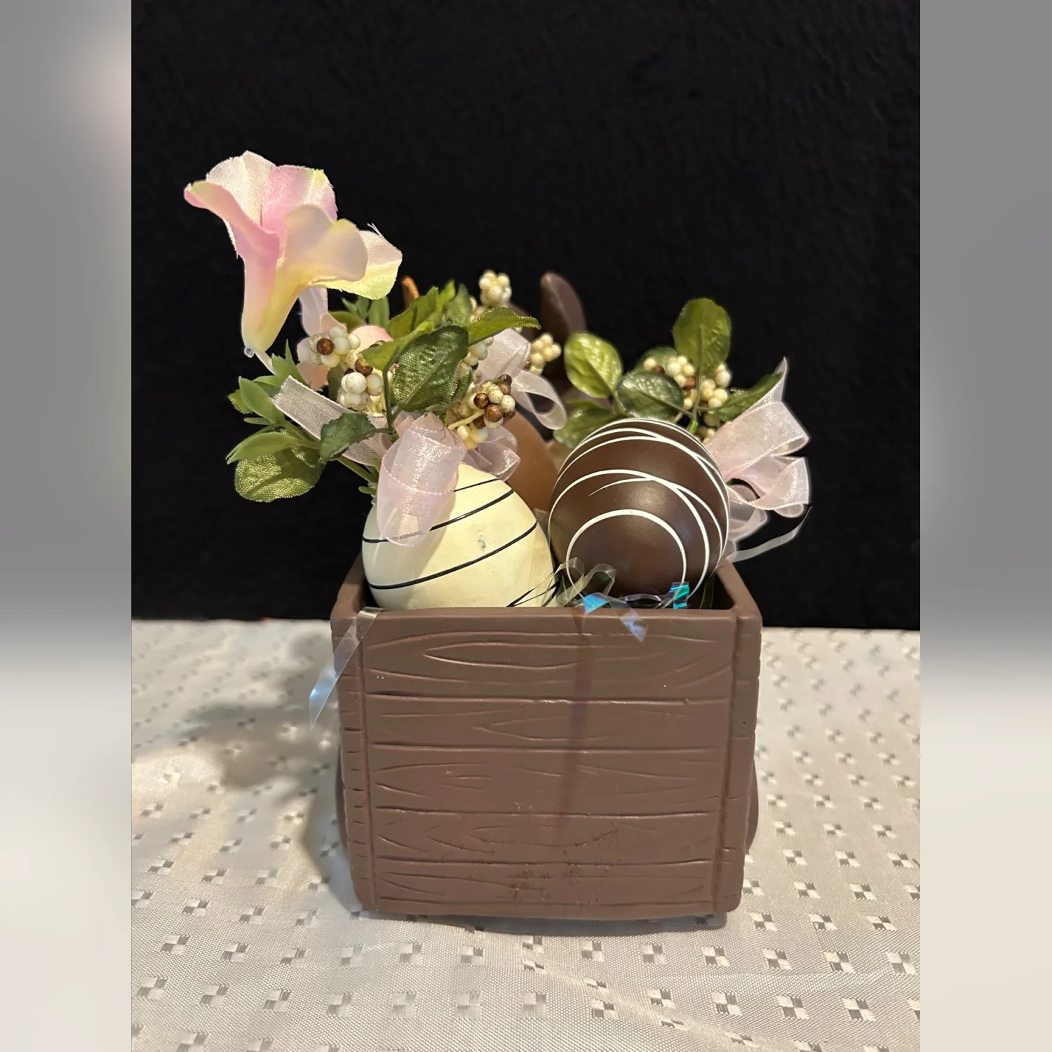 This vintage ceramic Easter bunny with cart and faux chocolate candies is a charming addition to any holiday decor collection. Made of brown ceramic, this detailed piece captures the essence of Easter with its whimsical design. Perfect for celebrating the holiday season, this faux chocolate matte bunny is sure to bring a touch of nostalgia and charm to any space.