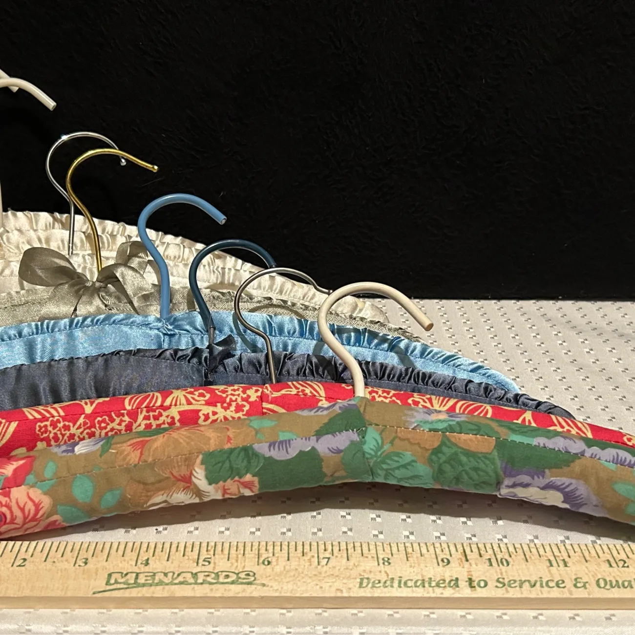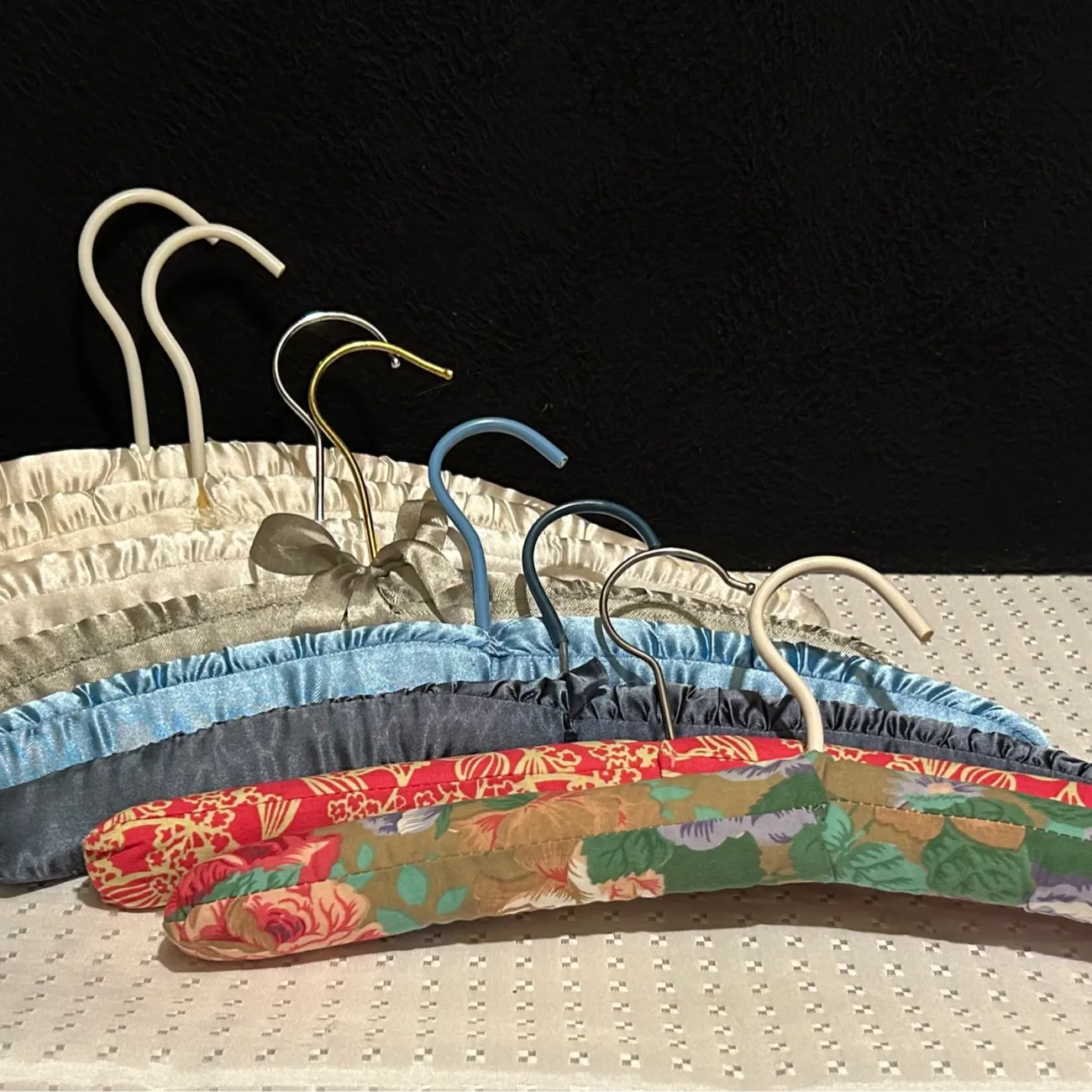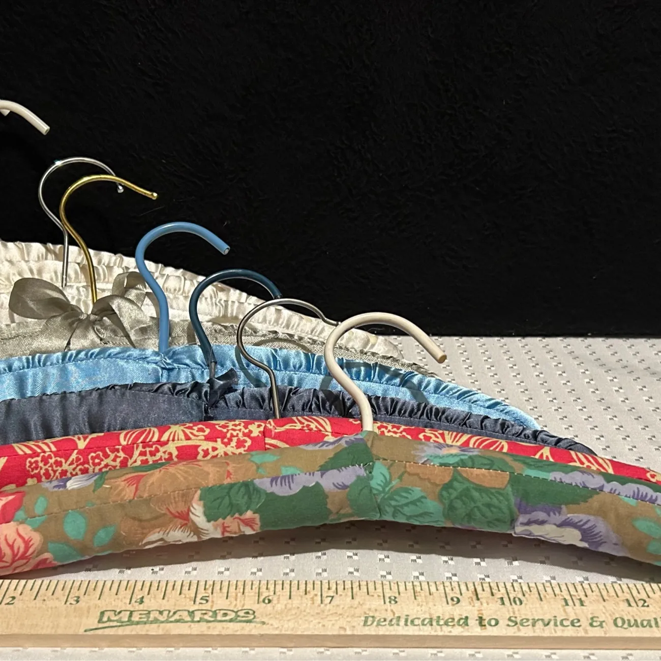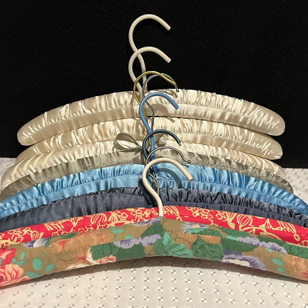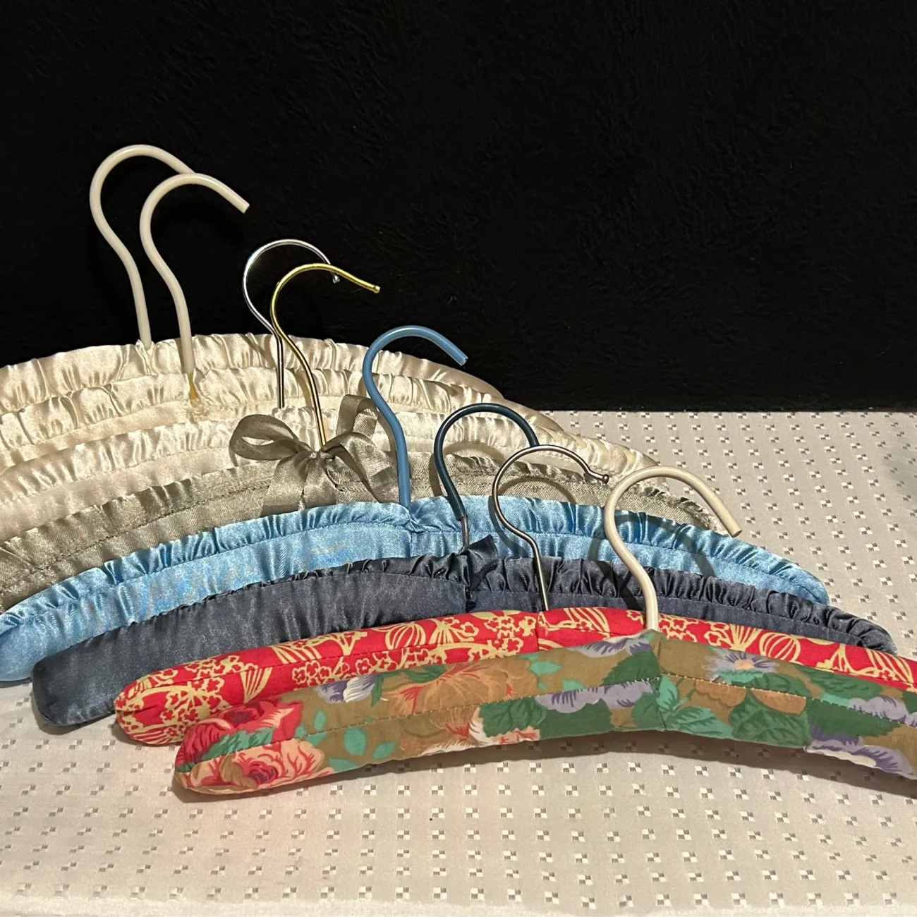 A collection of vintage satin padded hangers in various colors and patterns. These hangers are designed to protect delicate clothing and add a touch of elegance to any closet.