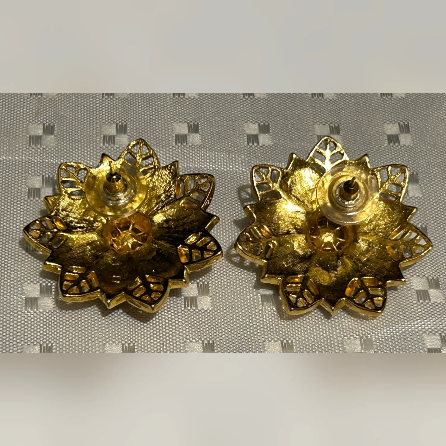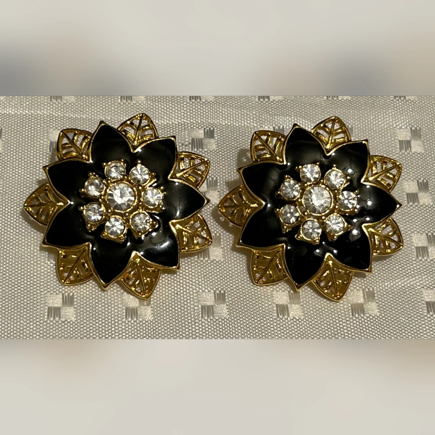Vintage GOLD TONE With Black Enamel Flower PIERCED Earrings Avon