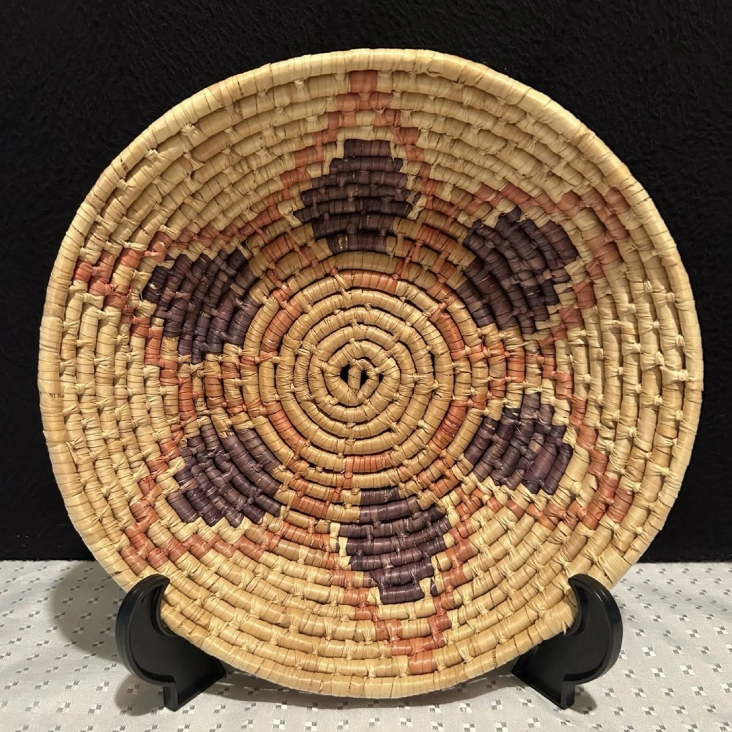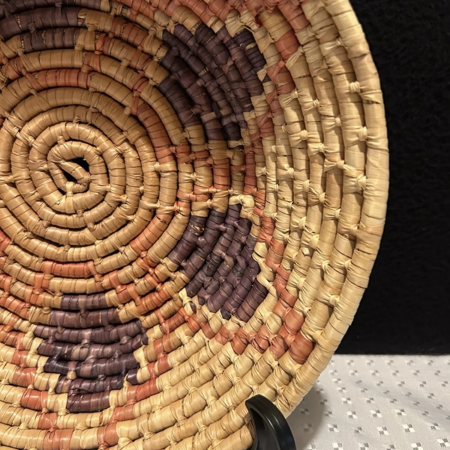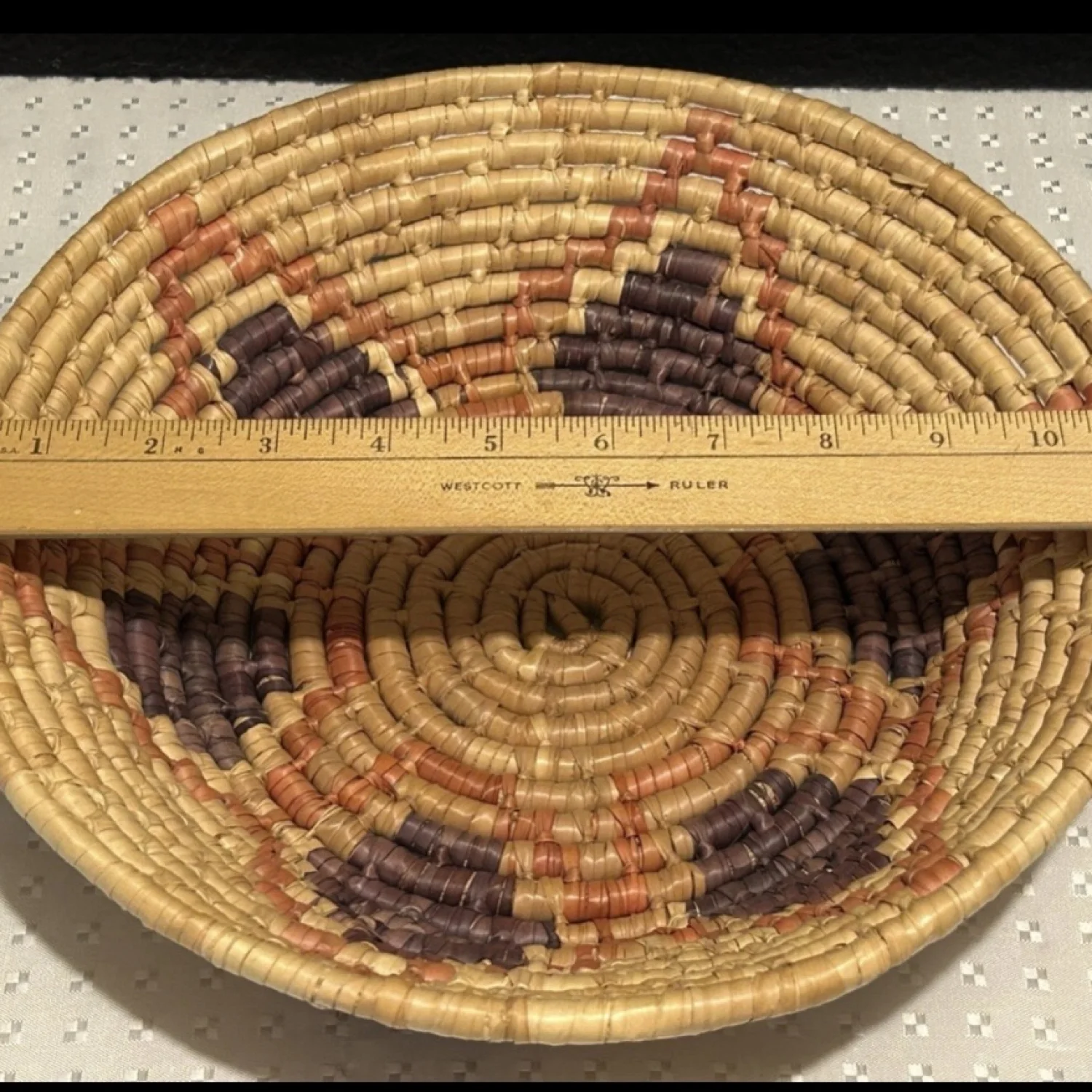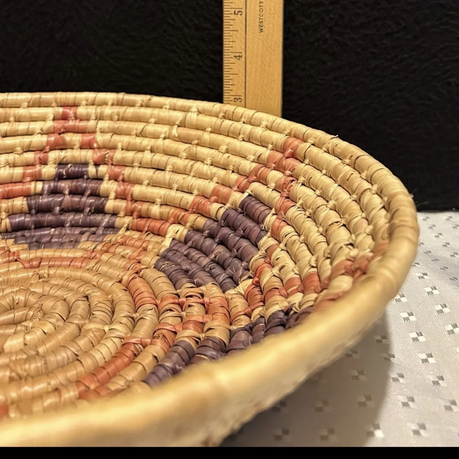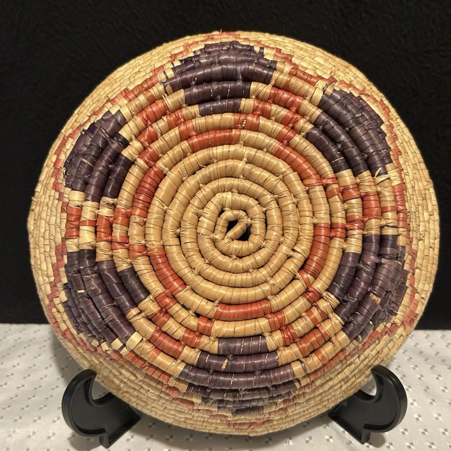 A round, handwoven wicker basket featuring a geometric pattern in natural, orange, and purple hues. The basket is crafted with a coiled technique, showcasing traditional weaving skills.
