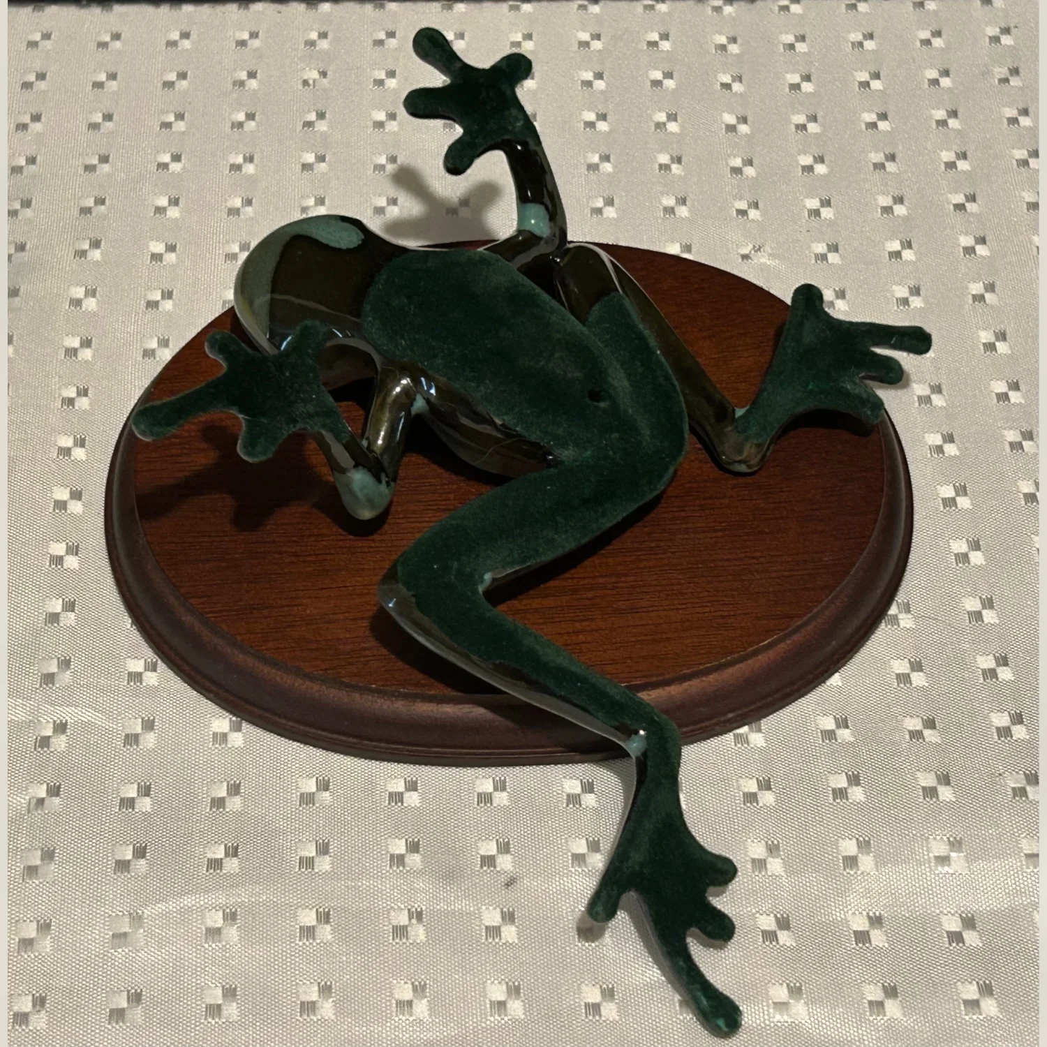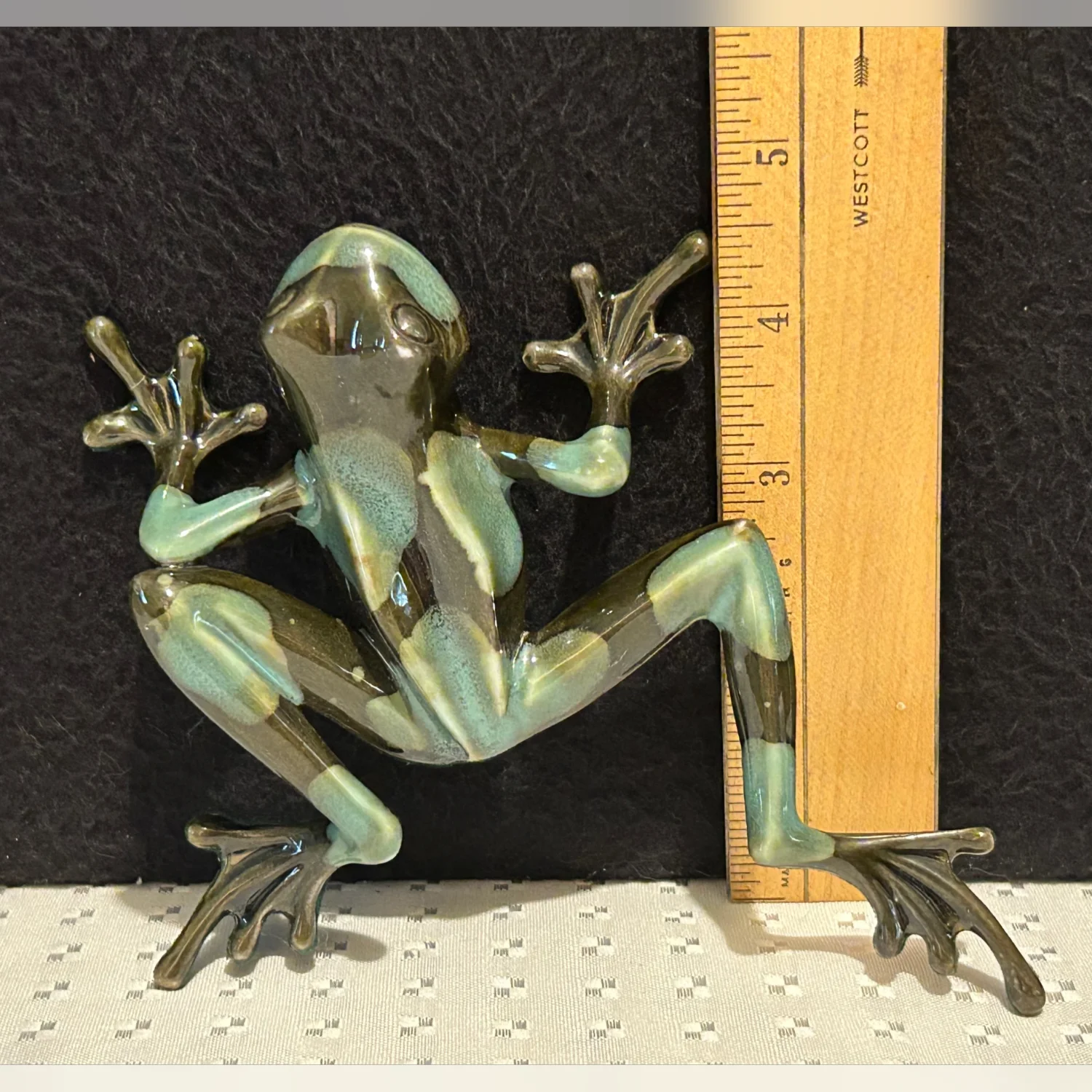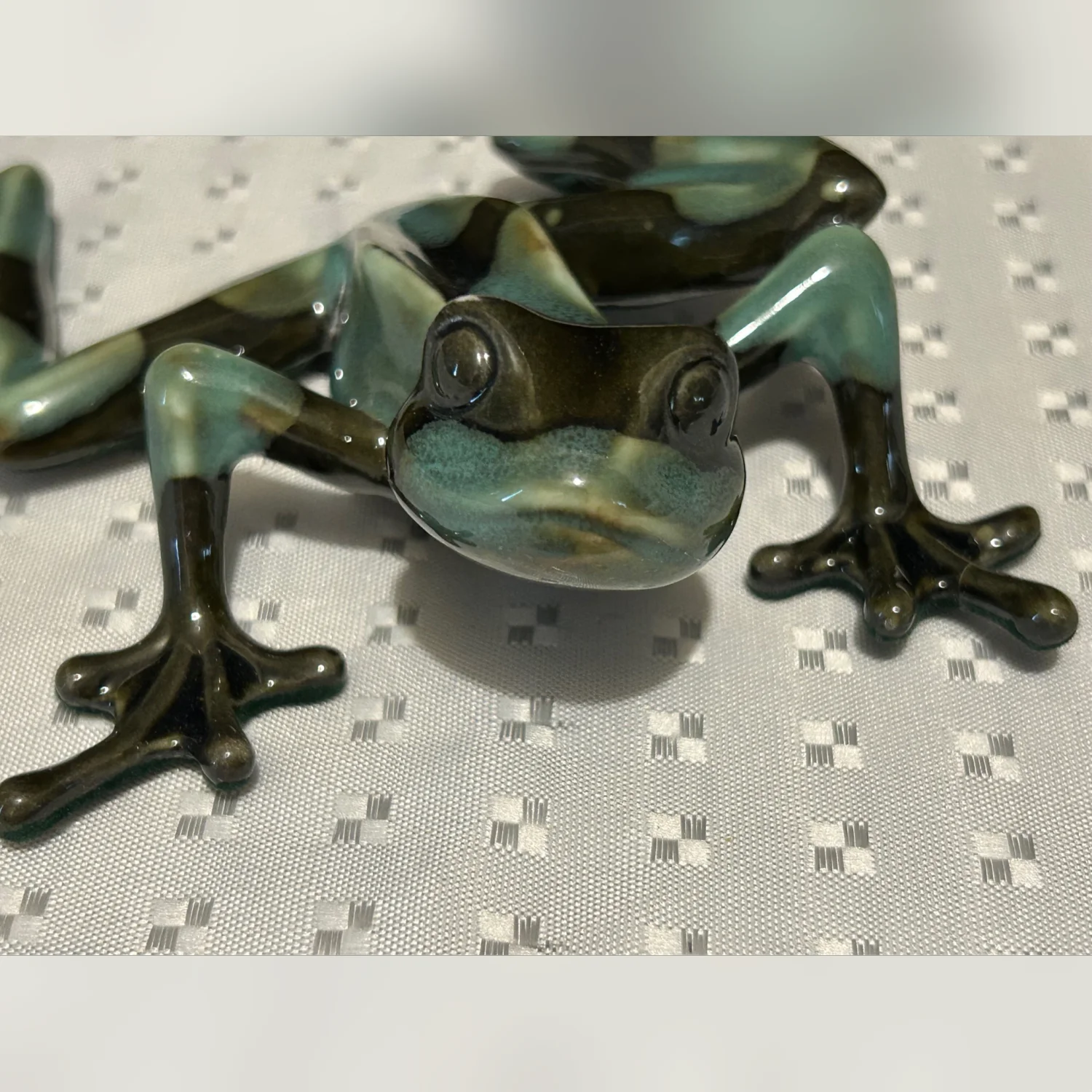 This vintage large porcelain frog art figurine by DAVID ENT from England is a realistic and beautifully crafted sculpture. Handmade with a multicolor abstract pattern, this piece captures the essence of art pottery production in the 2000-2009 time period. With a width of 5.25 inches, this collectible item adds a touch of charm and uniqueness to any decor.