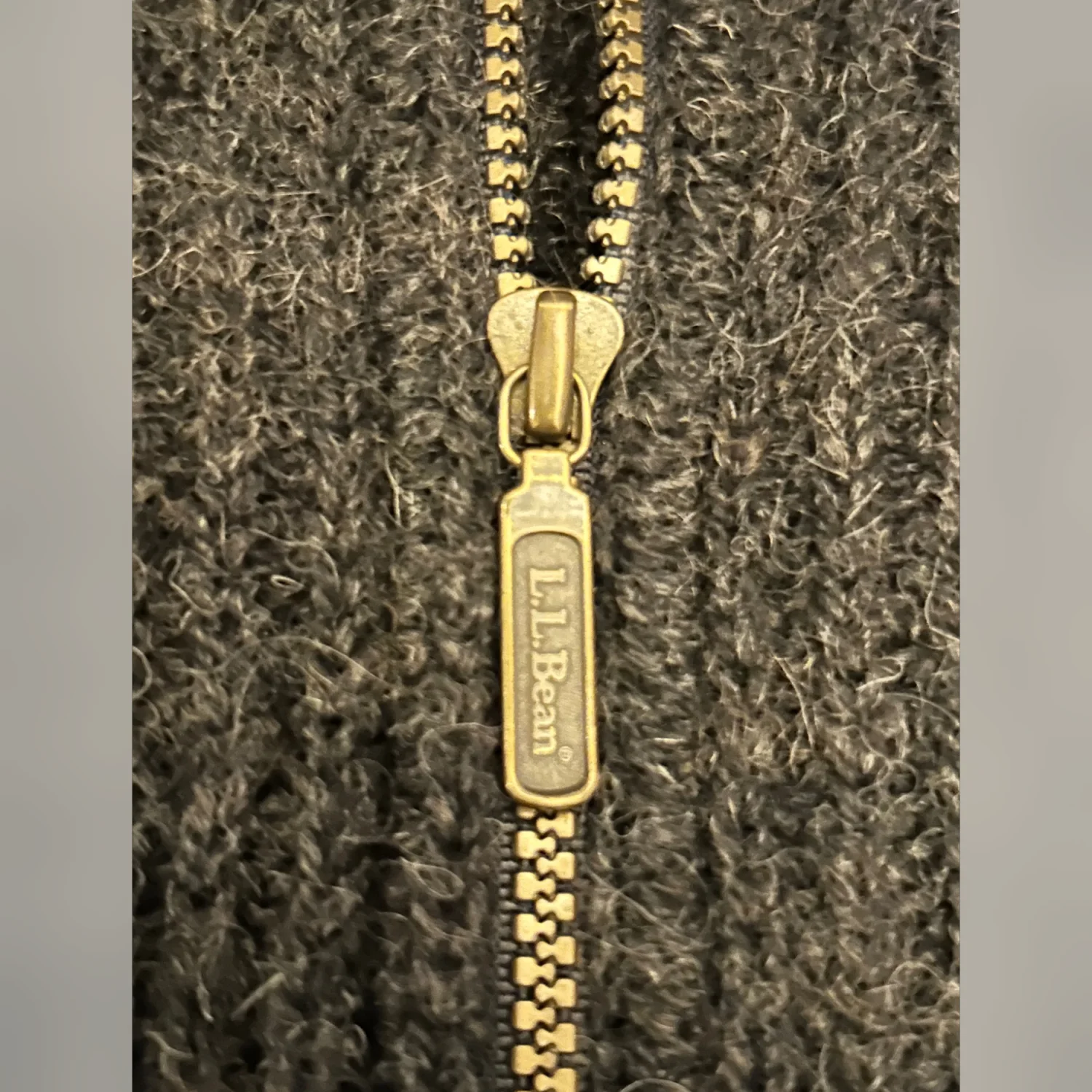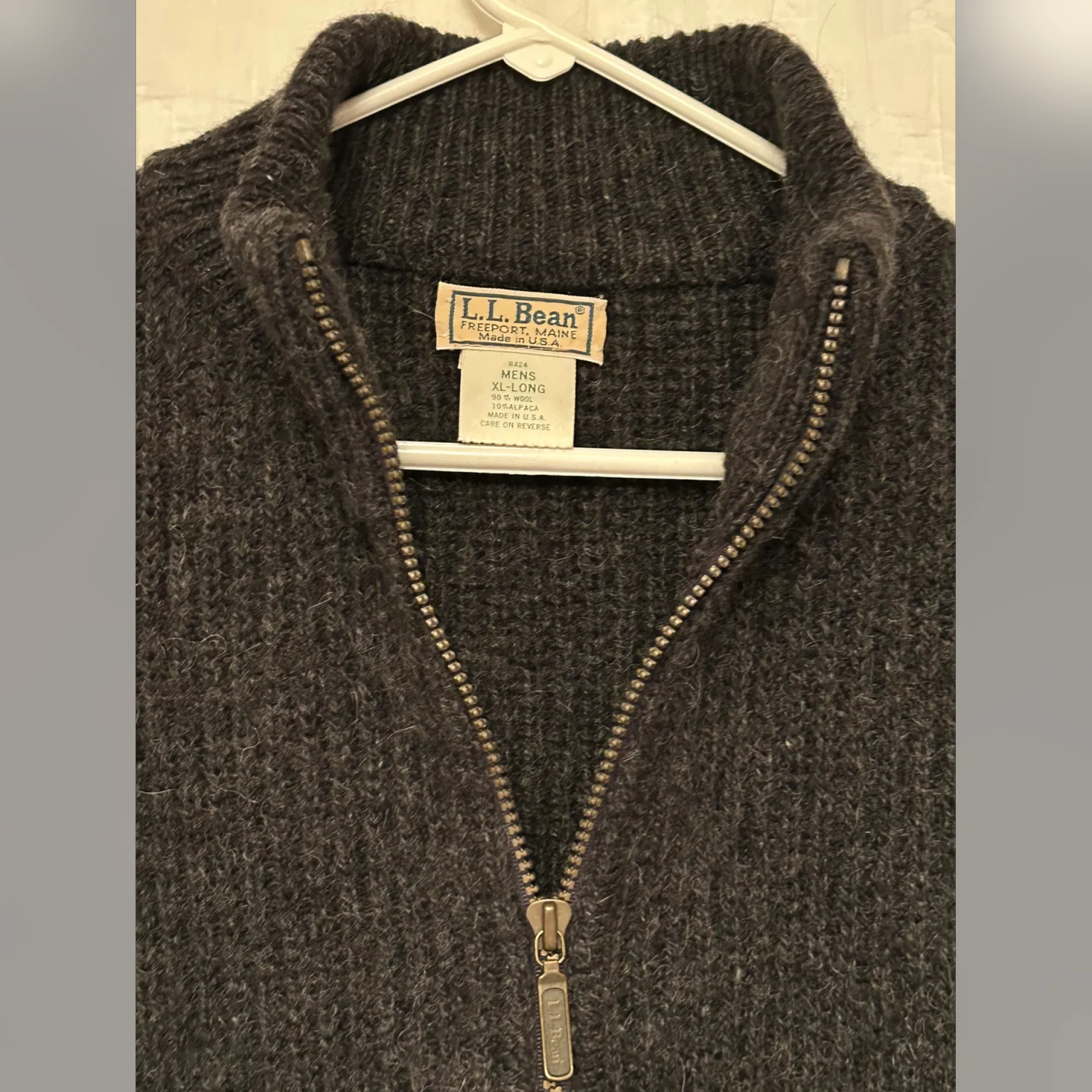 The product is a vintage LL Bean Made in USA wool alpaca full zip ribbed sweater in size XL Long. This solid gray sweater features long sleeves and a full zipper for easy wear. Made of heavyweight wool knit, it is perfect for casual occasions during the winter, fall, and spring seasons. With a classic USA theme and brand accents, this sweater is a stylish and comfortable option for men looking for a high-quality piece of clothing.