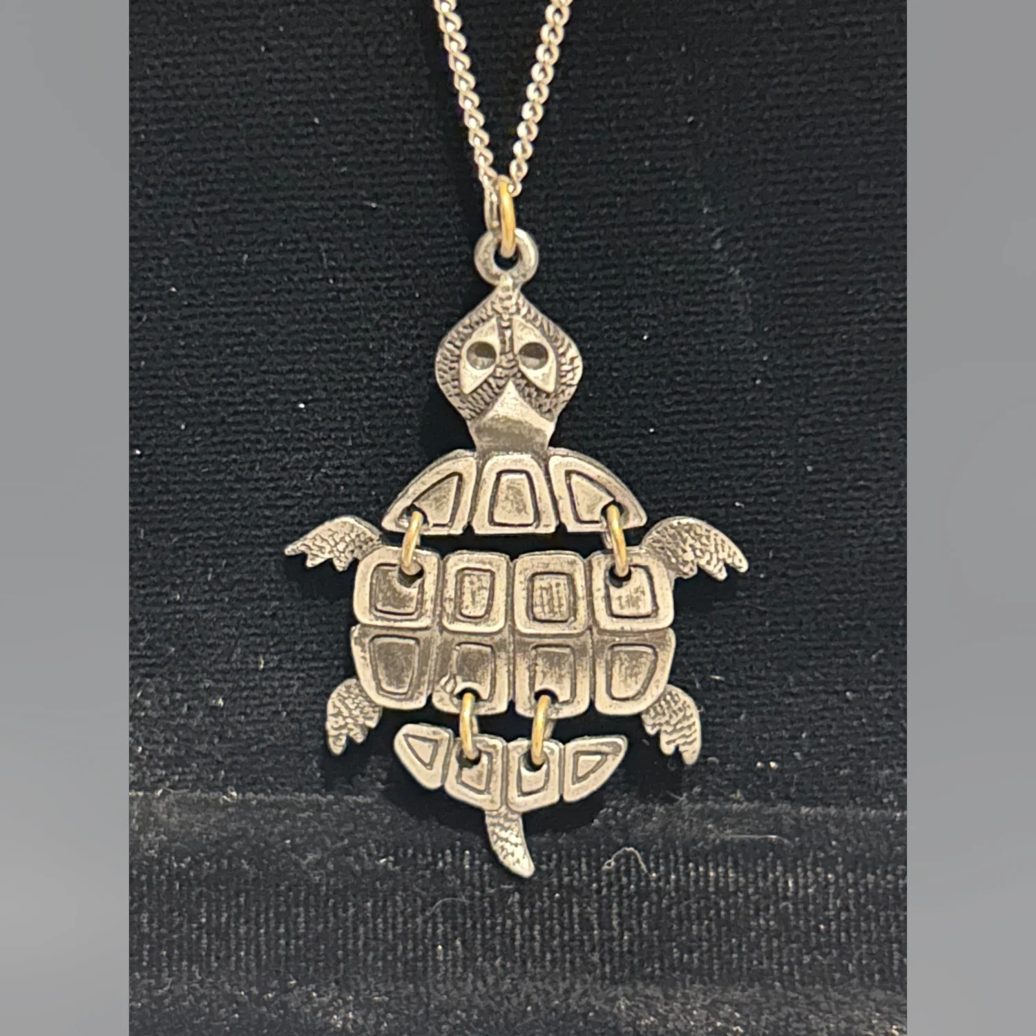 This is a turtle-shaped pendant necklace featuring a detailed design. The pendant appears to be made of metal with a chain attached, showcasing a charming and whimsical style.
