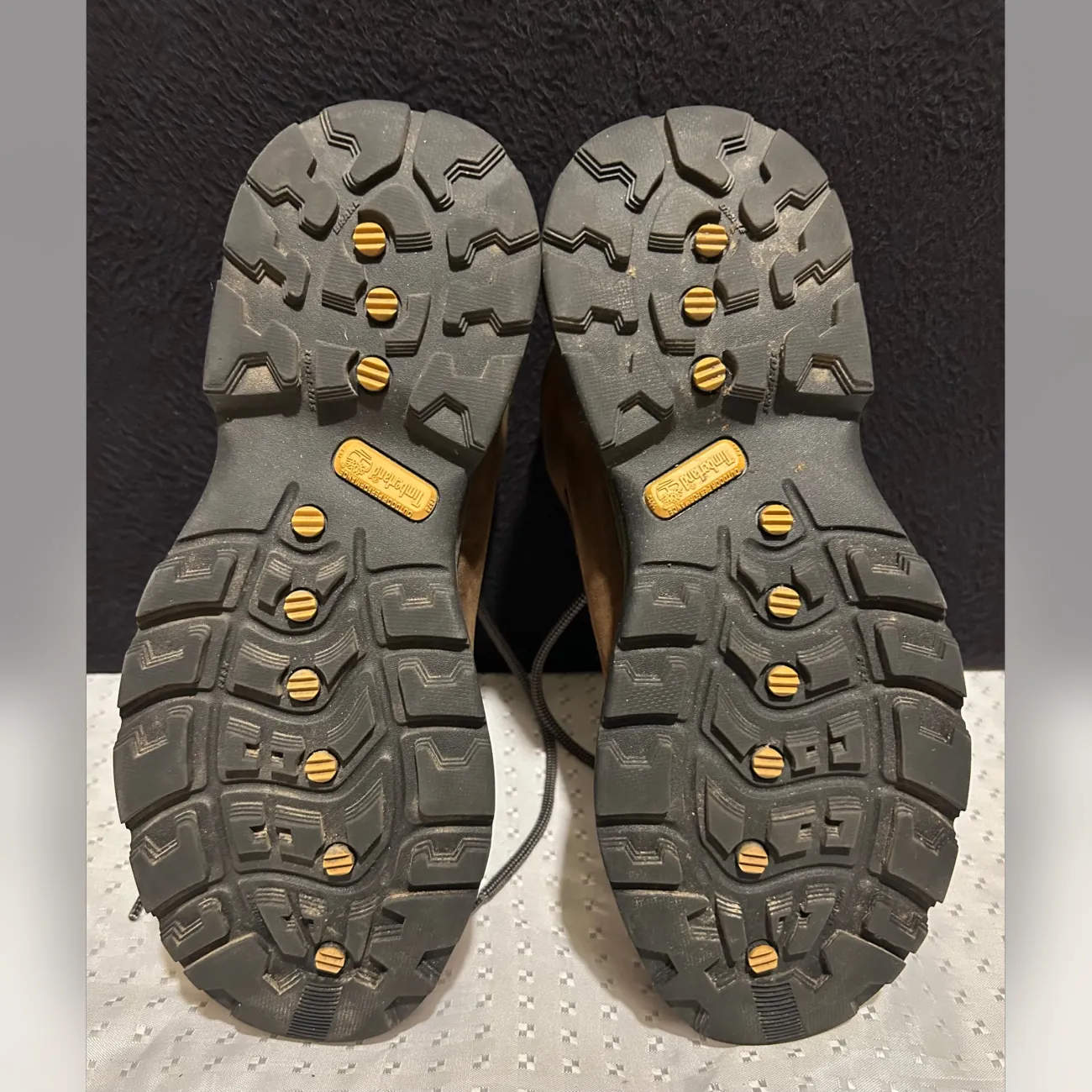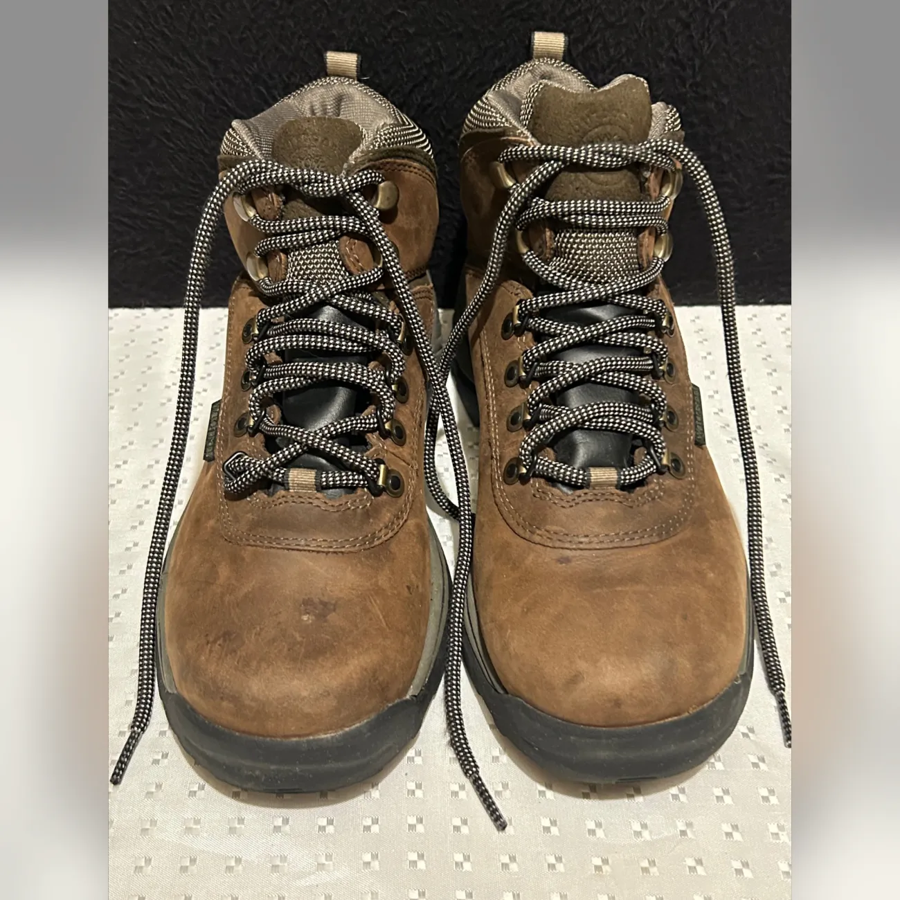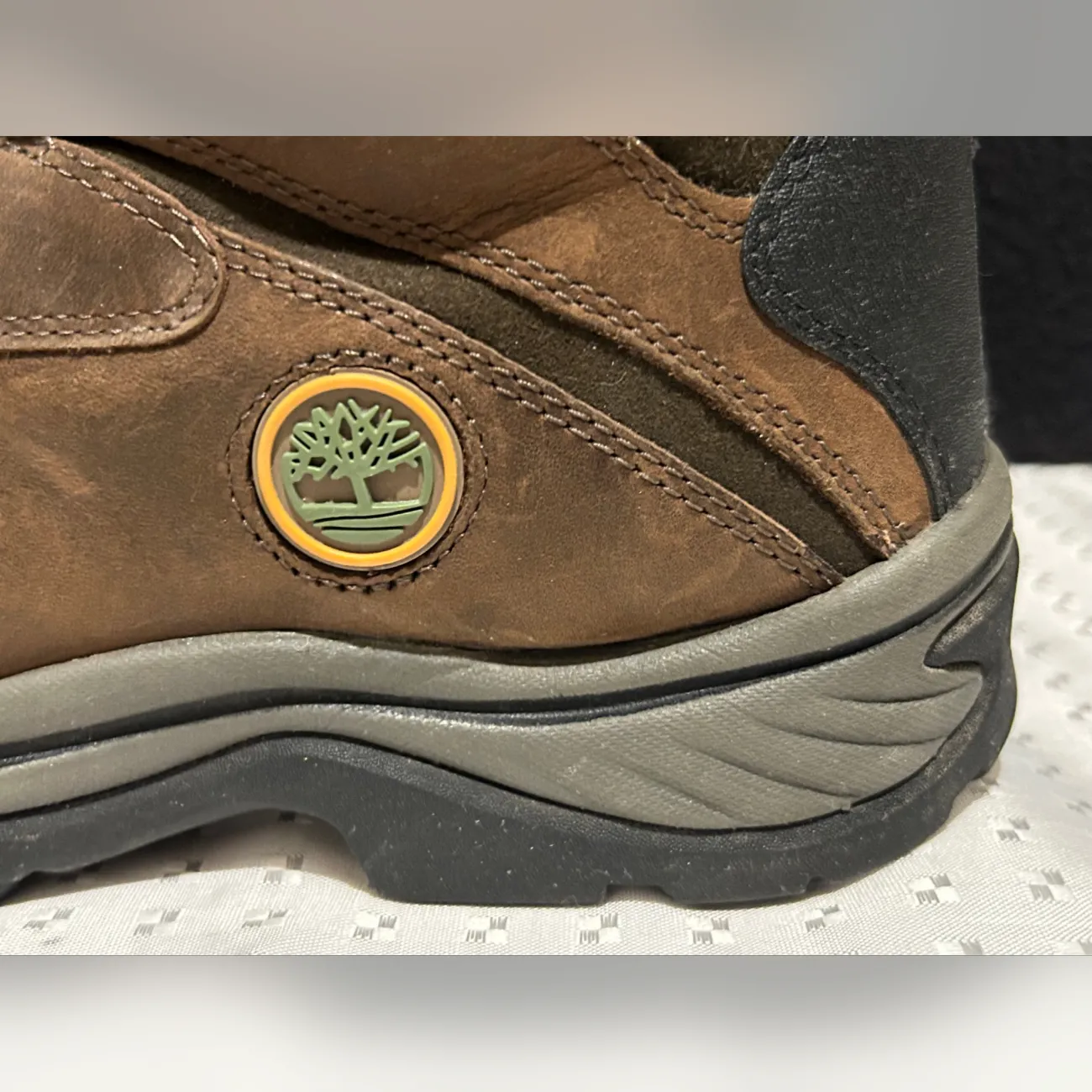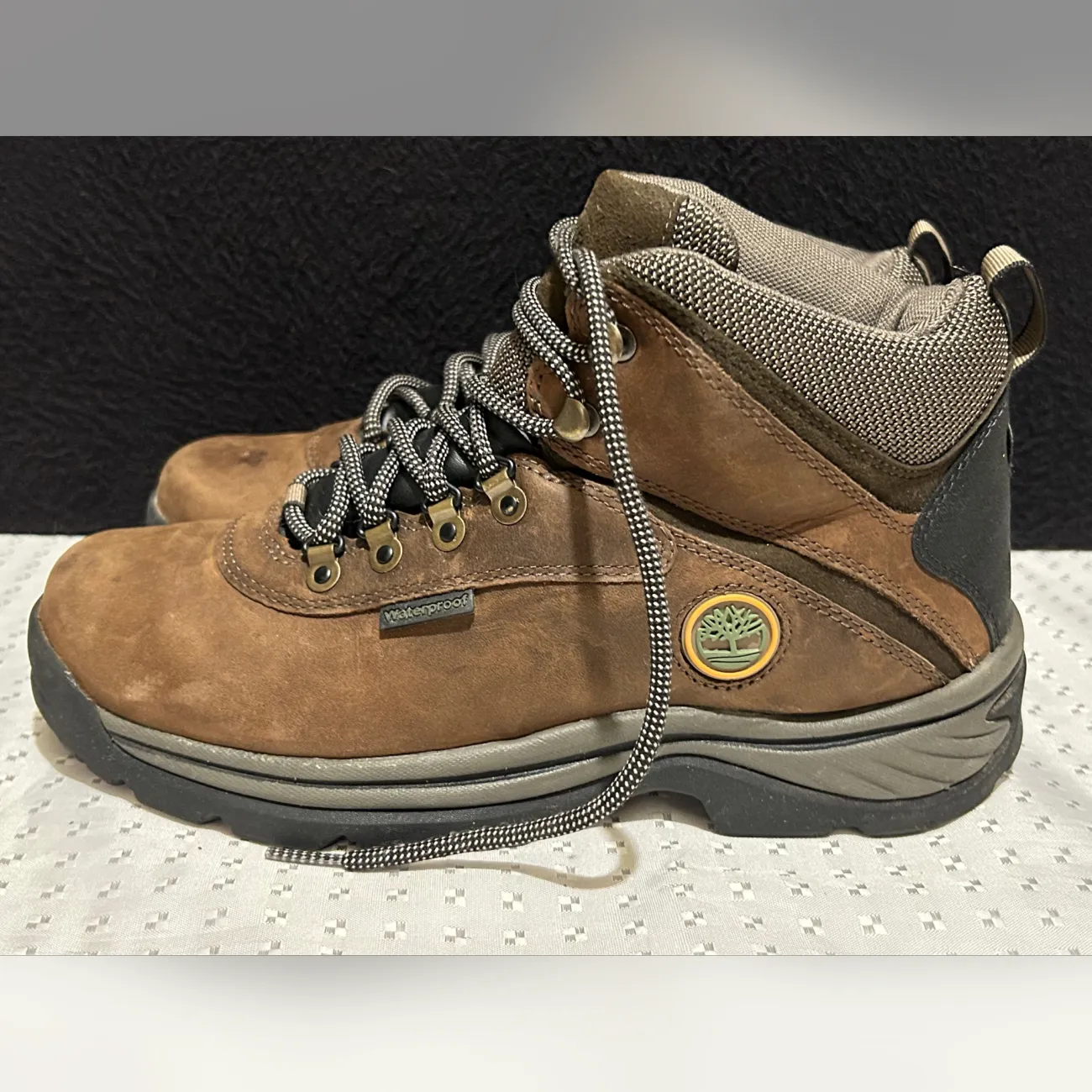 These womans Timberland hiking boots are designed for outdoor adventures, featuring waterproof brown leather and a durable rubber sole. The high-top design offers ankle support, while the padded collar and tongue provide added comfort. Perfect for hiking or everyday wear. #hiking #outdoor #waterproof