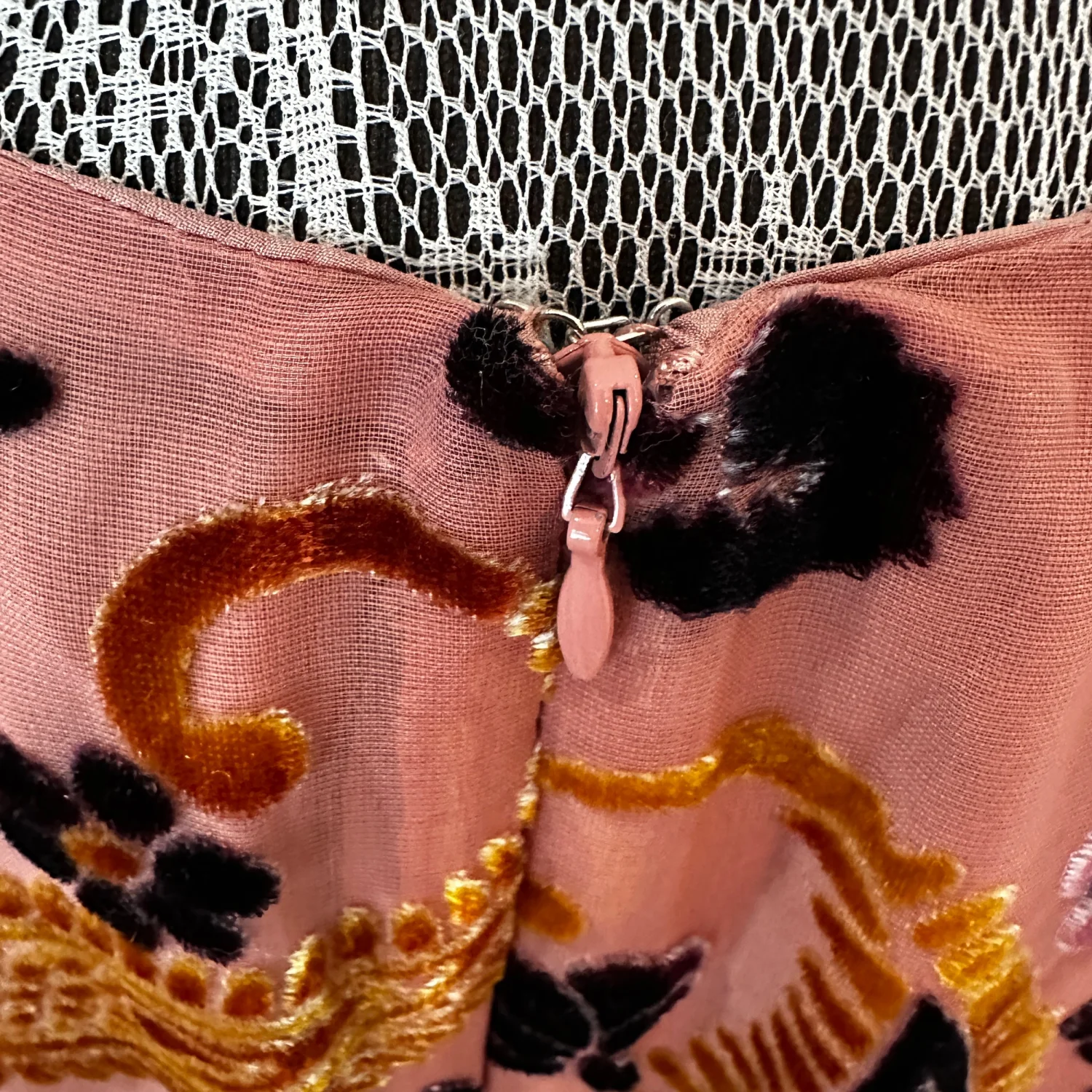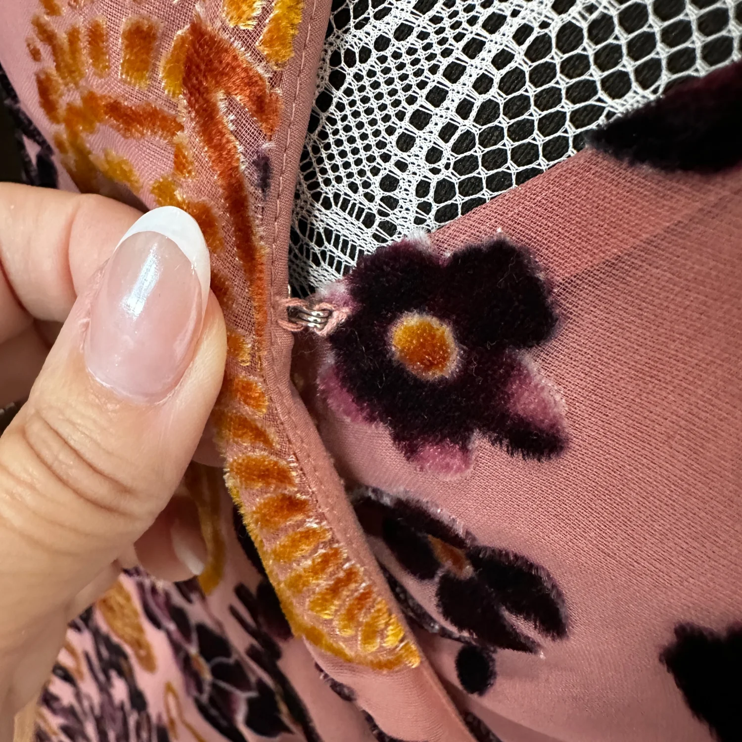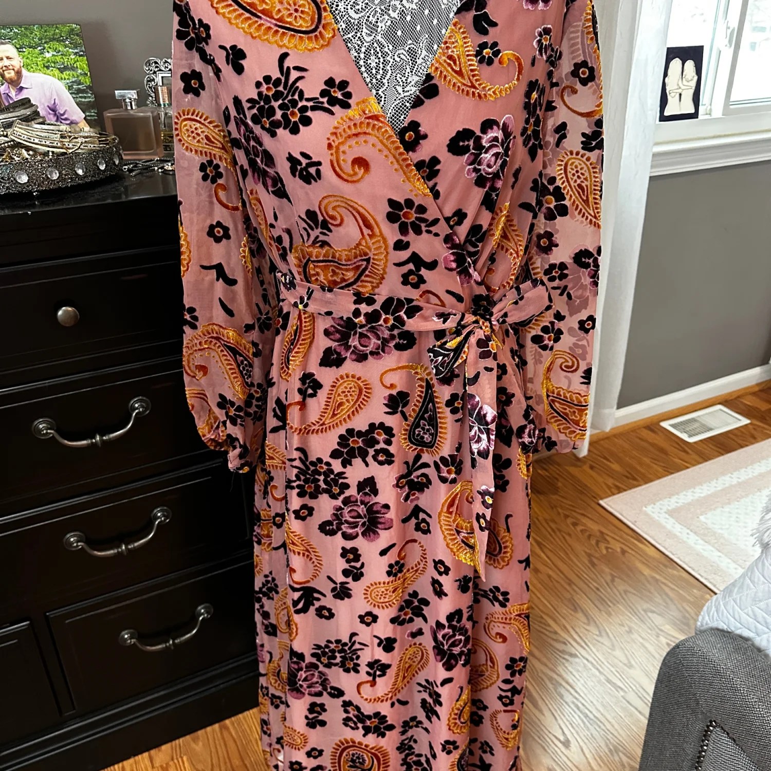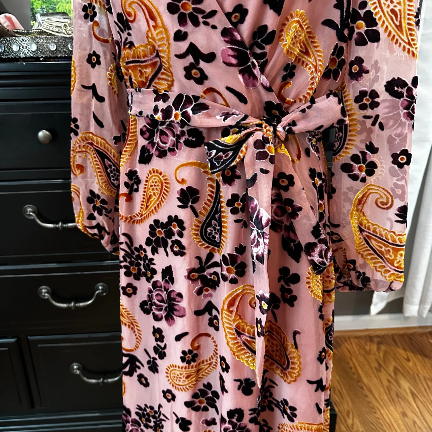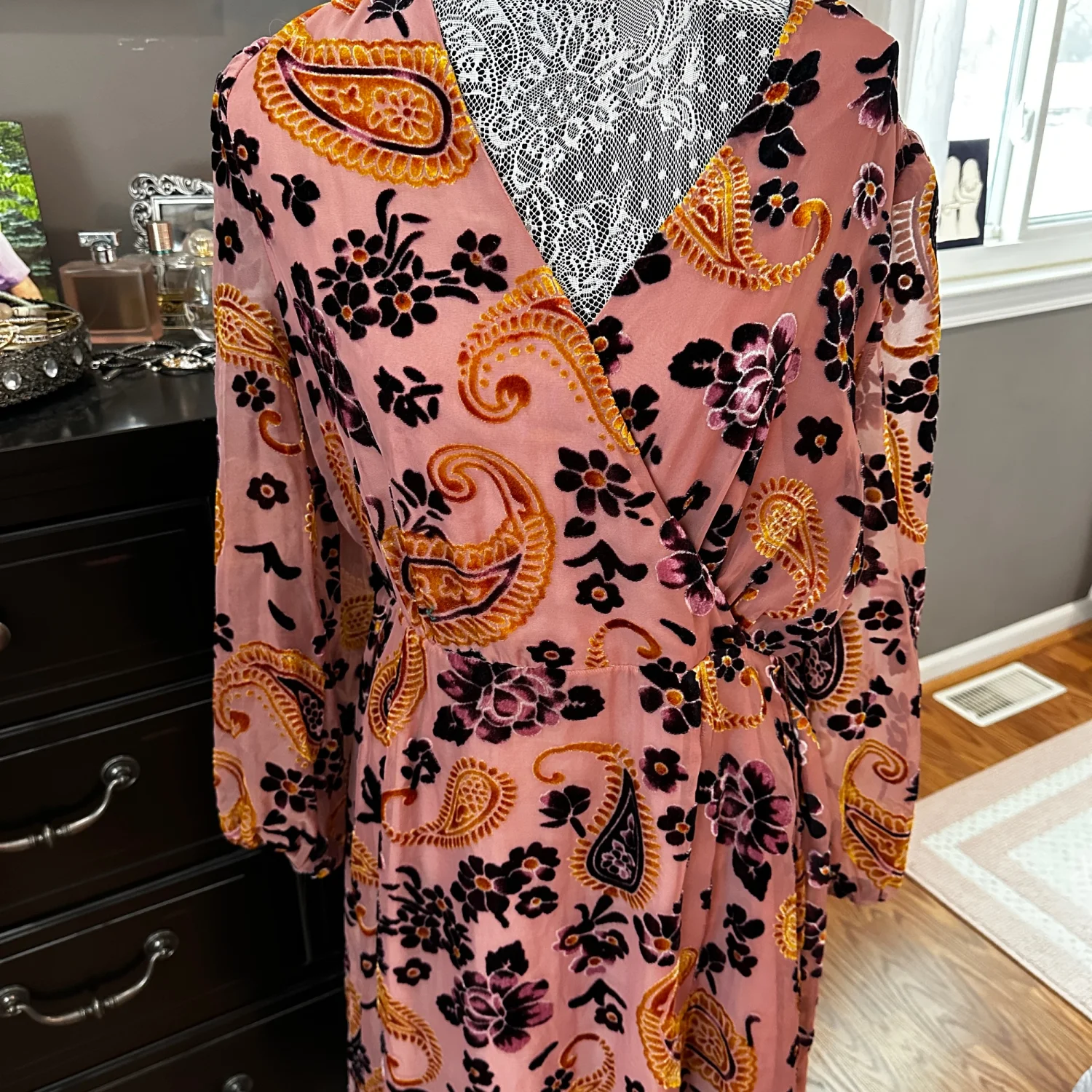Adelyn Rae blush midi dress with luxe velvet burnout florals and paisley print. Flattering wrap-style silhouette with adjustable waist tie, airy long sleeves, and elegant movement. • Size L • Velvet burnout chiffon • Wrap / faux wrap style • Long sleeves • Back zipper • Midi length • Bust: 18.5” • Waist: 16” • Length: 56.5”