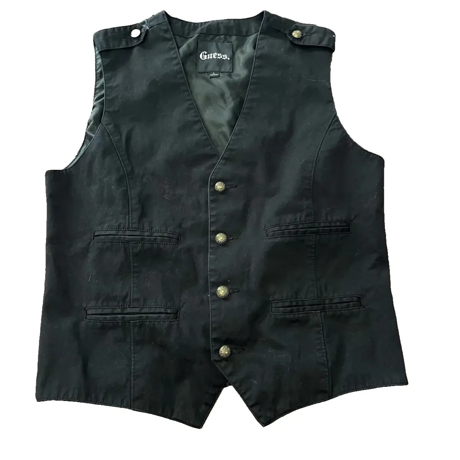 Vintage Guess Black Cotton Vest Gold Buttons Epaulettes 90s Y2K Grunge Large