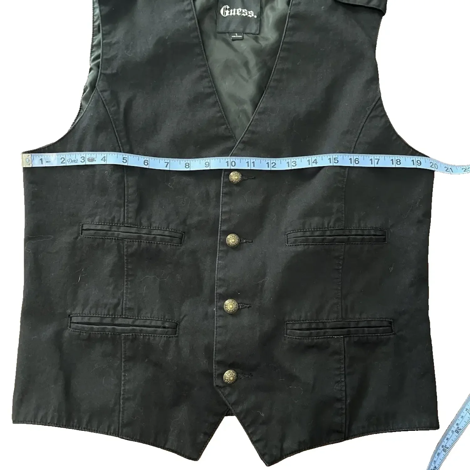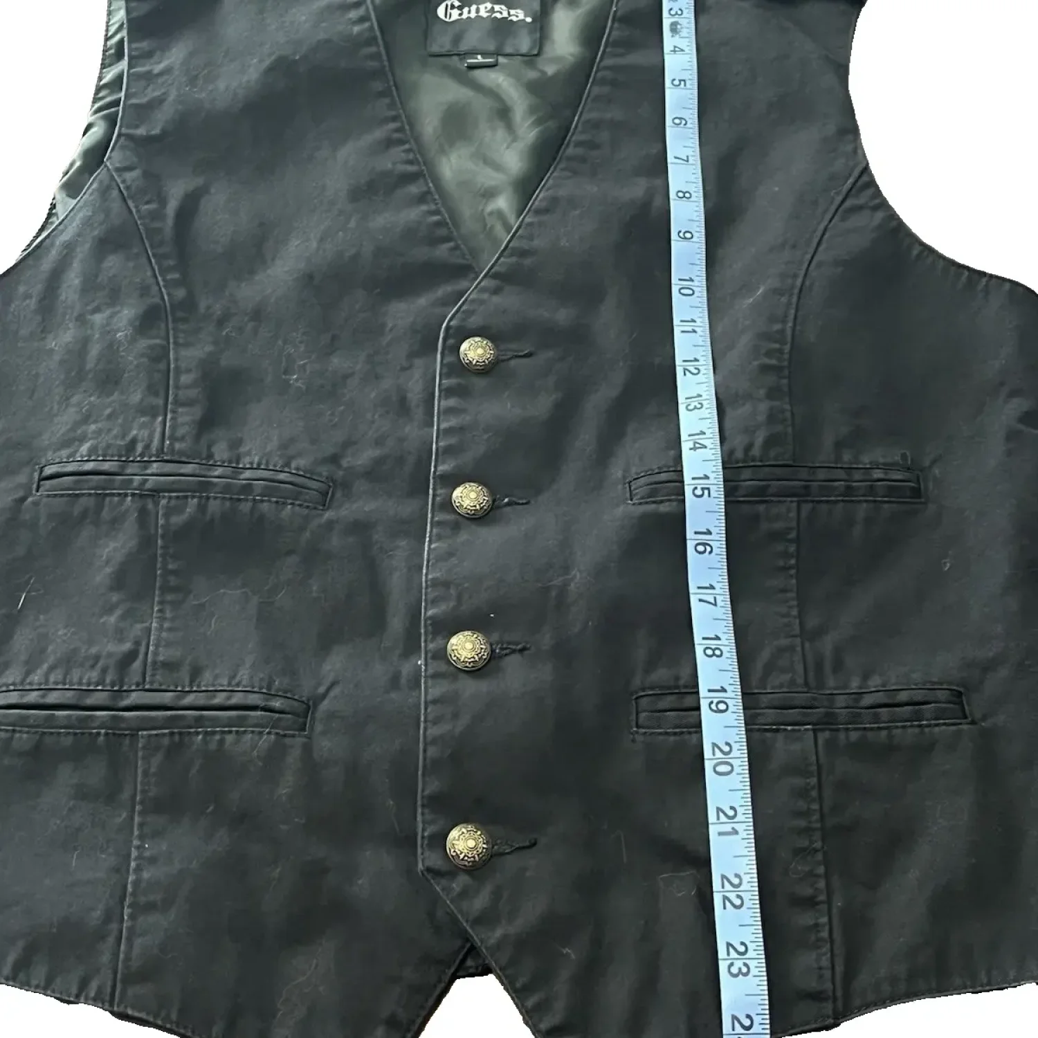 This Guess Vintage Black Military Style vest features a stylish button closure and multiple front pockets. Made from durable material, it includes shoulder epaulettes for an added touch of style. Ideal for layering over casual shirts. Care instructions: machine wash cold, gentle cycle. This vest is perfect for a casual yet sophisticated look. #Guess #VintageVest #BlackVest