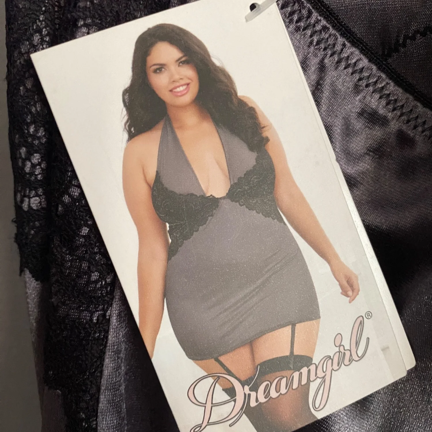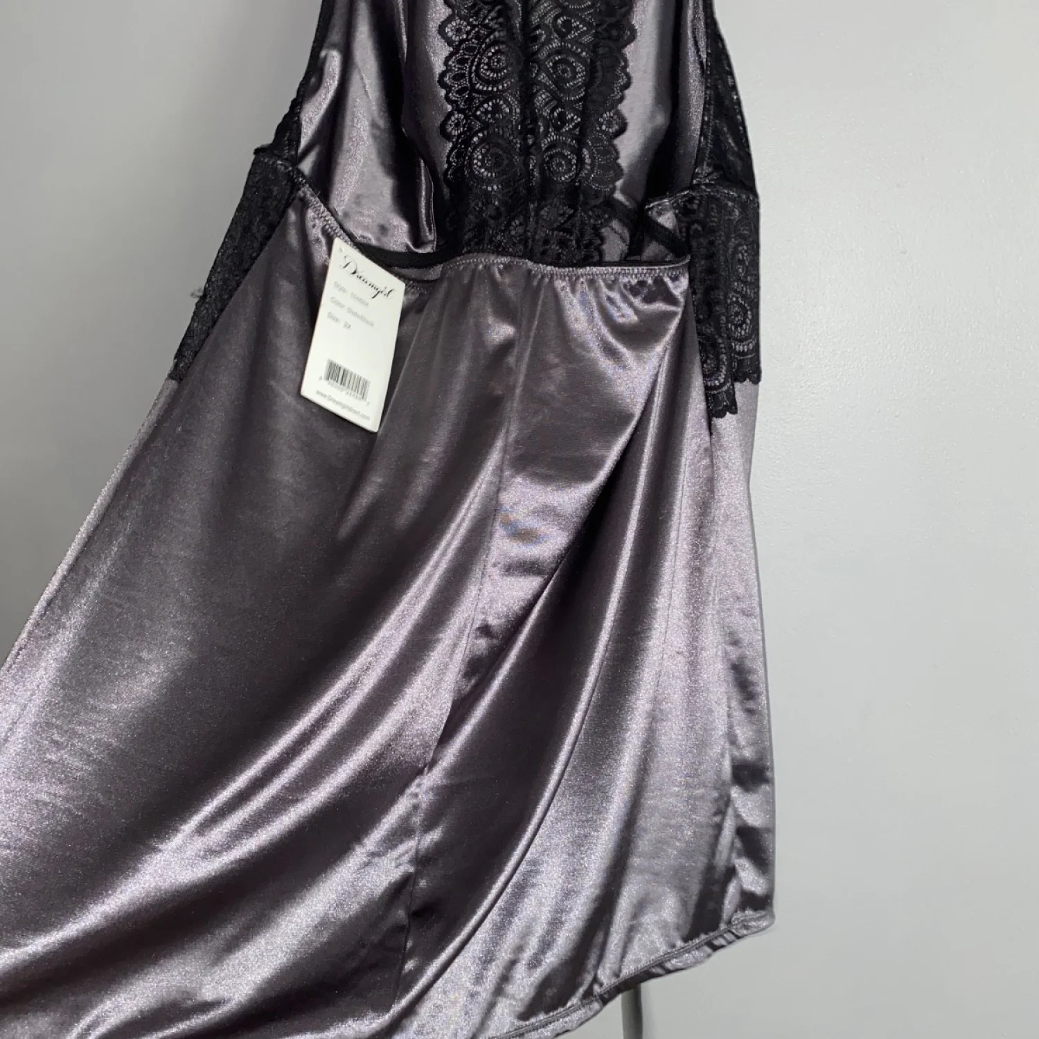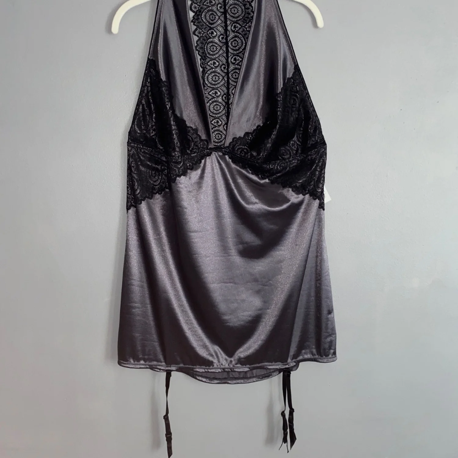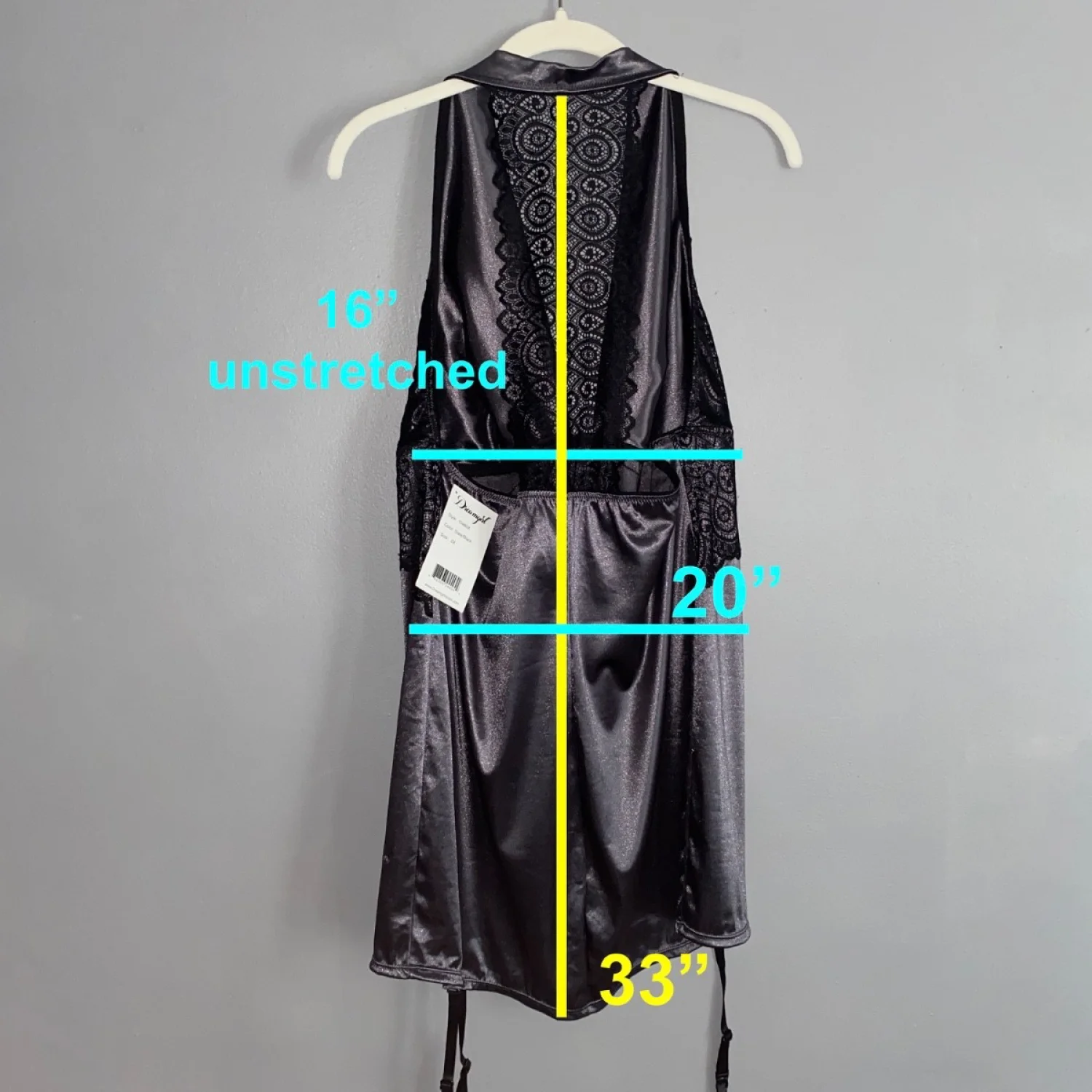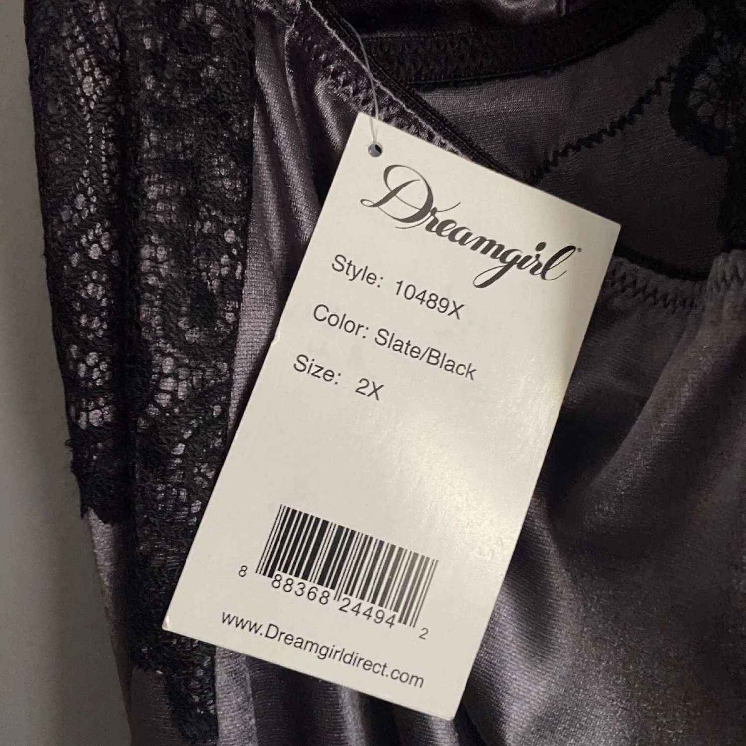 2X DREAMGIRL Black/Slate T-Back Lace Satin Garter Slip Lingerie