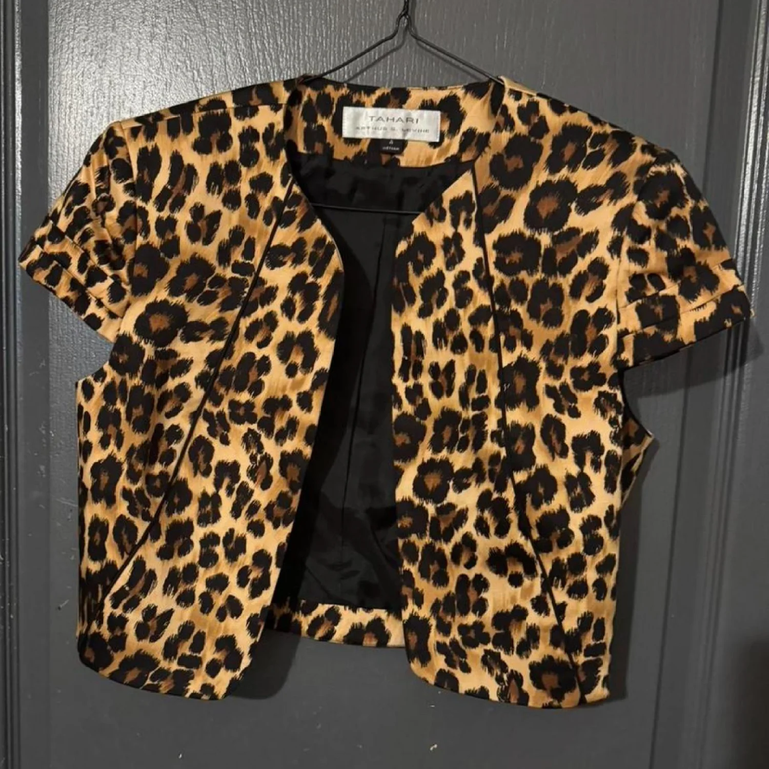 This striking animal print blazer jacket by Tahari features short sleeves and an open front, making it a stylish addition to any wardrobe. With its bold leopard pattern, it adds a touch of wild sophistication to your look. This piece is fully lined and tailored to enhance the silhouette. Perfect for both casual and formal occasions. #AnimalPrint #Blazer #Tahari