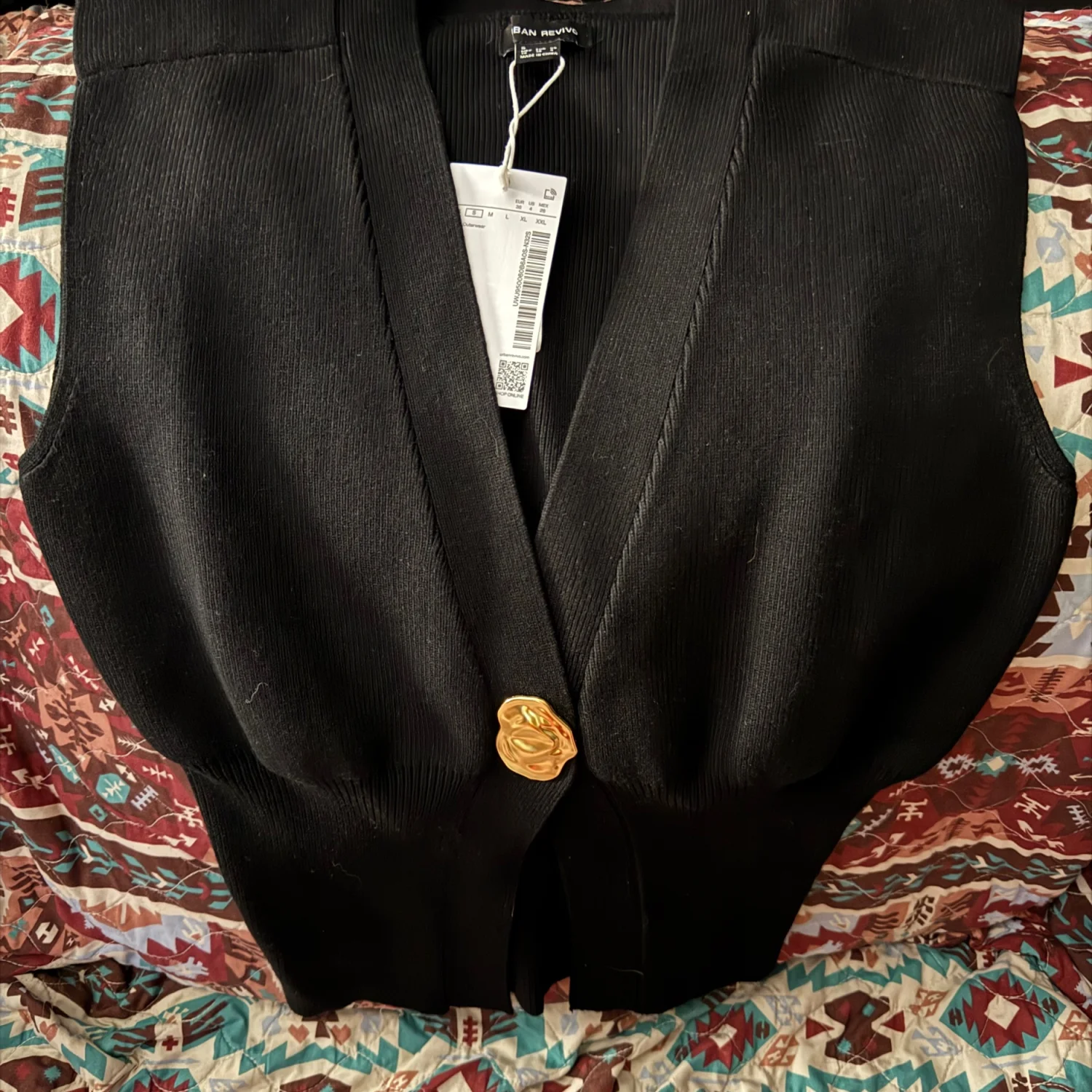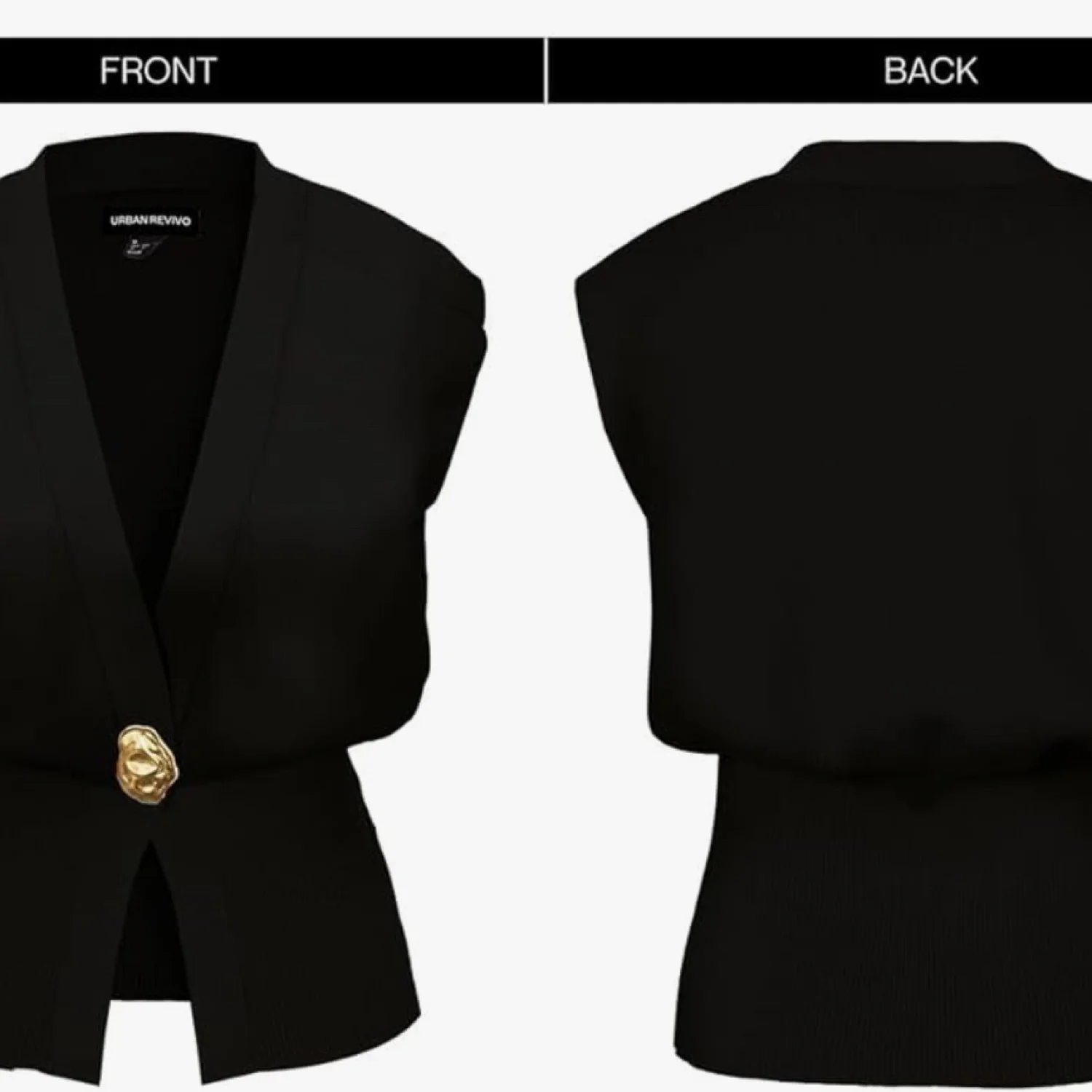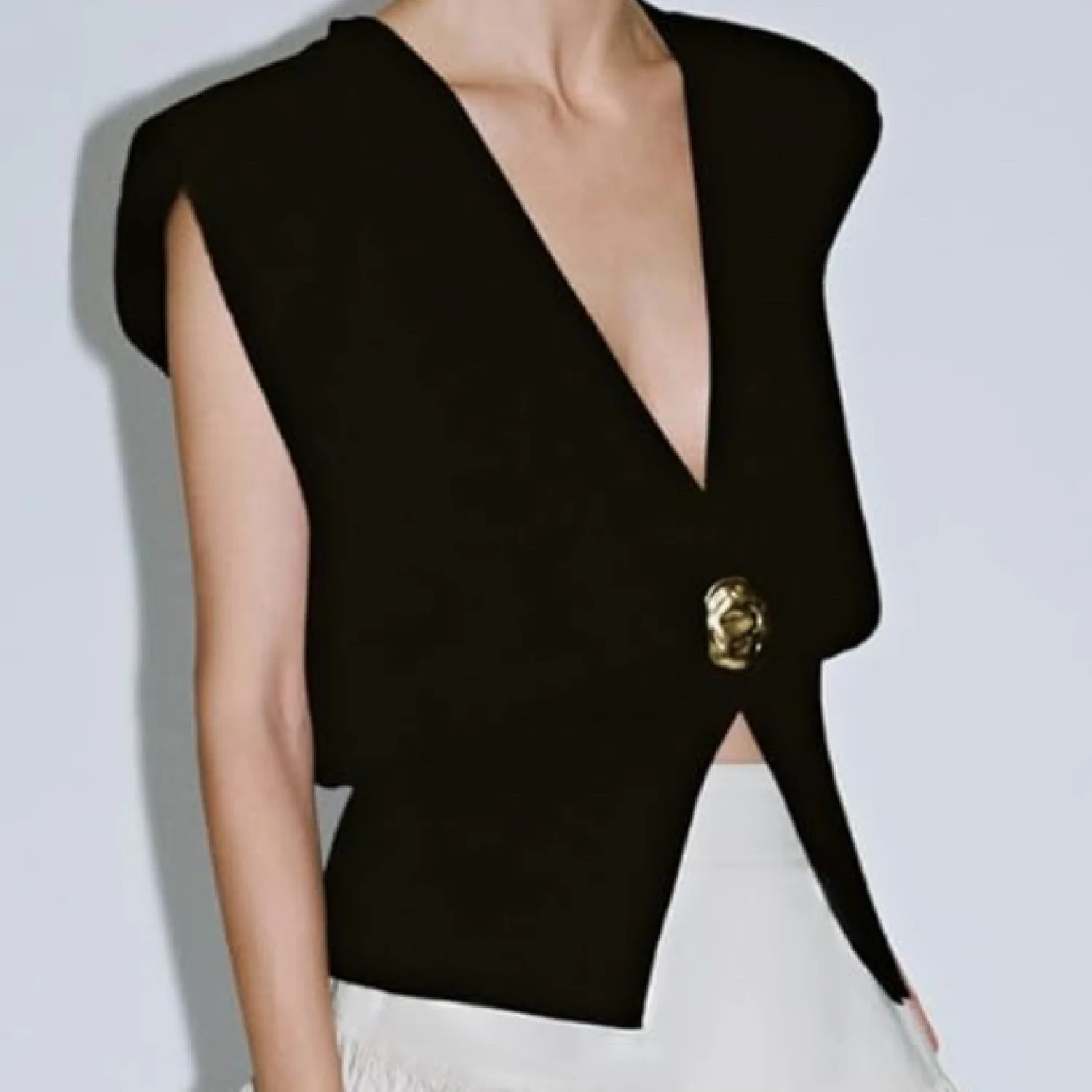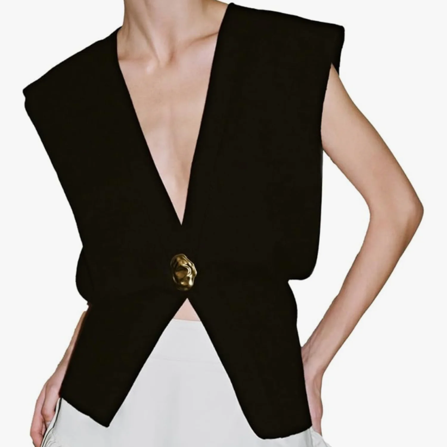 This sleeveless cardigan vest features a deep V-neckline and a stylish gold button closure, providing a chic and contemporary look. Made with ribbed material, this piece offers both comfort and elegance. Perfect for layering or wearing alone for a bold statement. #sleeveless #cardigan #fashion