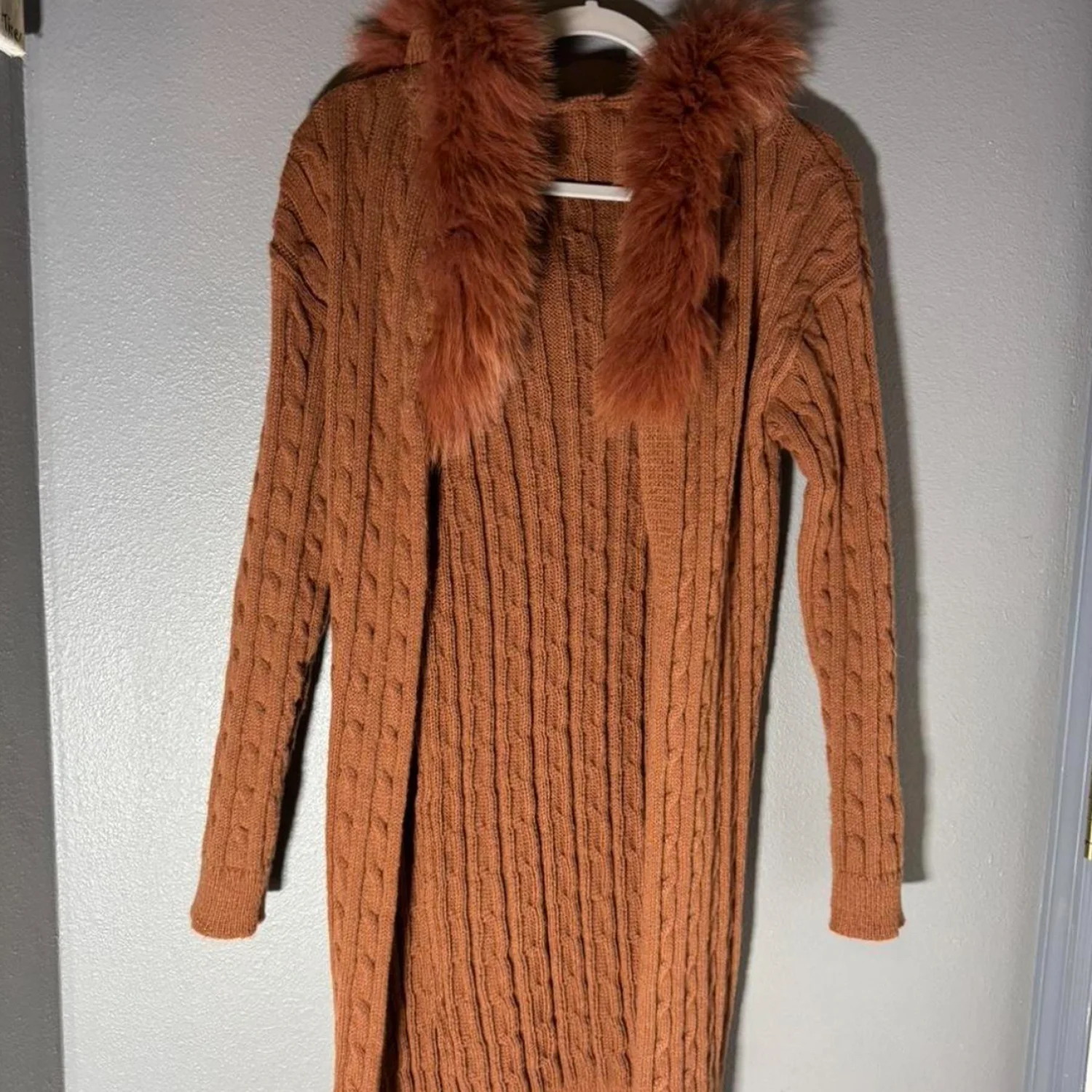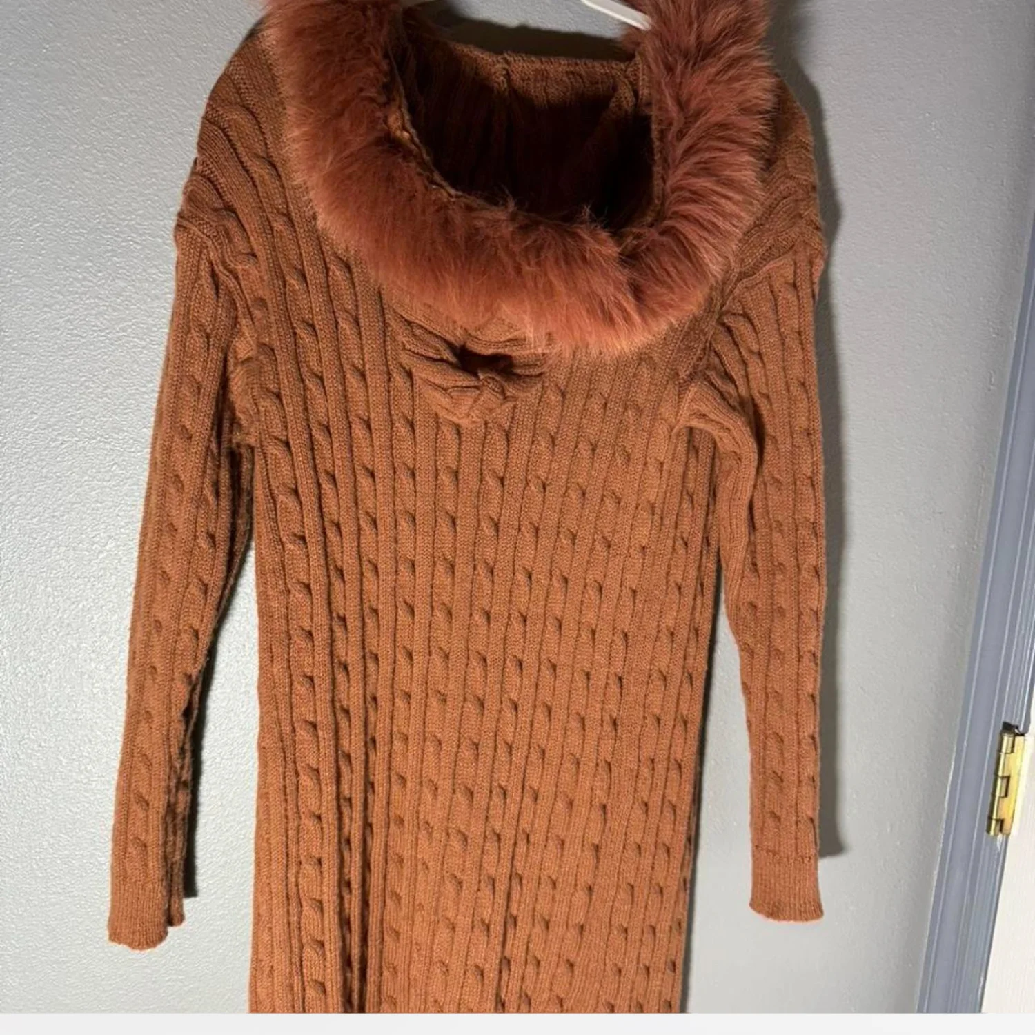 This warm brown knit sweater features an elegant cable-knit pattern and is adorned with a luxurious faux fur trim along the collar. Perfect for adding a touch of sophistication to your winter wardrobe. Ideal for casual outings or cozy days indoors. #cozyfashion #winterwear