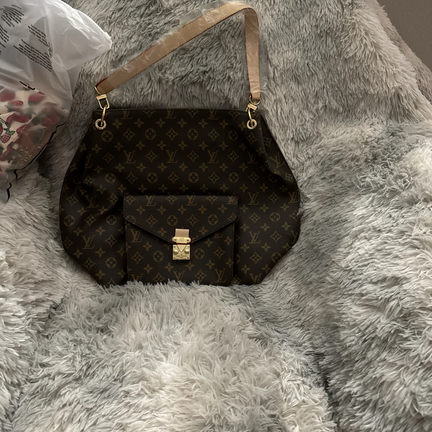 Stylish brown shoulder bag featuring a classic monogram design, gold-toned hardware, and a secure front clasp. Perfect for everyday use or special occasions. Includes a single adjustable strap for convenience. #luxury #monogram