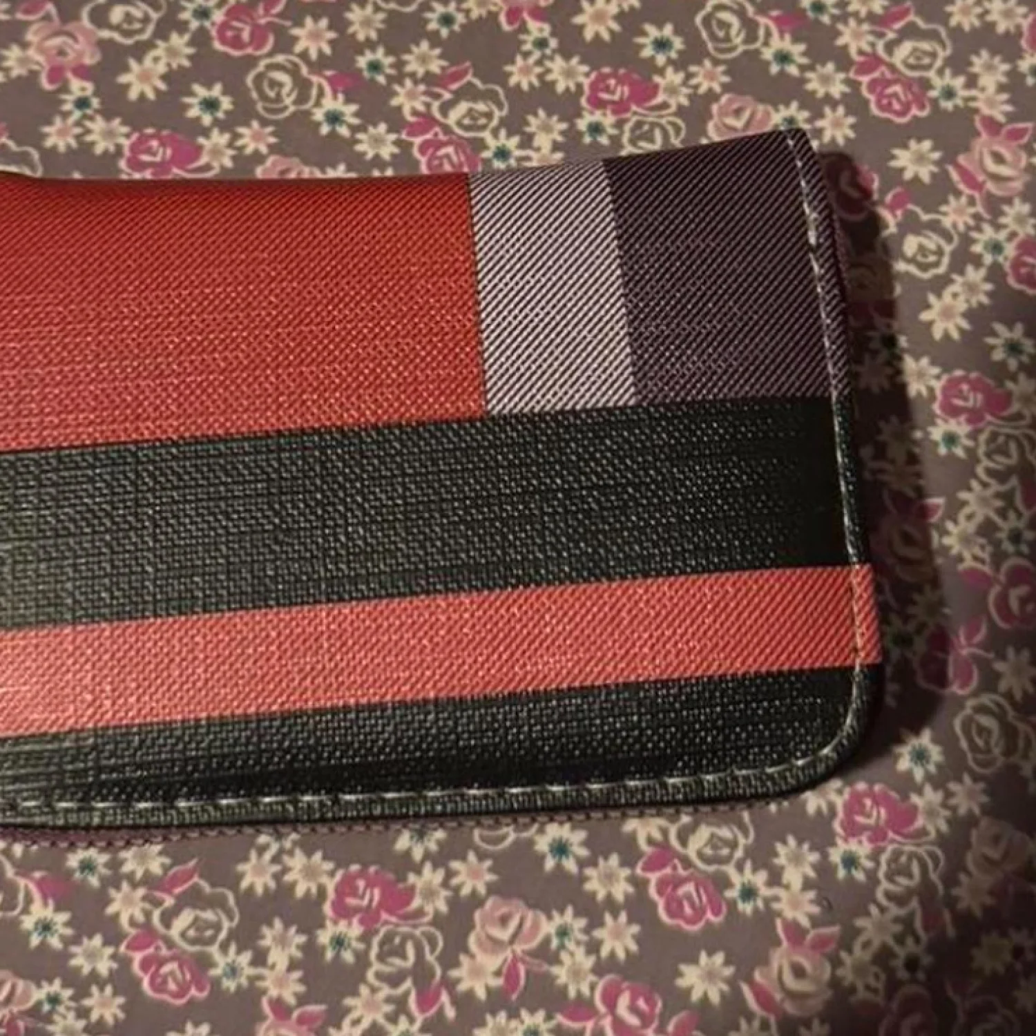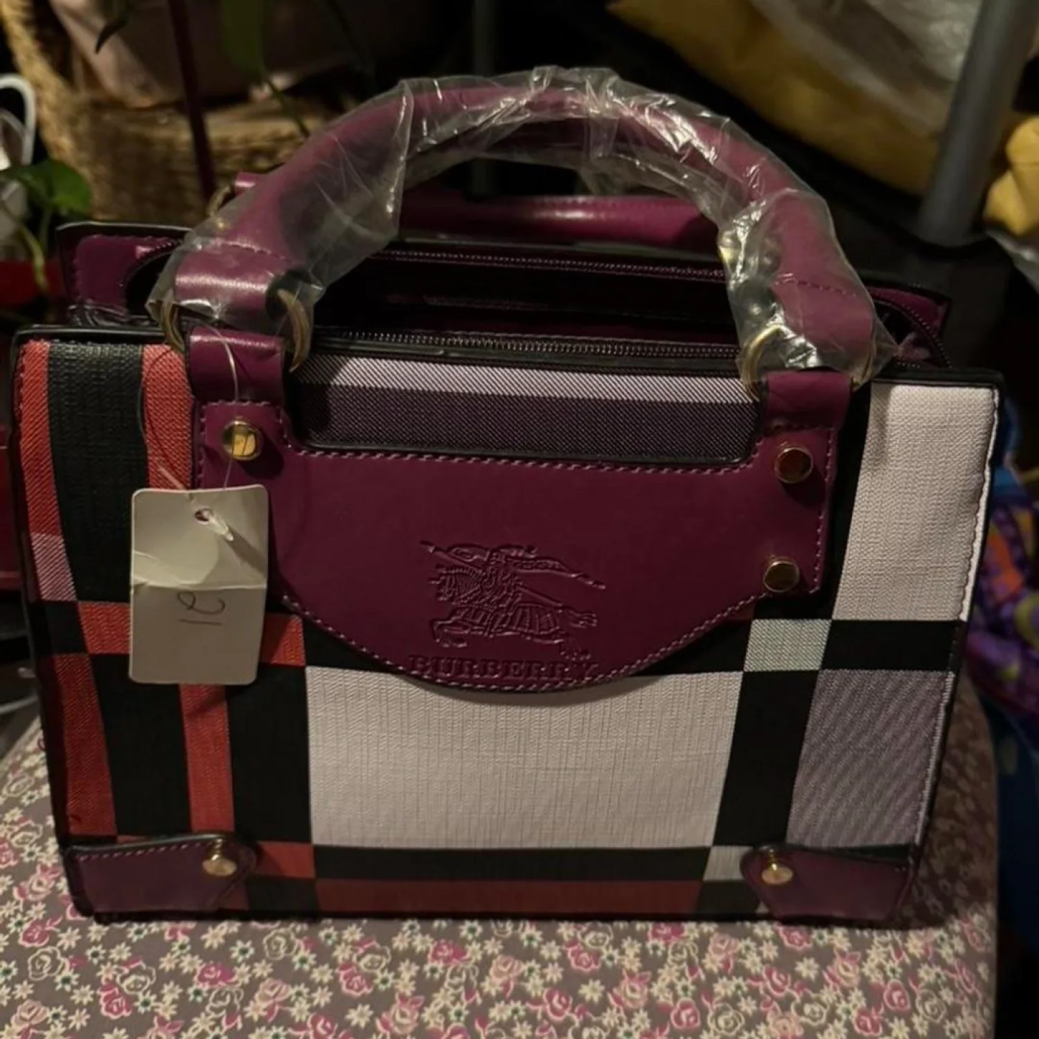Stylish handbag and wallet set featuring a vibrant checkered pattern with shades of purple, red, and black. The handbag has reinforced handles and metal accents for durability, while the wallet complements with the same checkered design. Ideal for a chic, coordinated look. #handbagset #checkered #fashionaccessory