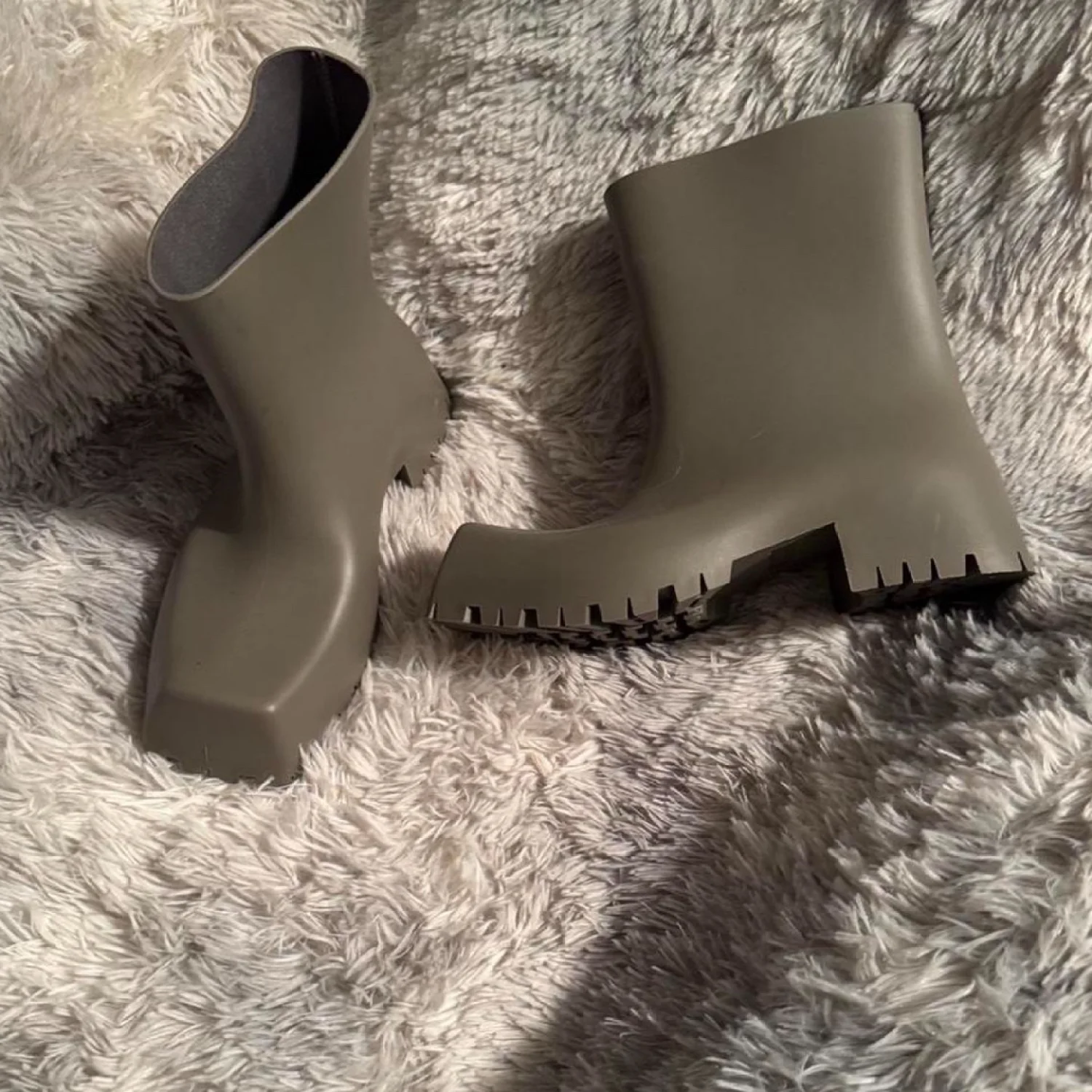 Stylish chunky rubber ankle boots in a sleek grey color. These boots feature a modern, minimalistic square toe design with a robust treaded sole for improved grip. Perfect for rainy days or making a fashion statement. Unbranded but appears high-quality and suitable for any casual or outdoor ensemble. #rubberboots #fashion #outdoor