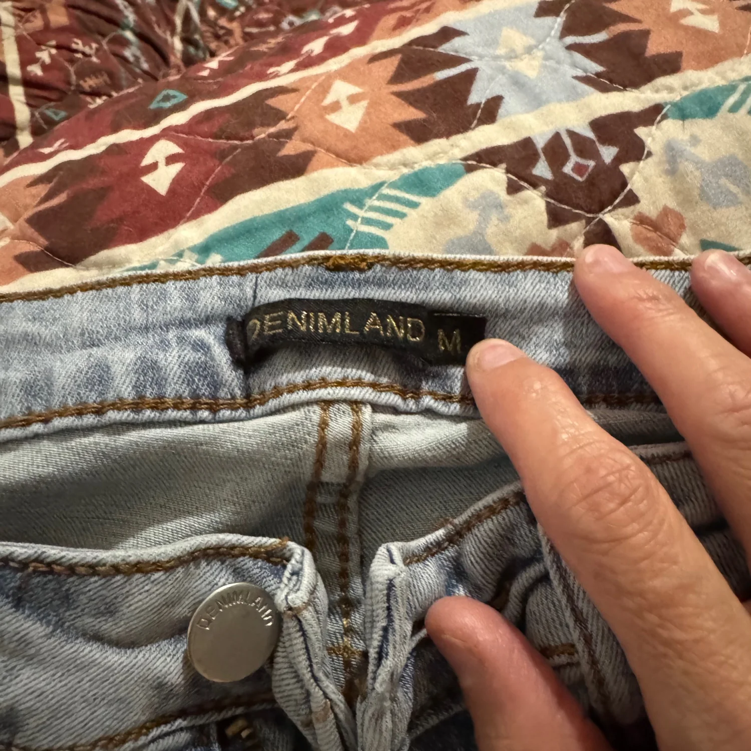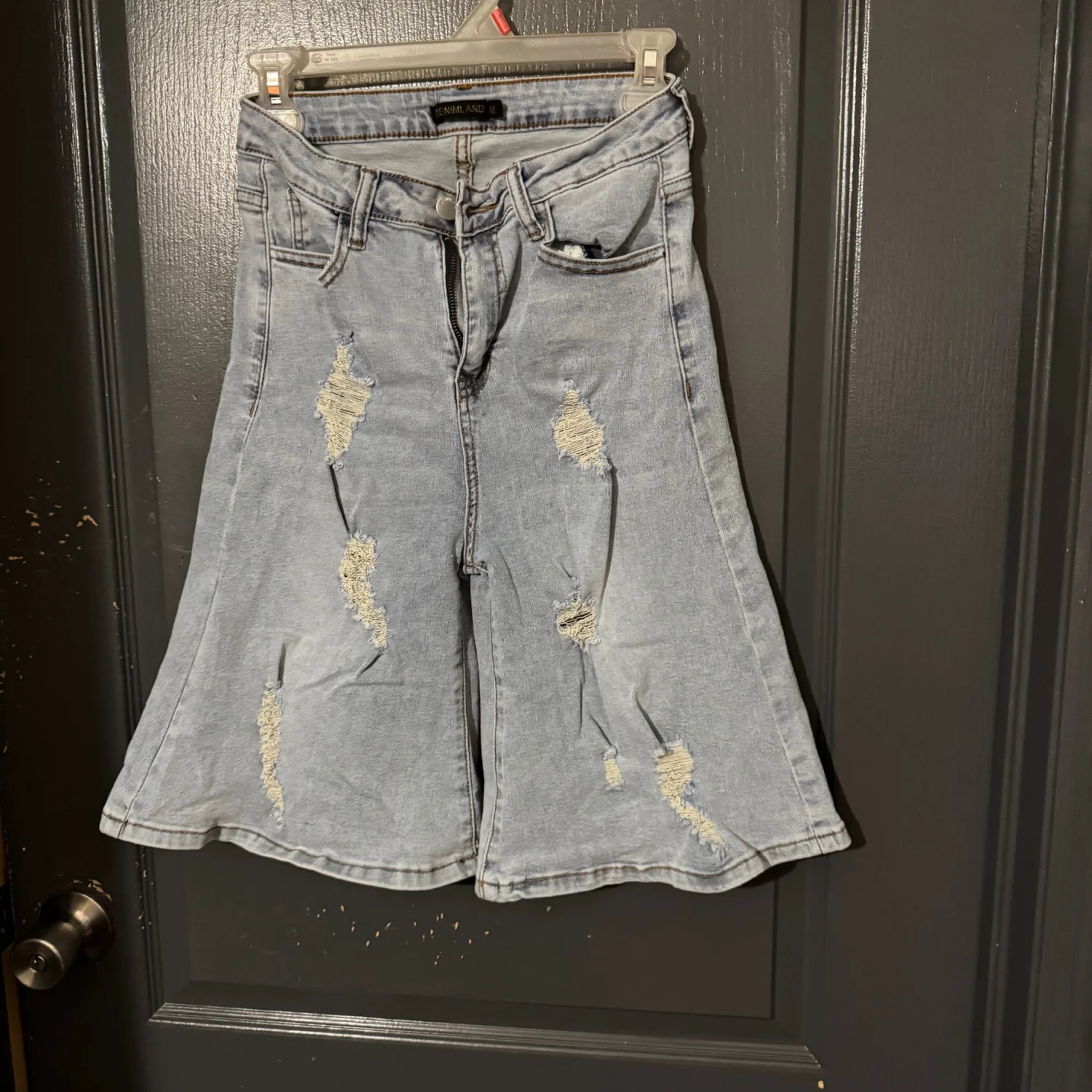 Light blue denim culotte shorts by Denimland, featuring a flared leg and distressed detailing. These shorts offer a stylish and trendy look with a comfortable fit. Perfect for a casual day out. #denim #distressed #culottes