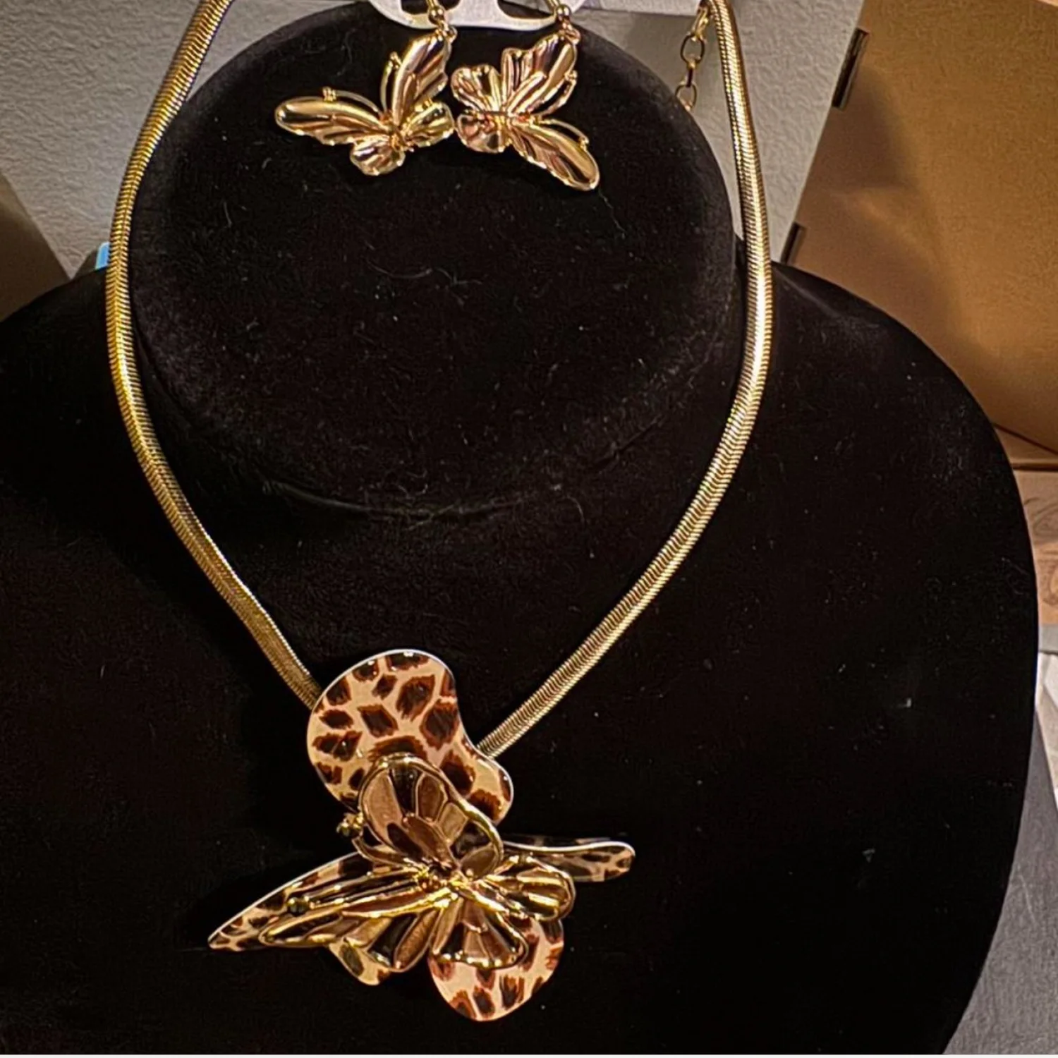 Elegant gold butterfly jewelry set featuring a statement necklace with leopard print accents and a matching pair of butterfly earrings. Perfect for adding a bold, nature-inspired touch to any outfit. Ideal for special occasions.
