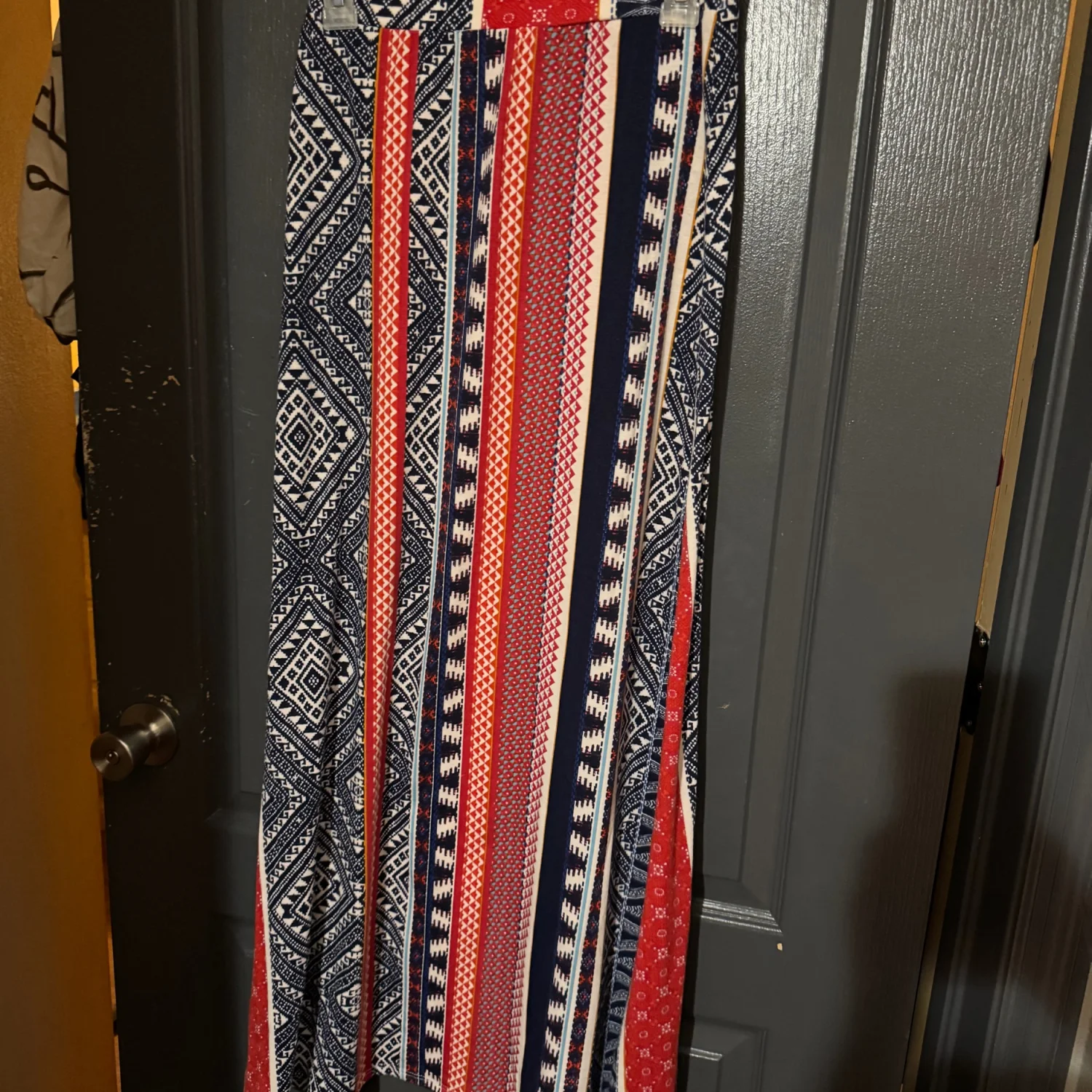 This vibrant maxi skirt by Lily Star features a mix of geometric patterns and bold vertical stripes in red, white, and blue. Made from lightweight fabric, this skirt is perfect for a bohemian look or summer outings. The label indicates a size Small. #boho #geometric #maxiskirt