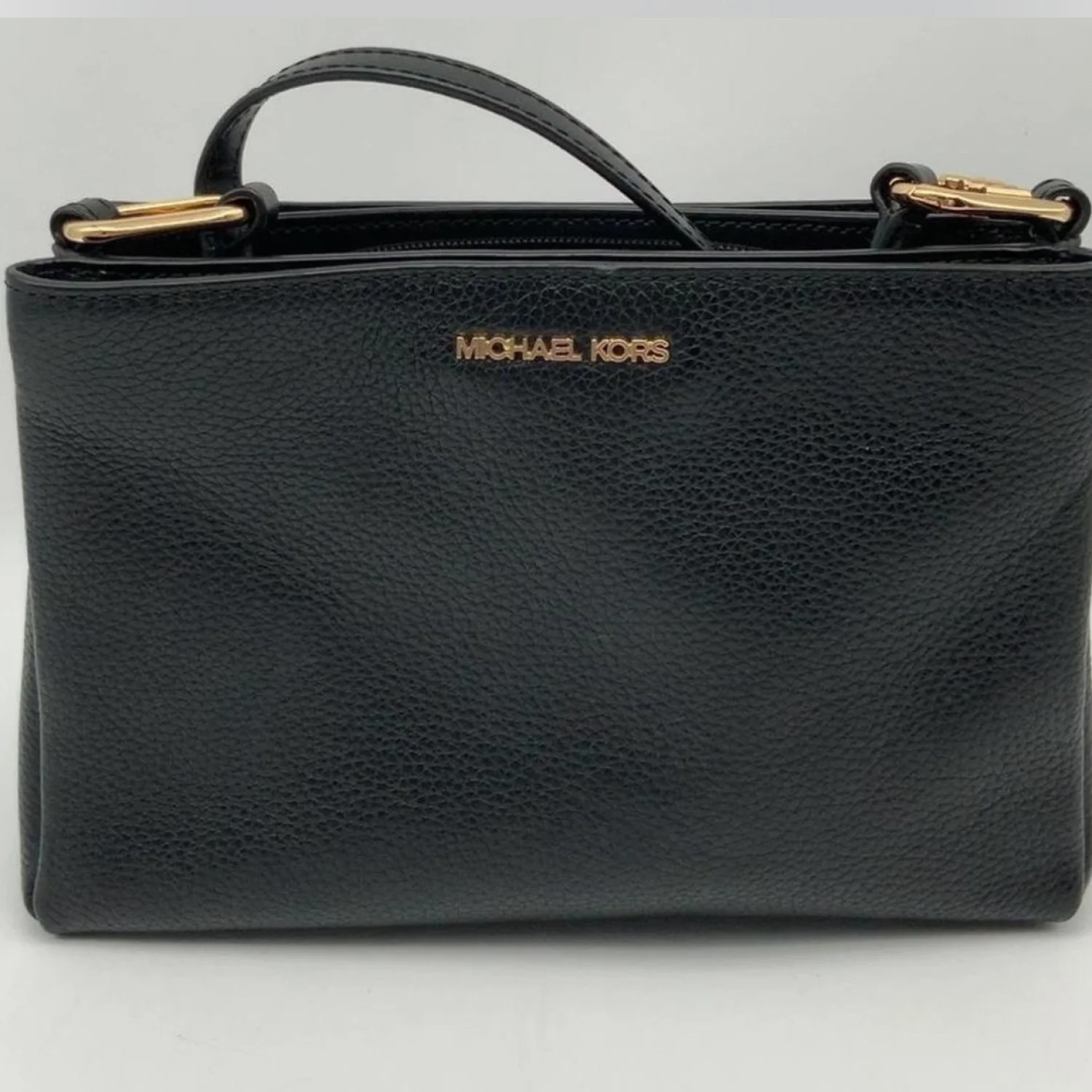 Elegant Michael Kors handbag in textured black leather. Features gold-tone hardware and the iconic brand logo on the front. Perfect for versatile styling, suitable for both casual and formal occasions. Ideal for everyday use. #MichaelKors #Luxury #Handbag