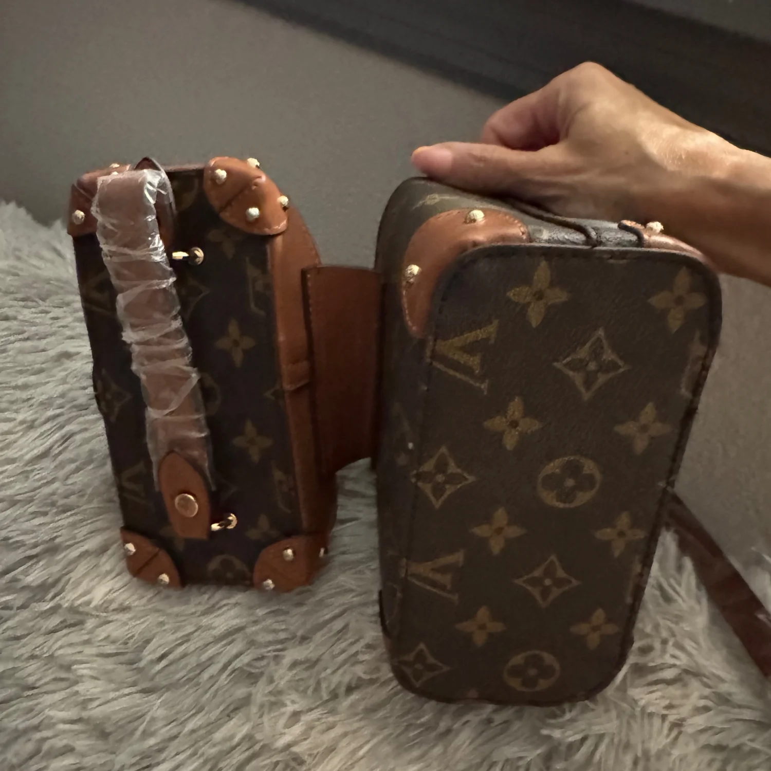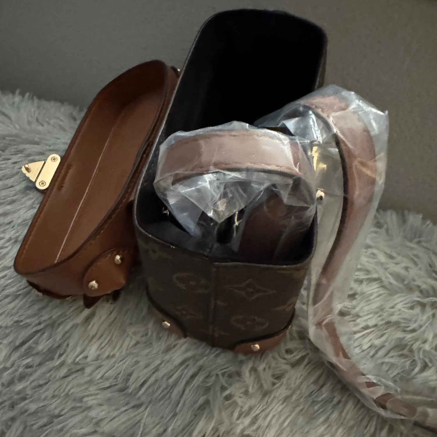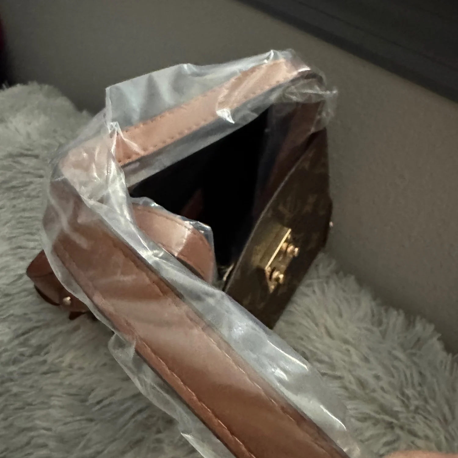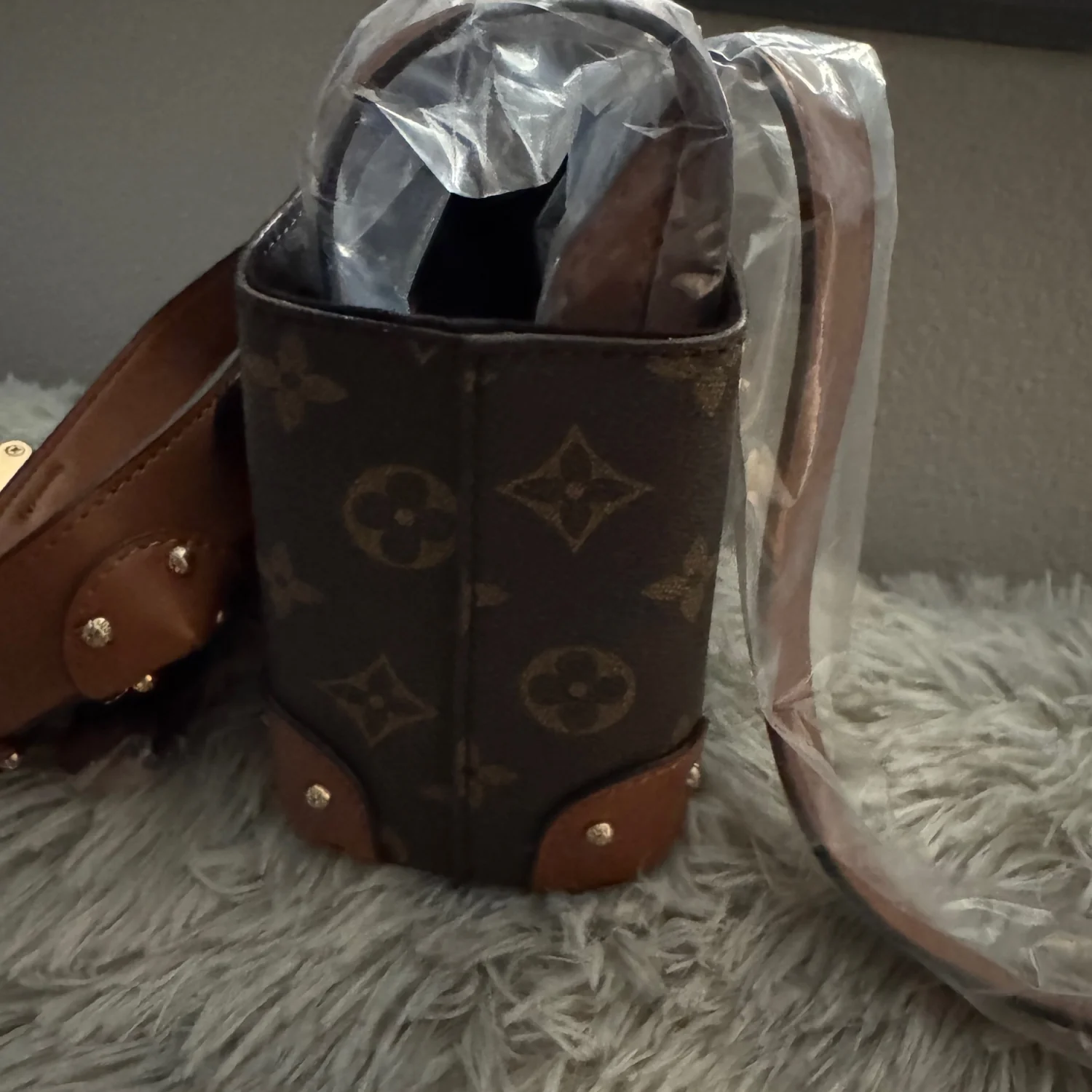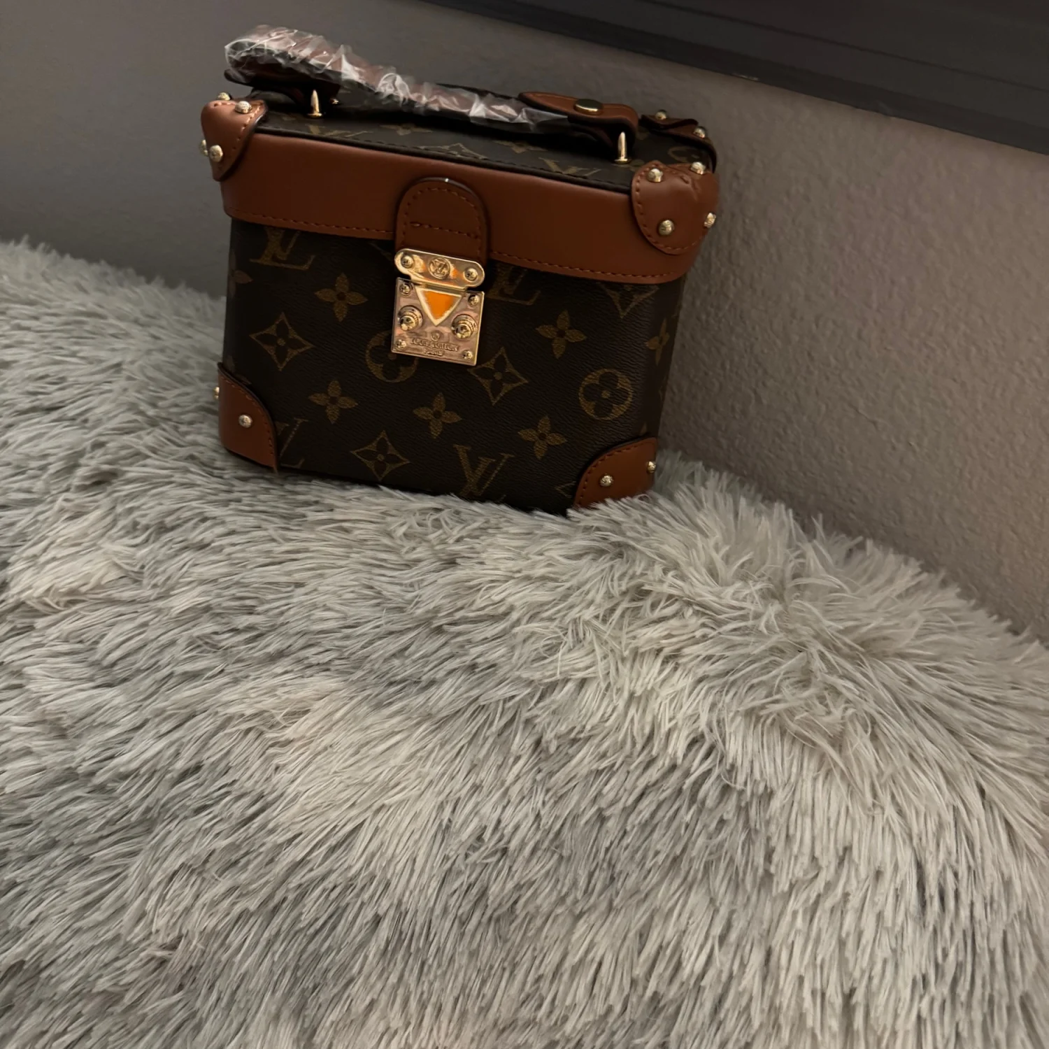 This stylish small trunk bag is crafted from monogram canvas with brown leather accents. It features a structured silhouette with gold-tone hardware, including a distinct lock-shaped clasp. The bag comes with a protective plastic wrap over the handle and strap, indicating it's in new condition. Perfect for adding a touch of luxury to any outfit. #designer #luxury #monogram