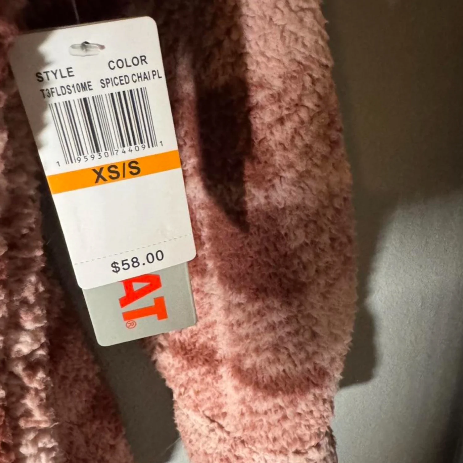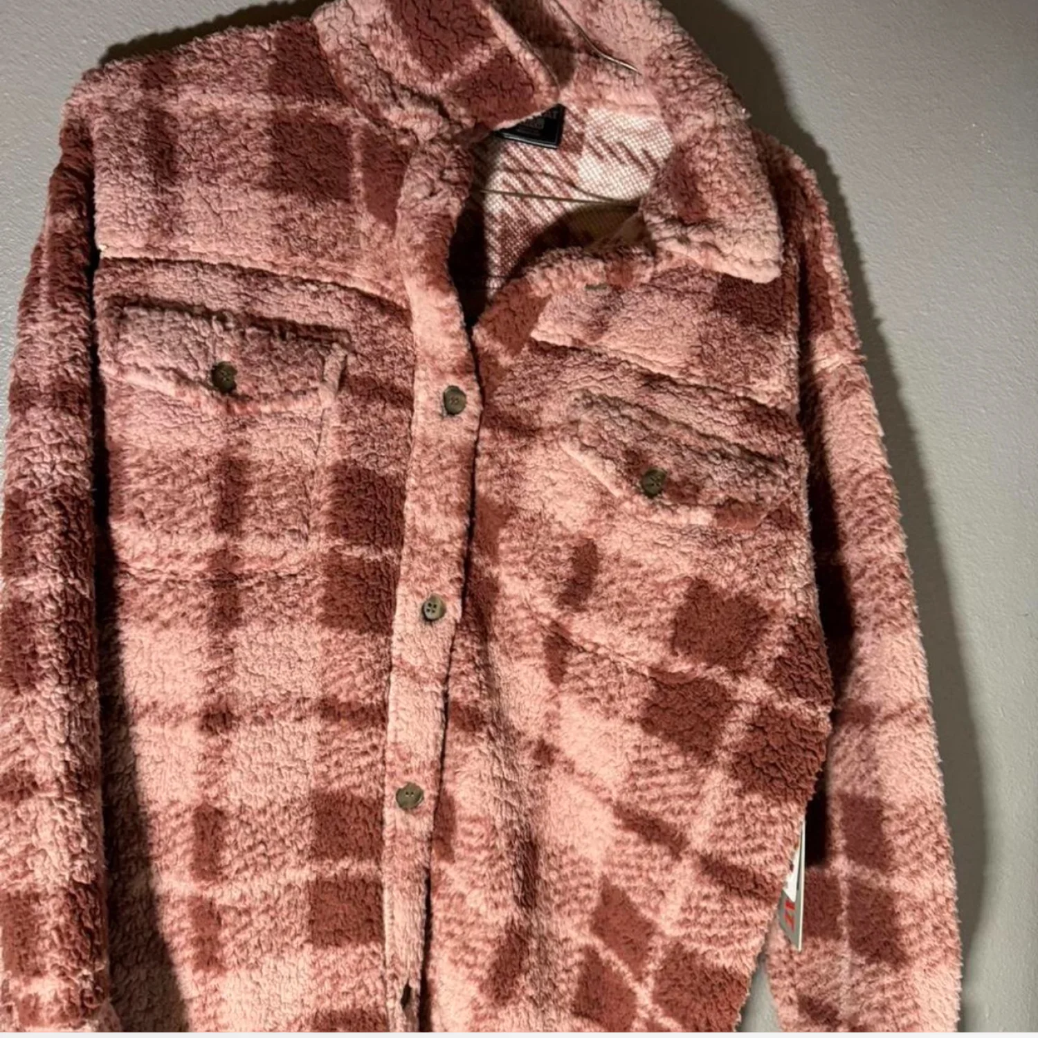 Cozy plaid fleece jacket in a warm spiced chai color. Features dual chest pockets with button closures and a comfortable, soft texture. Ideal for layering during cooler weather. #cozy #plaid #jacket