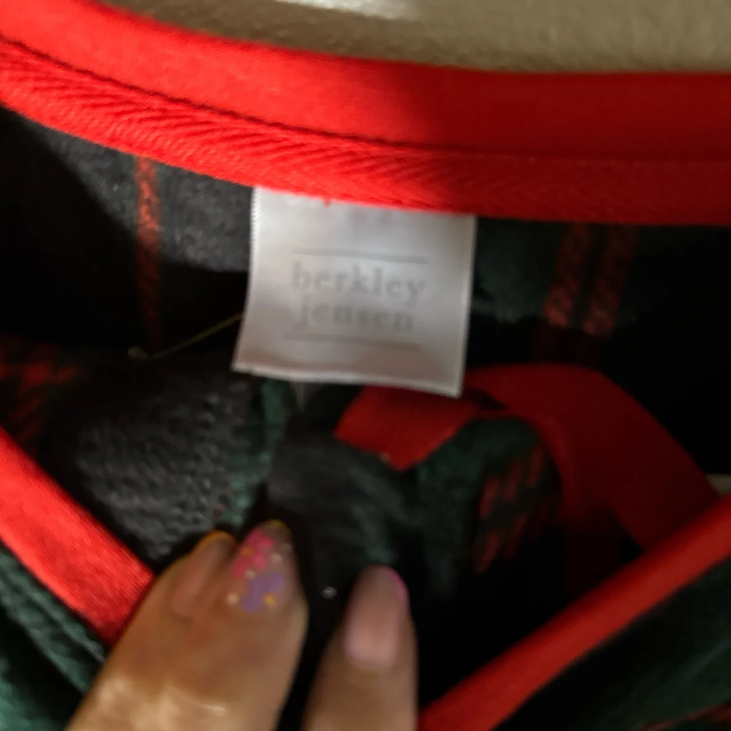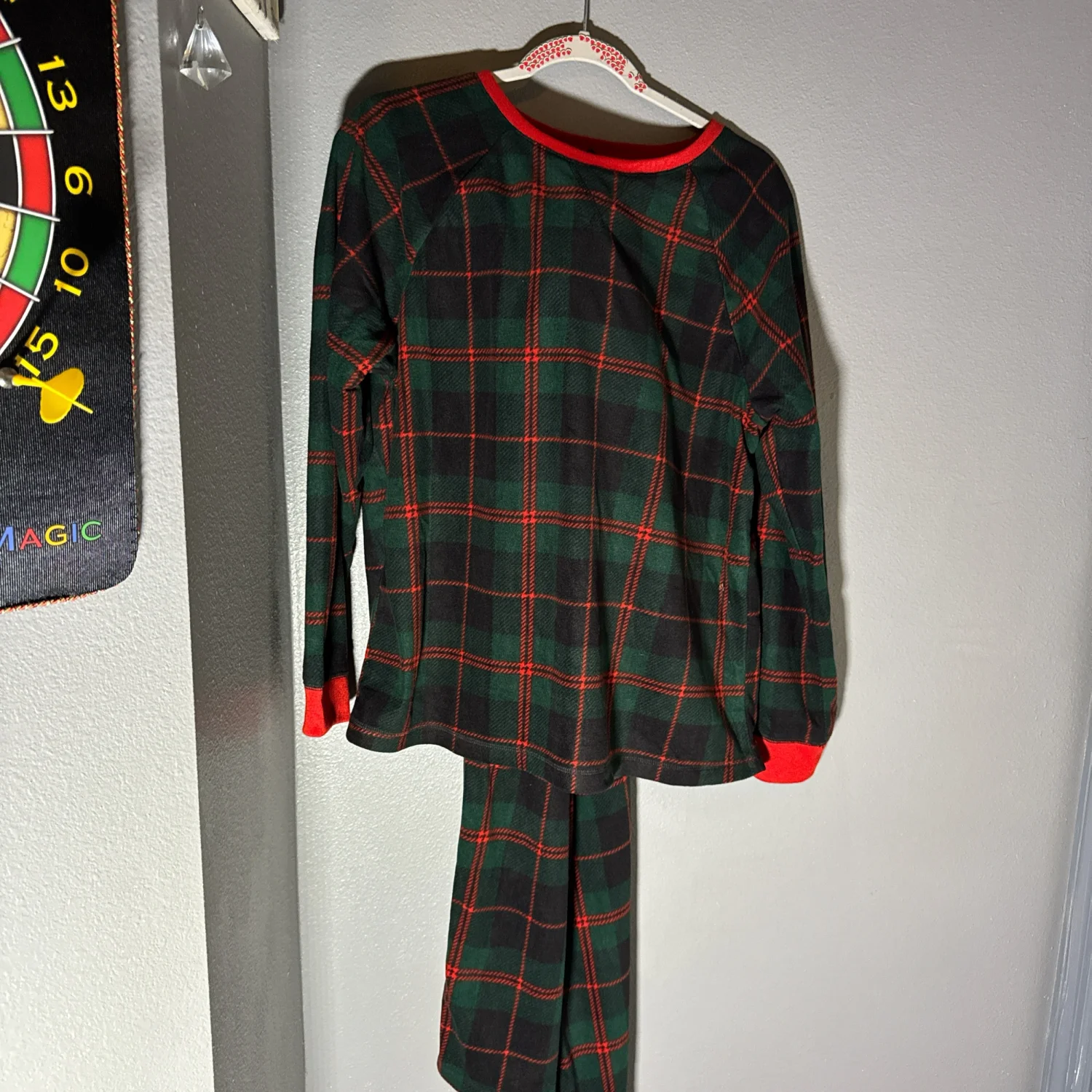 Cozy plaid pajama set in red and green by Berkley Jensen. Features a long-sleeve top with contrasting red trim and matching pants. Perfect for lounging around at home during the holidays or any casual evening. Made from soft, comfortable fabric, ensuring a cozy night's sleep. #Plaid #Loungewear #Pajamas