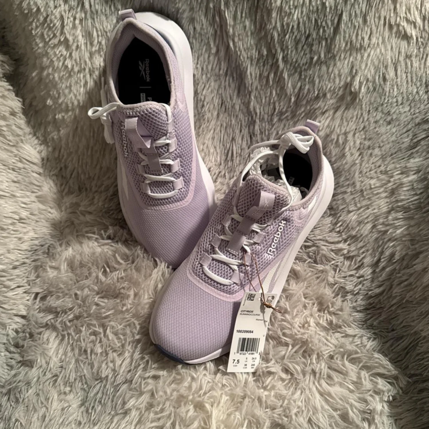 New Reebok athletic sneakers in a stylish light purple shade. These shoes feature breathable mesh fabric, perfect for workouts or casual wear. They come with original tags attached and are in a pristine, unused condition. Size is US 7.5. Ideal for those looking for comfort and style in their footwear. #Reebok #Sneakers #Athletic