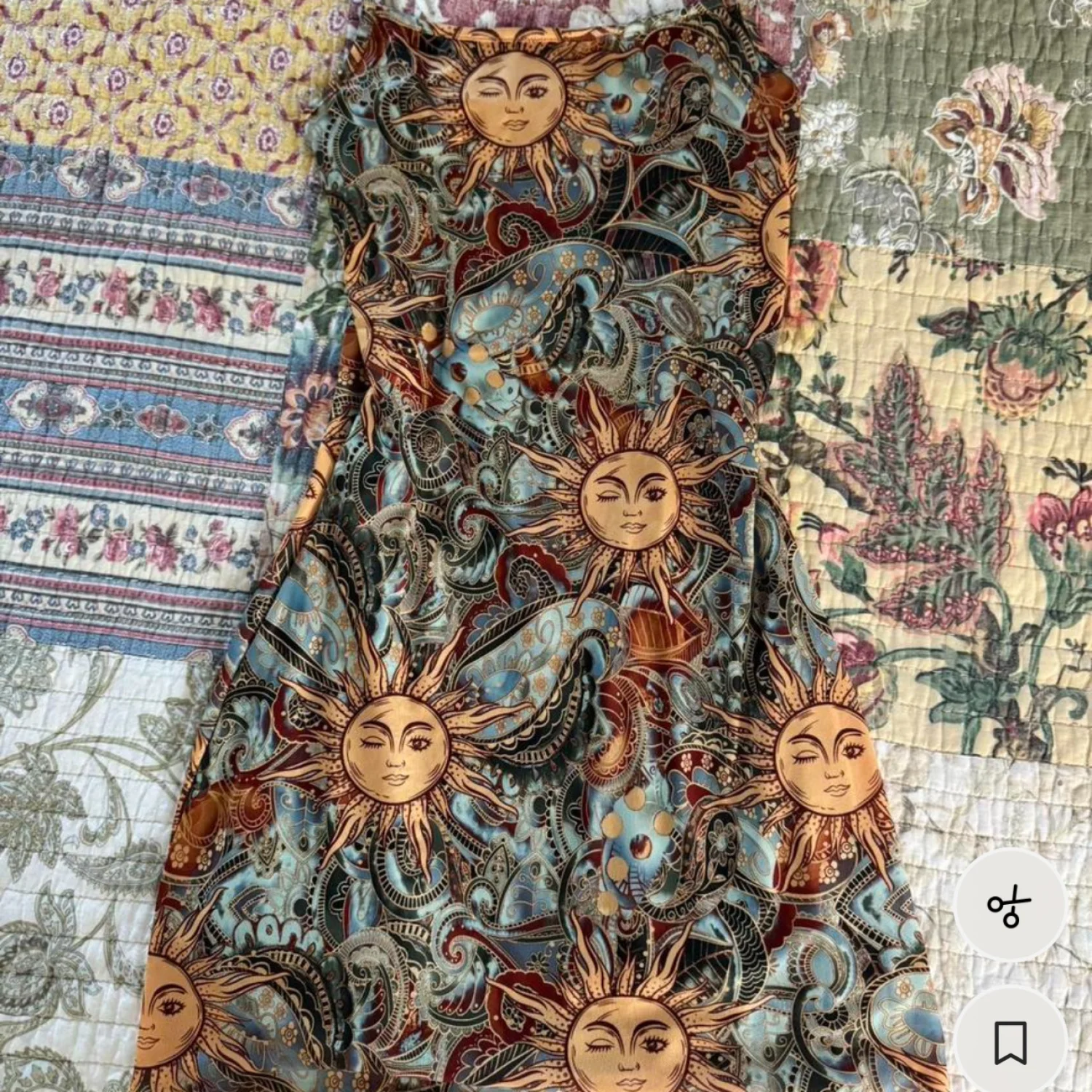 This vibrant mini dress features an all-over sun and moon design with intricate paisley patterns. It has a comfortable, sleeveless design with spaghetti straps. The dress is perfect for summer outings and festival wear. Made from a lightweight, breathable material, it promises both comfort and style. #Bohemian #FestivalFashion #Celestial