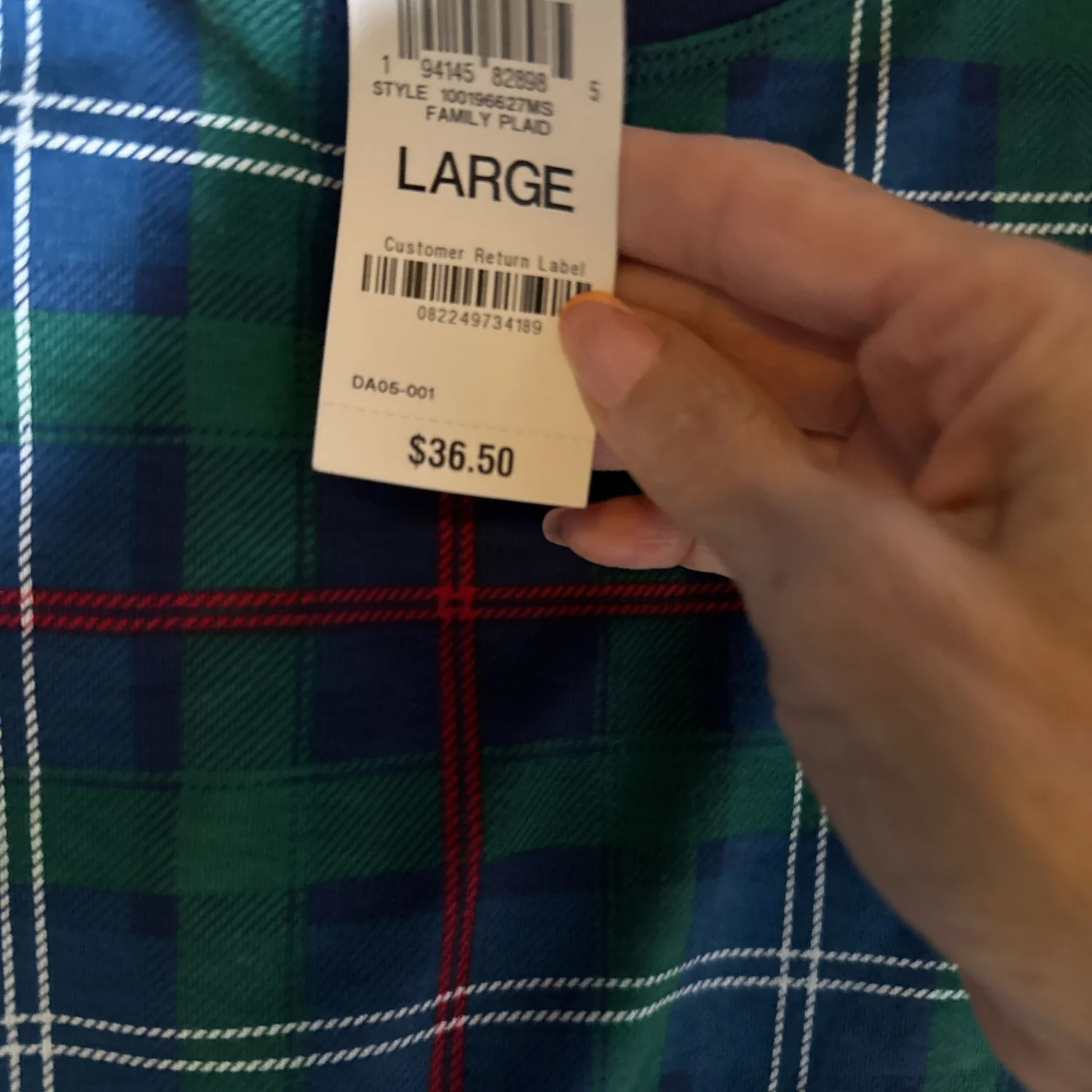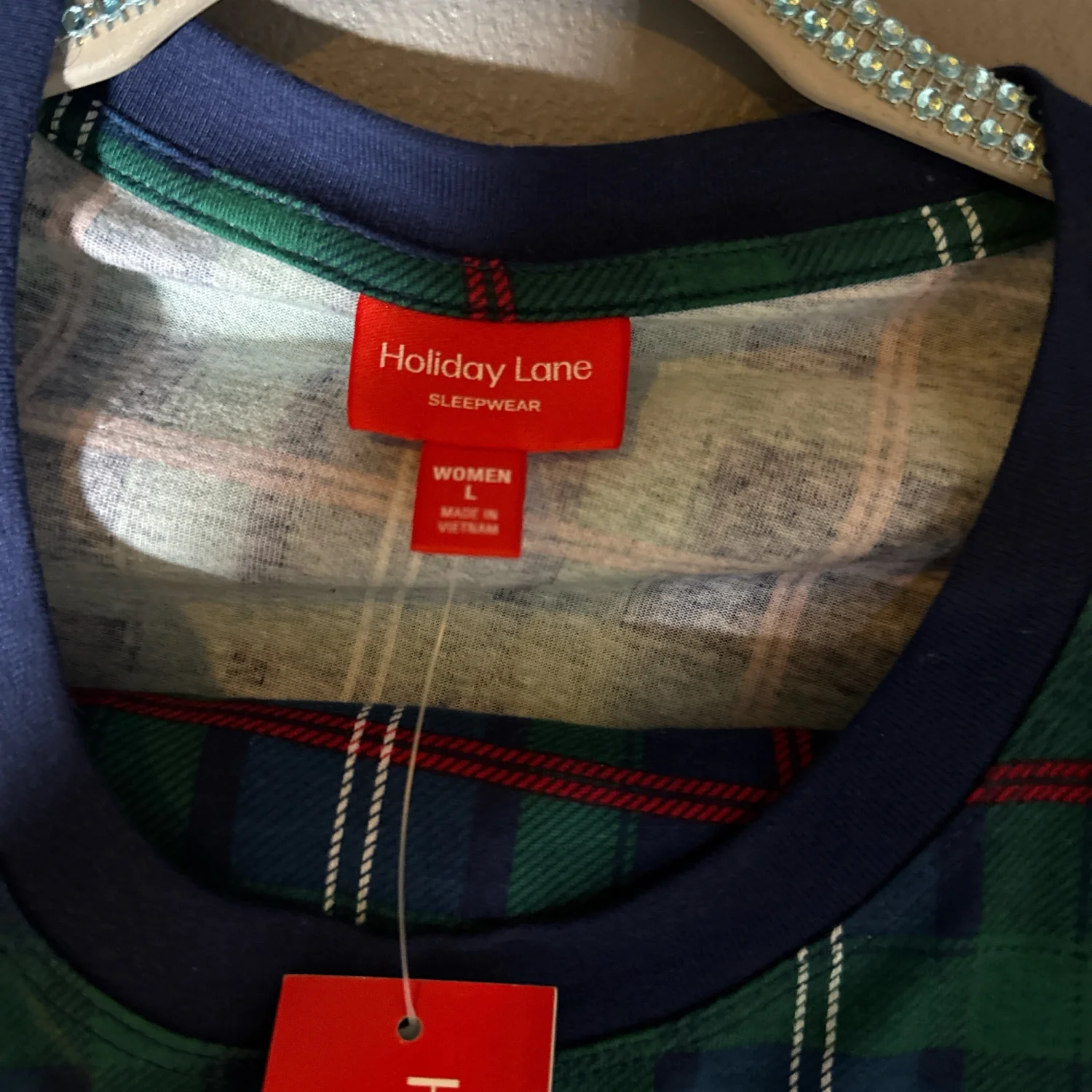 This Holiday Lane sleepwear set features a classic tartan plaid design with shades of green, navy, and red. It includes a long-sleeve top and matching pants, perfect for cozy nights. The fabric is soft and comfortable, ideal for sleep. Size Large. #Plaid #Sleepwear #Holiday