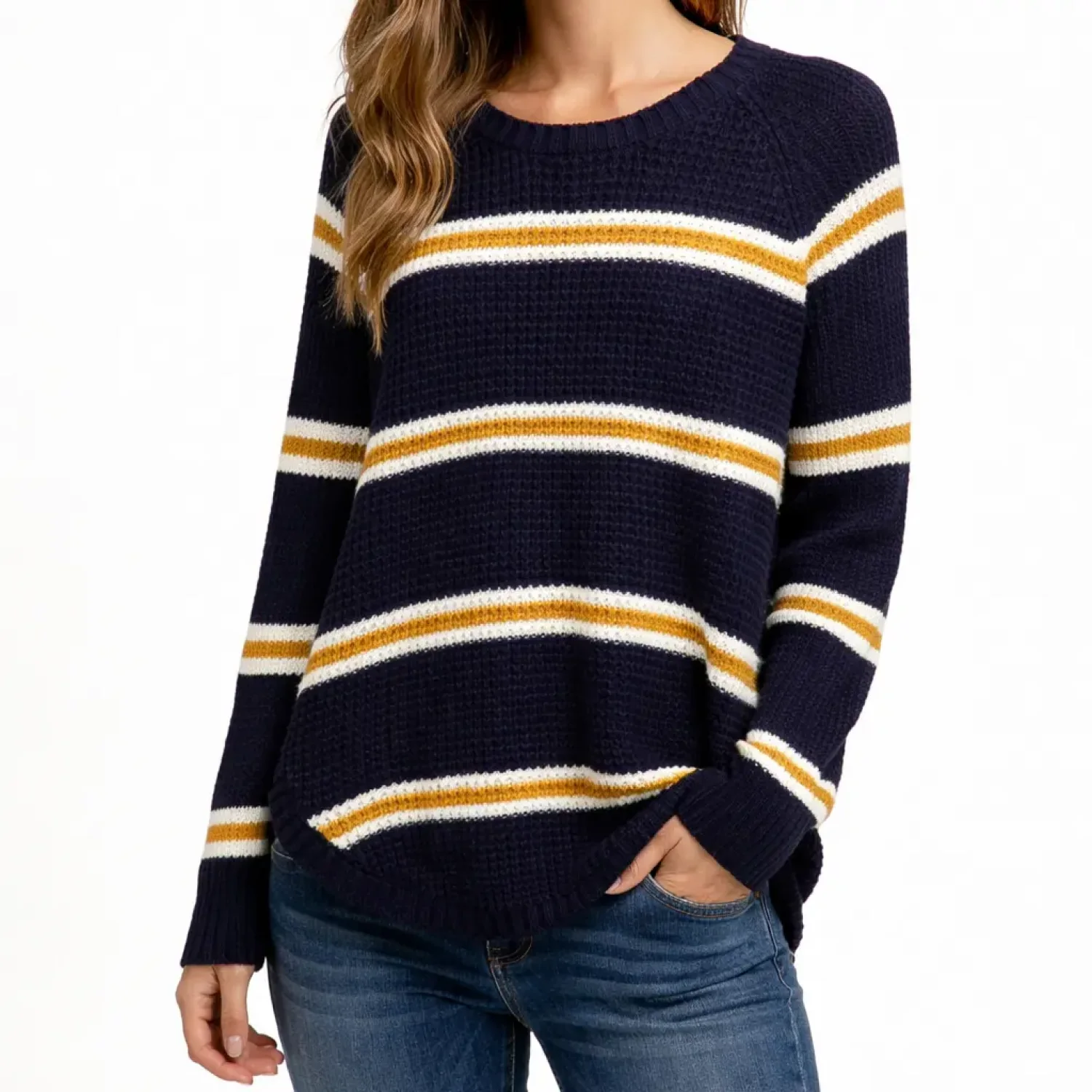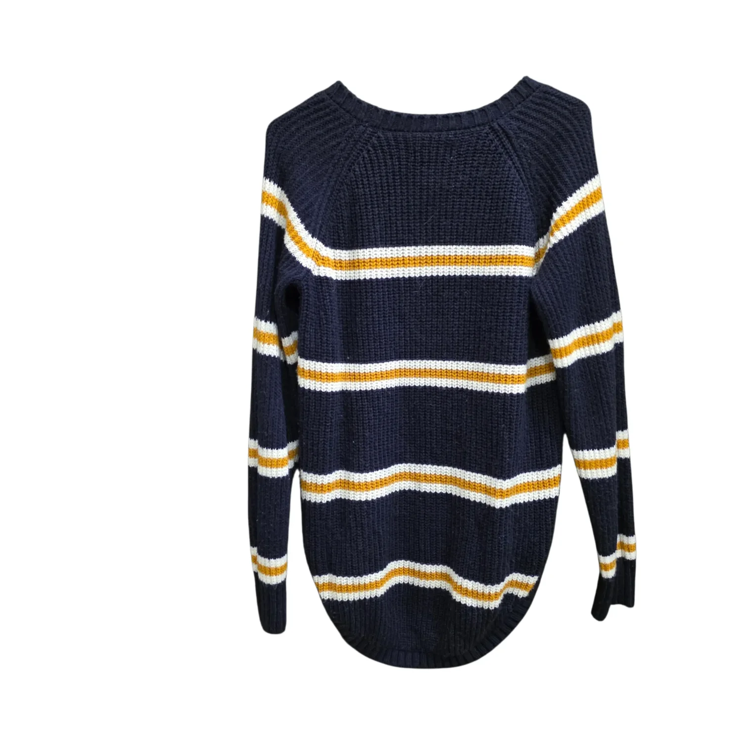 Refresh your wardrobe sustainably with this cozy waffle-knit sweater. Featuring a timeless navy blue, mustard yellow, and white striped pattern, this piece offers a classic vintage-inspired look with a modern curved hem. Textured waffle knit fabric, raglan sleeves for a relaxed fit, scoop neck, and a flattering high-low curved hem. Excellent pre-owned condition—no visible flaws or pilling. Perfect for a "Dark Academia" or "Fall Minimalist" look. Pair with high-waisted denim for an effortless daily outfit.