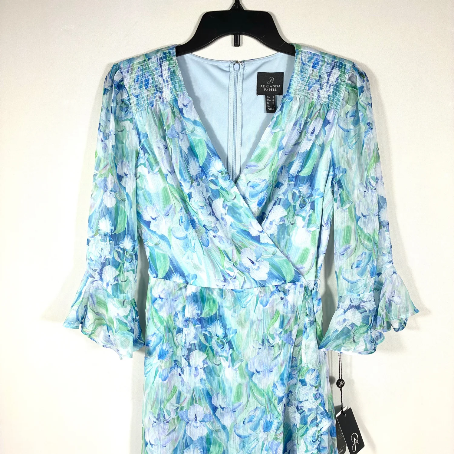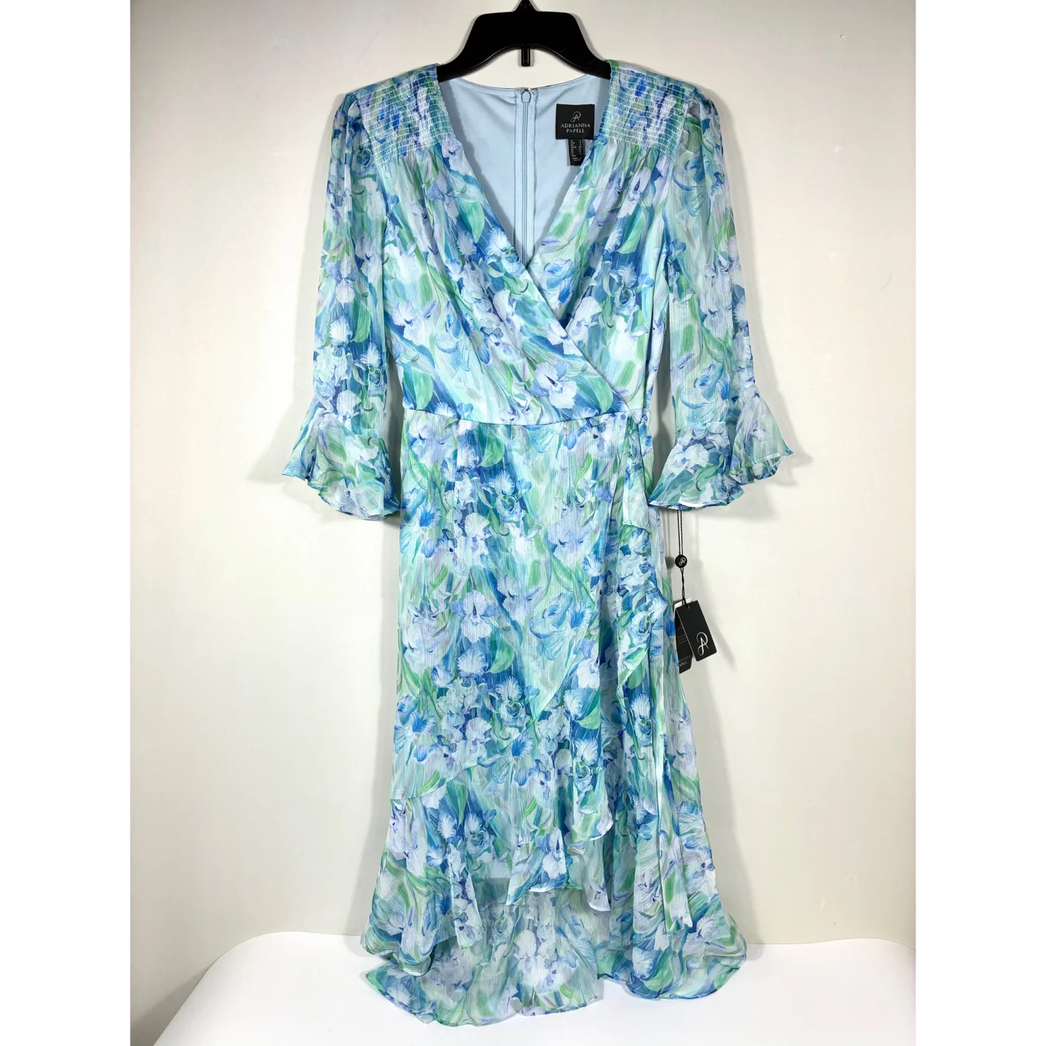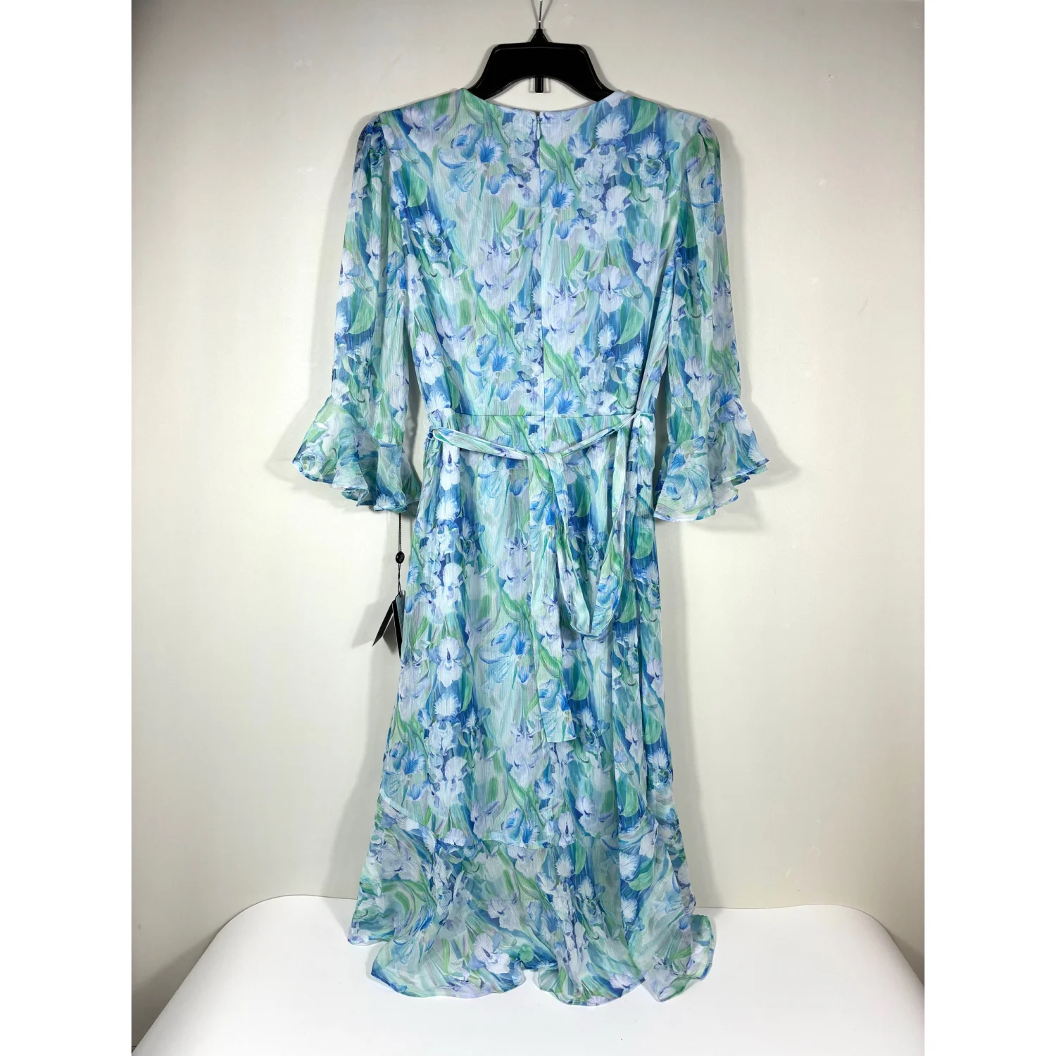 NEW with tag! Retail: $169 - Size: 2 - Color: Blue Multi - A swirling watercolor print enlivens this soft chiffon dress styled in a wrapped silhouette with flouncy ruffle trim. - Surplice V-neck - Three-quarter sleeves - Lined - Material: 100% polyester #floral #midi #ruffle #lined #watercolor