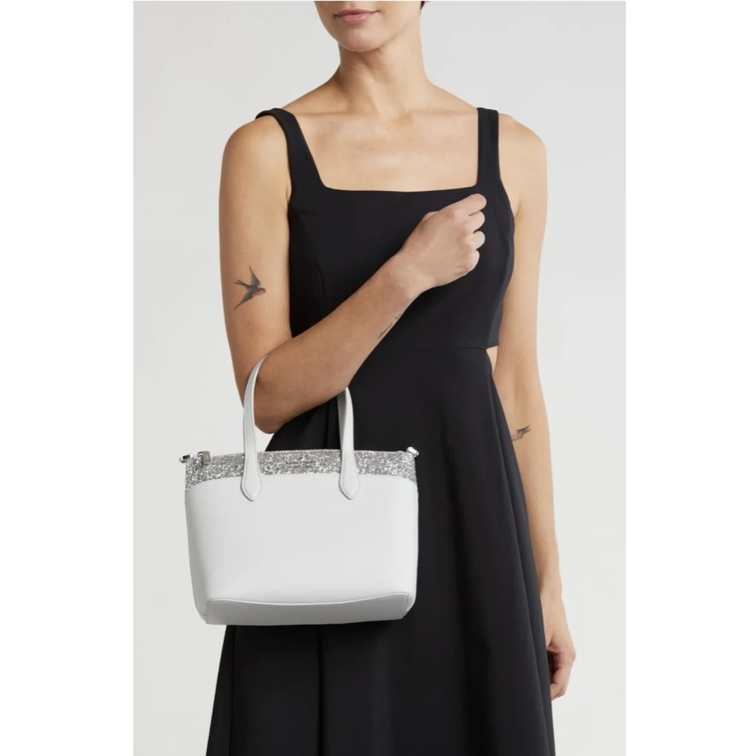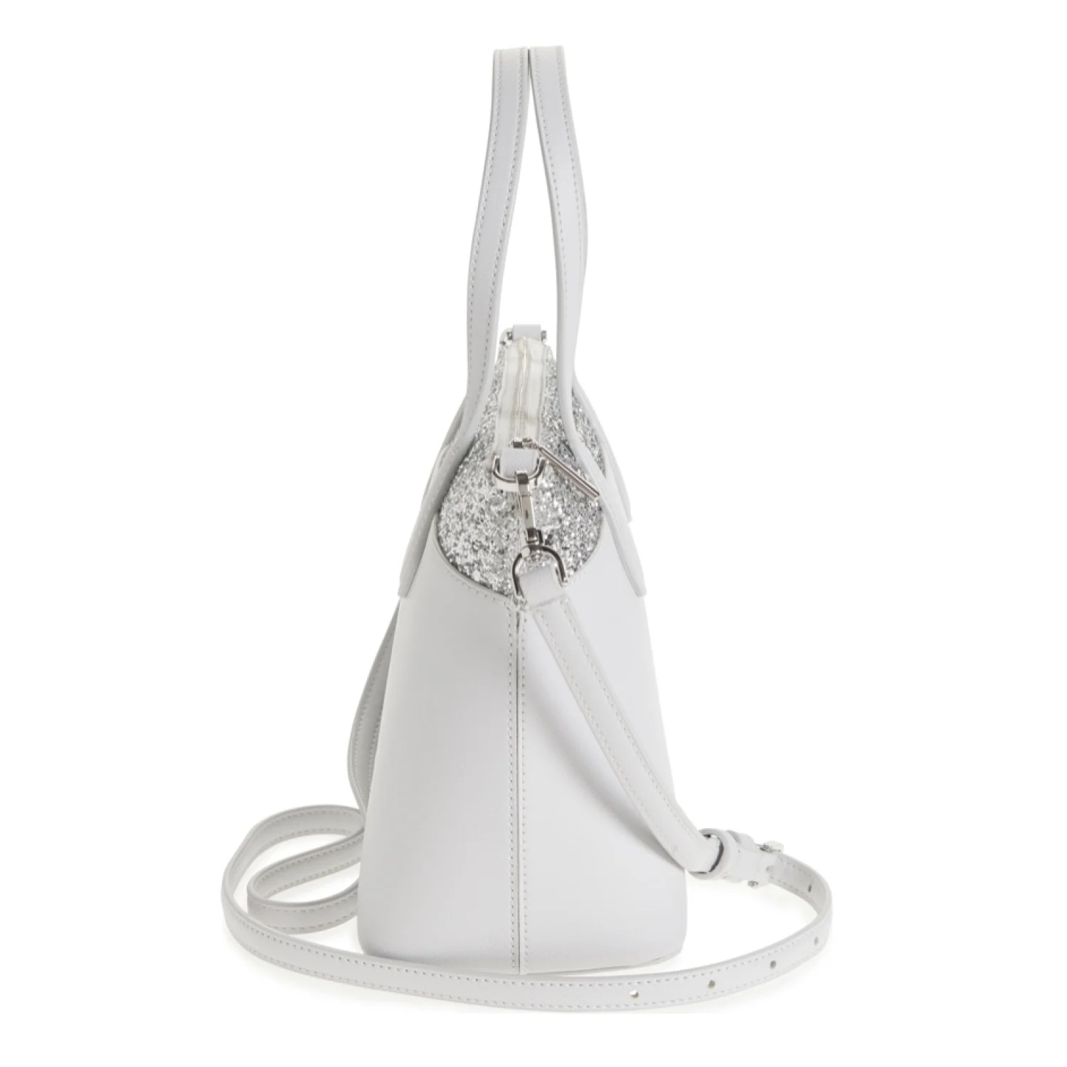 NEW with tags and in the original manufacturer packaging. Retail: $329 - Authentic - Color: Grey - A glittery stripe brings whimsical sparkle to this everyday satchel fashioned with a roomy interior, secure zip closure and removable crossbody strap - Measurements approx.: 9.28" x 7.6" x 4.6" - Approx. 5" handle drop; 22" strap drop - Top zip closure - Top carry handles; removable, adjustable crossbody strap - Logo at front - Interior slip pocket - Logo jacquard lining - Material: saffiano pvc - Trim: glitter fabric trim