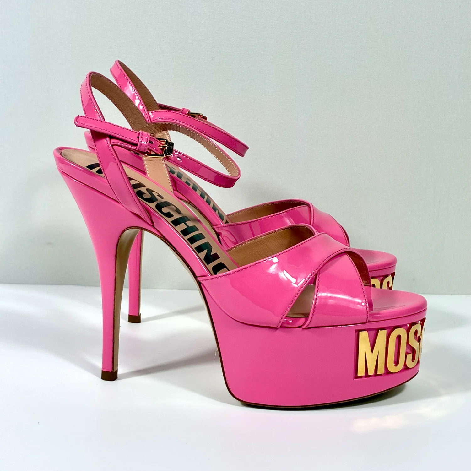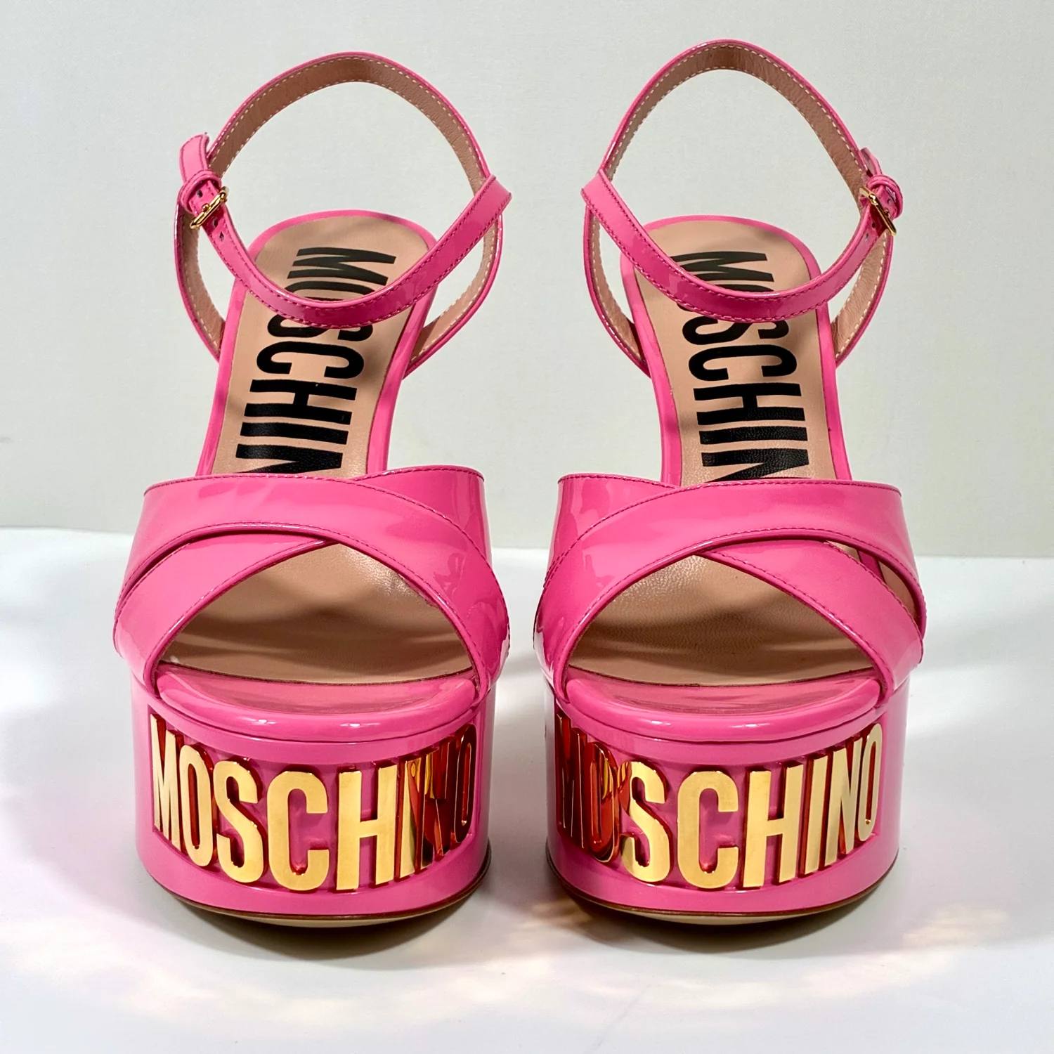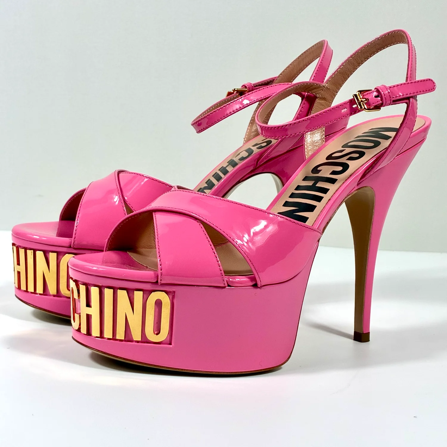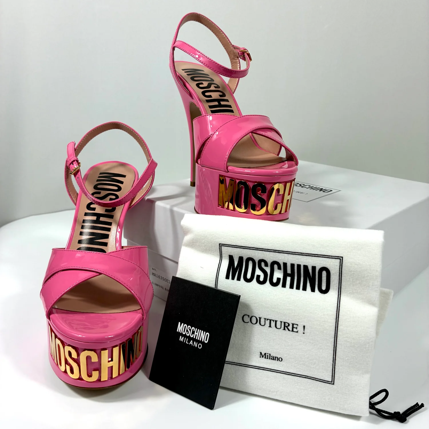Moschino Logo Leather Platform Stiletto Sandals Heels Pink Gold NEW 38