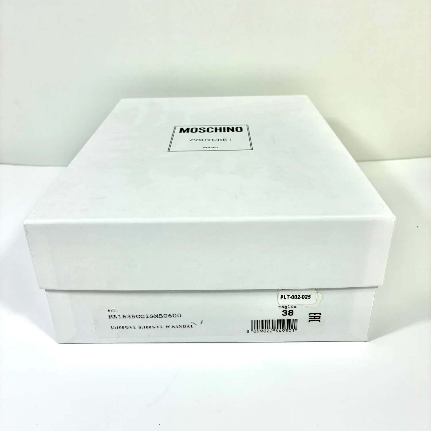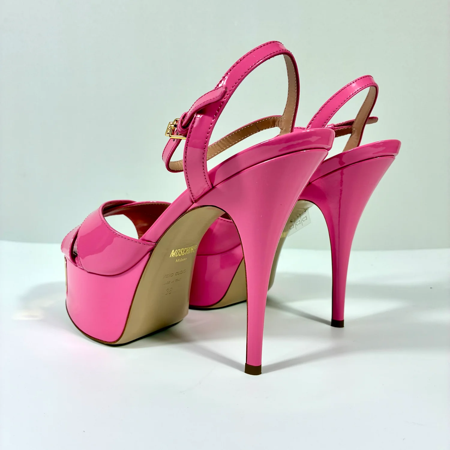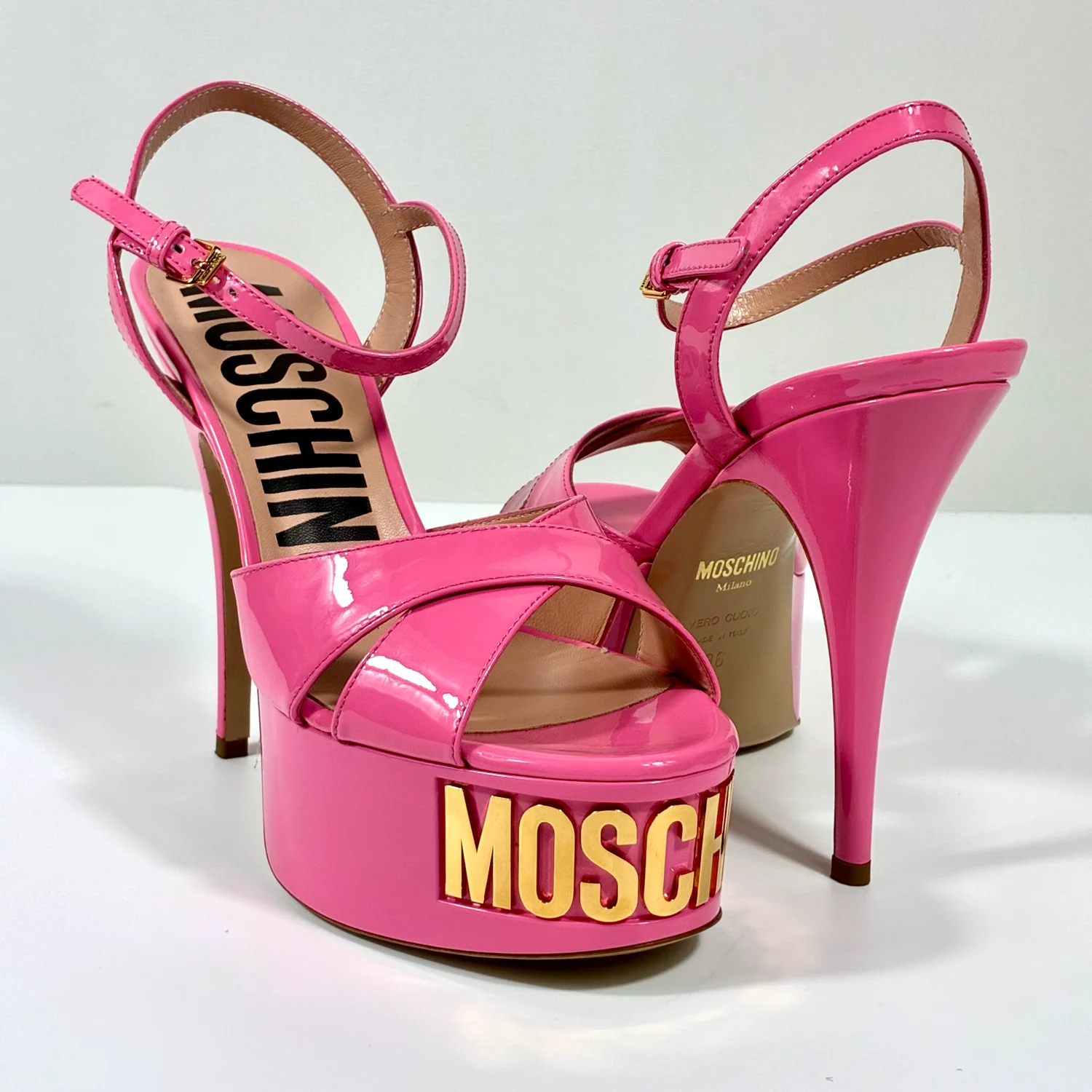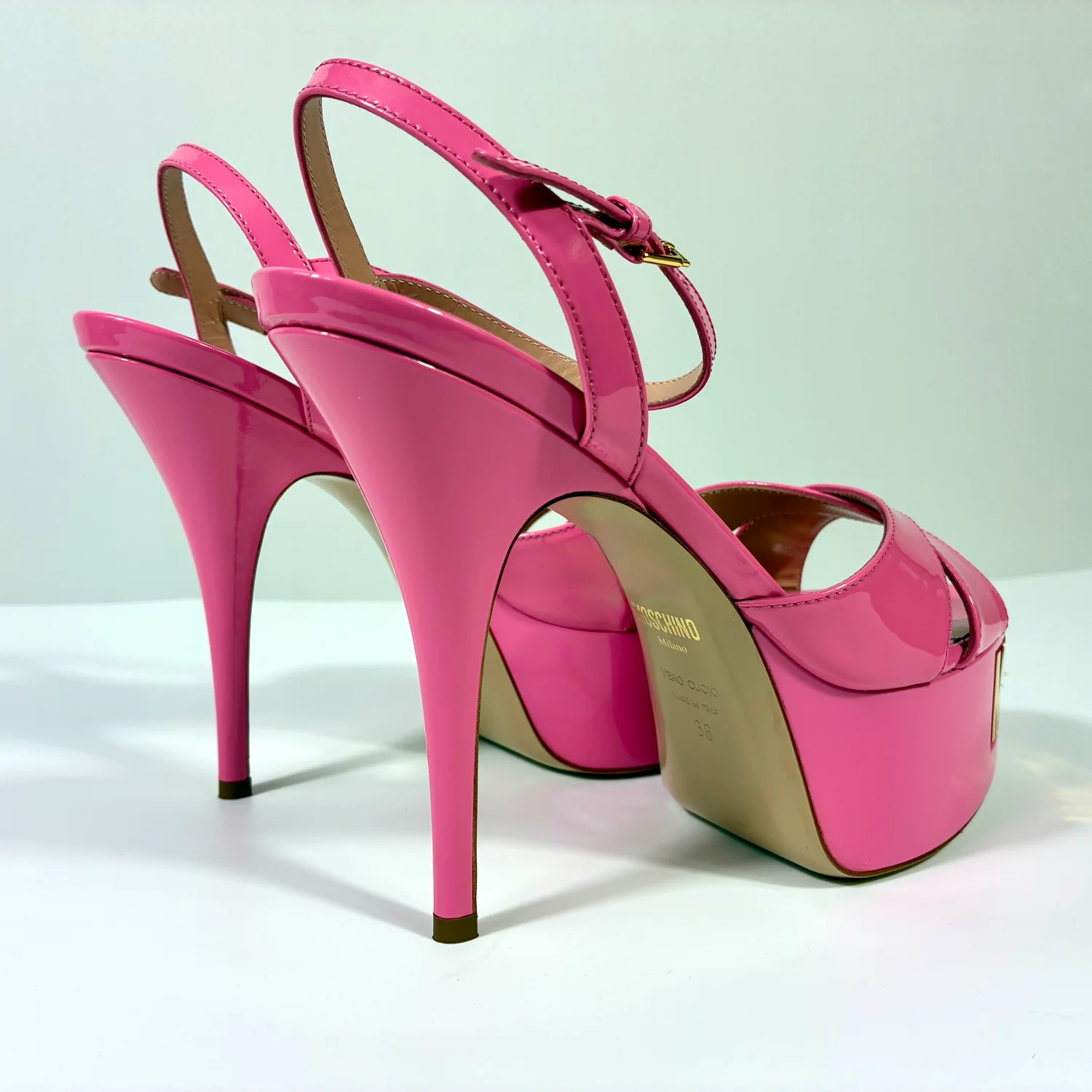 Moschino Logo Leather Platform Stiletto Sandals Heels Pink Gold NEW 38