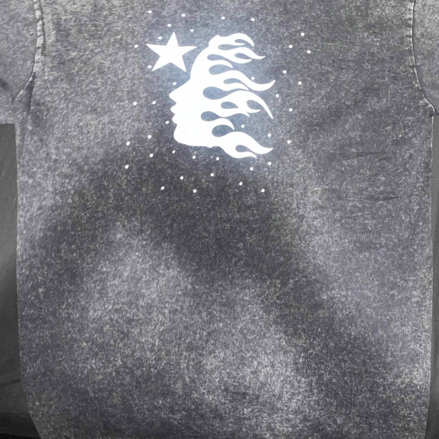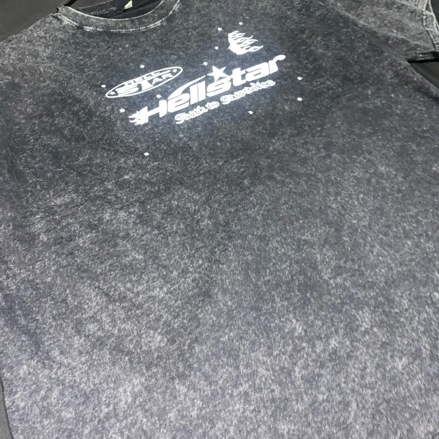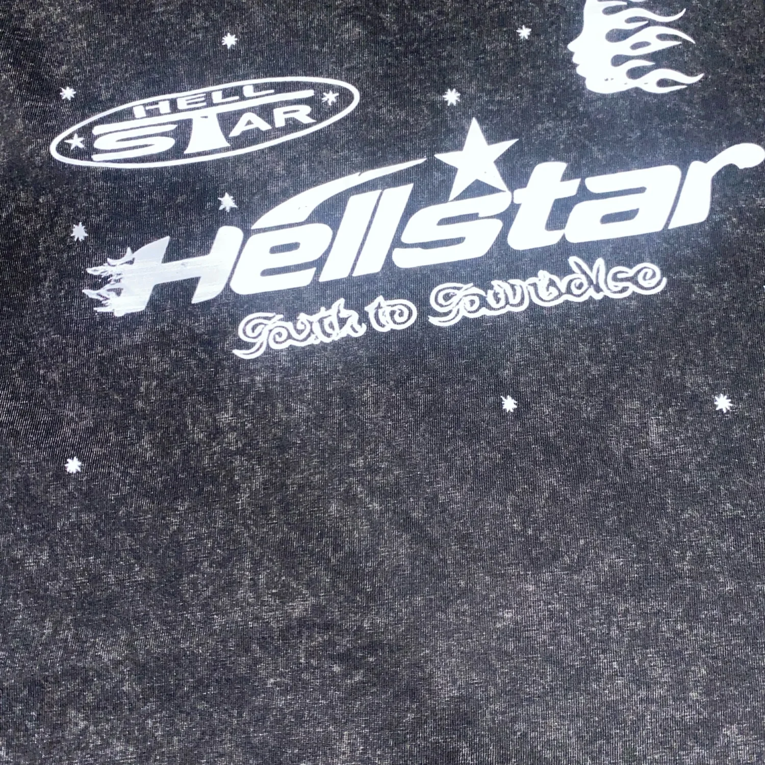 Unisex black acid wash tee featuring a bold 'Hellstar' graphic on the front and abstract design on the back. Made from soft cotton for comfort and style. Ideal for casual outings and pairing with jeans. #graphictee #acidwash #streetwear