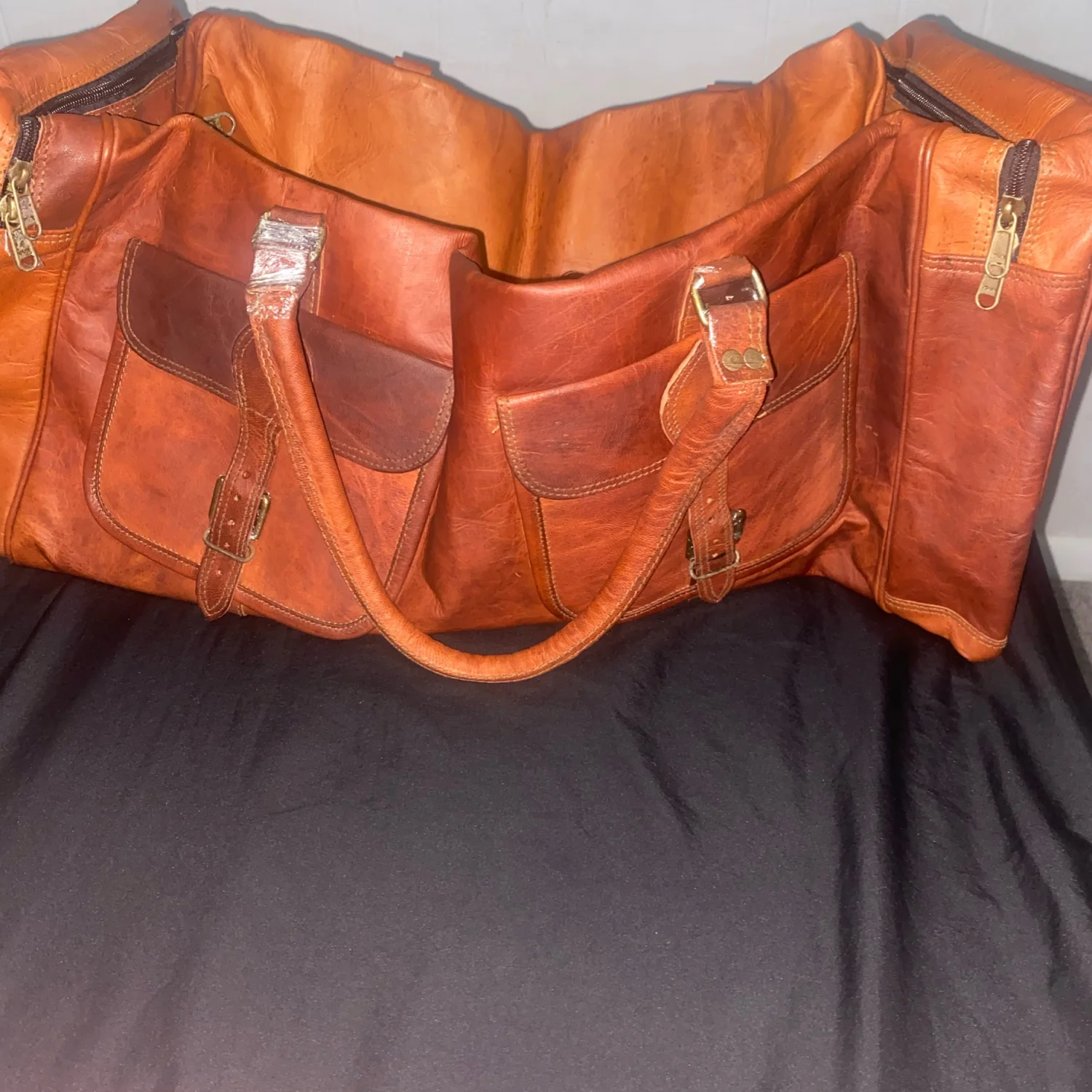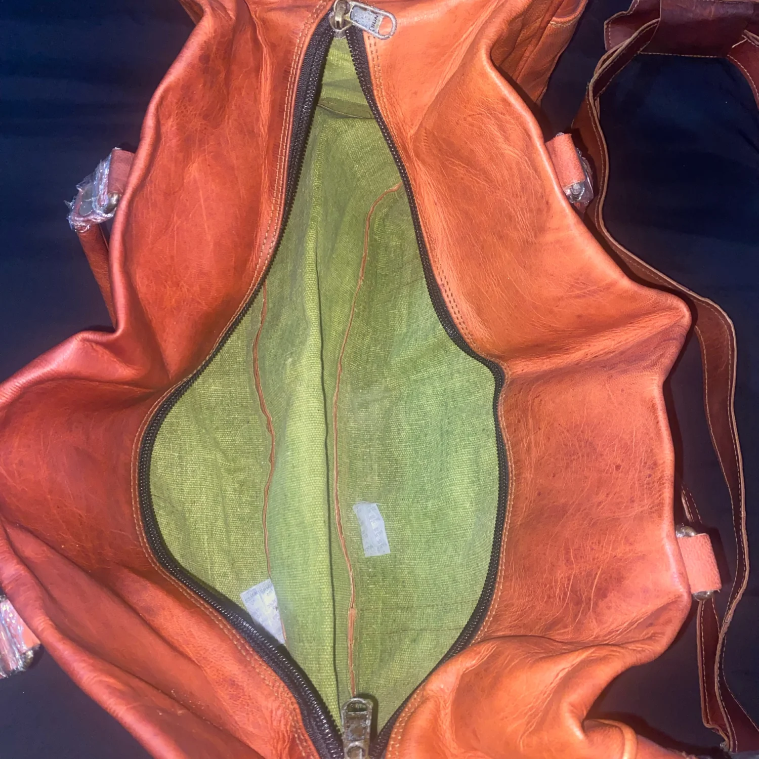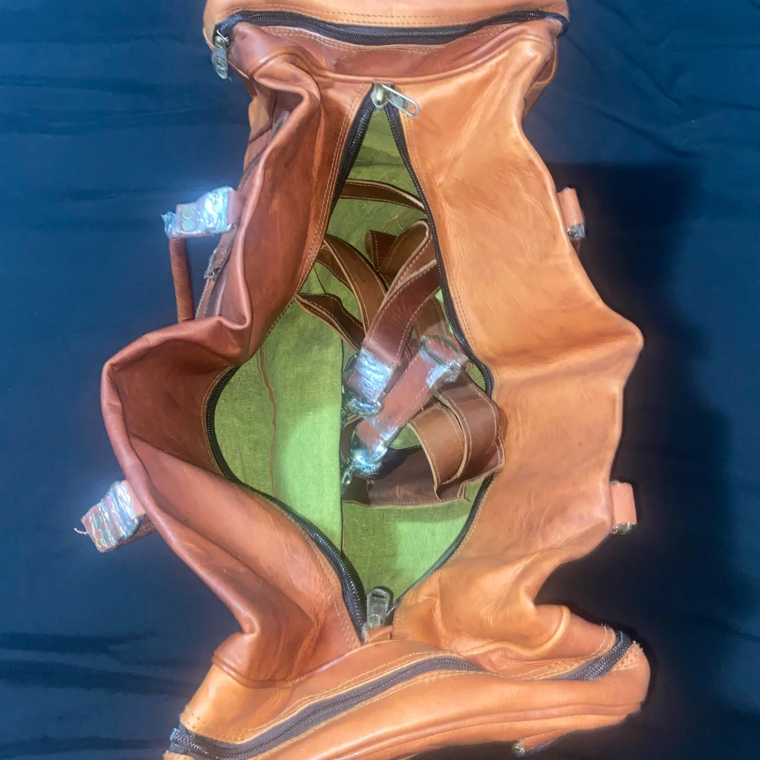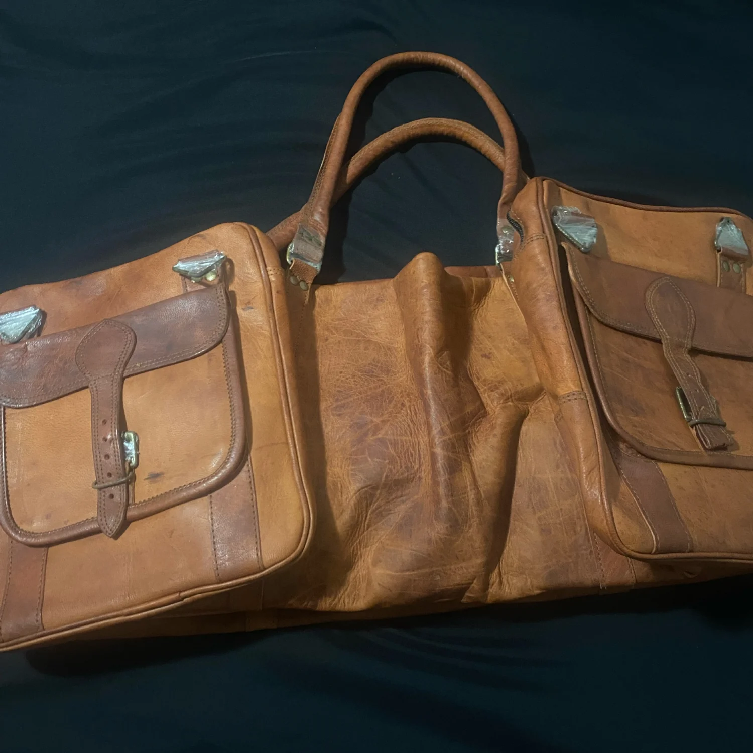 This spacious vintage leather travel bag features a rustic tan and brown color scheme, ideal for weekend trips or as a stylish carry-on. It has two front buckle pockets, sturdy dual handles, and a detachable shoulder strap for versatile carrying options. The bag is lined with a durable green fabric and includes multiple zippered compartments for organization. Perfect for those who appreciate a classic, rugged style. #vintage #leather #travelbag