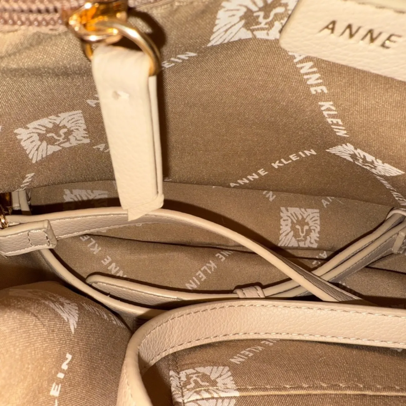 This Anne Klein mini handbag features a classic beige leather exterior with gold-tone hardware. It has sturdy double handles and a spacious interior lined with branded fabric. Perfect for everyday use or special occasions, this bag combines elegance and practicality. Tags: #AnneKlein #LeatherBag #BeigeHandbag ••REASONABLE OFFERS ARE WELCOMED••