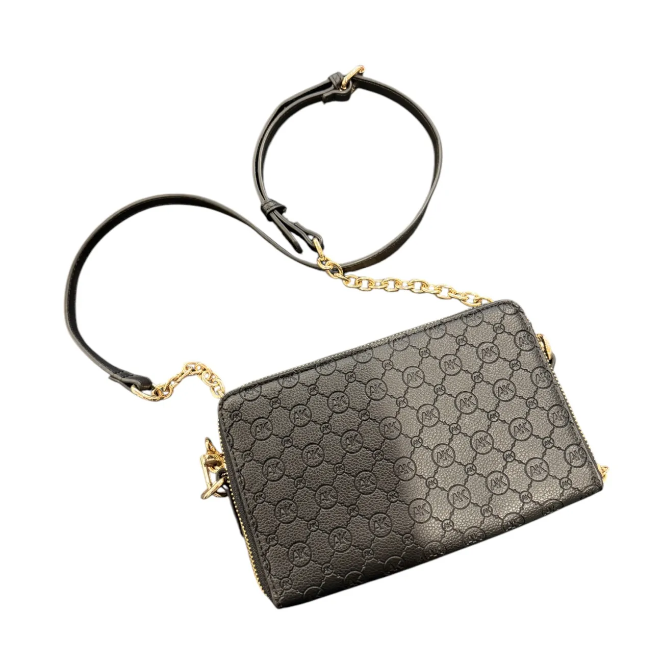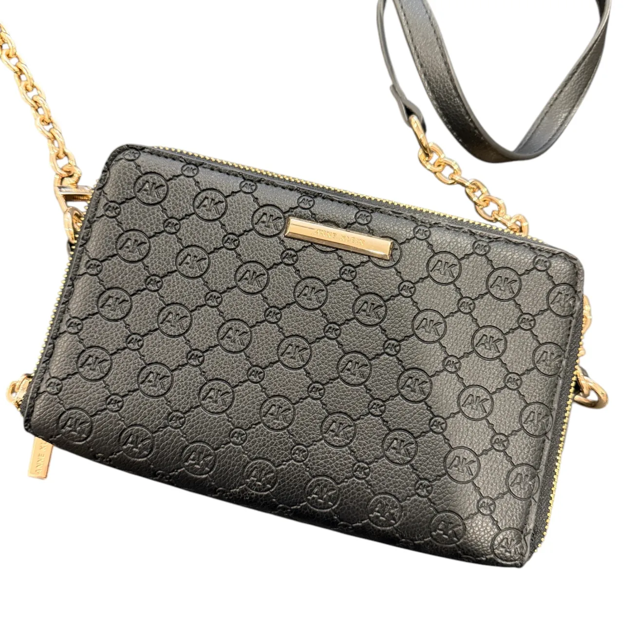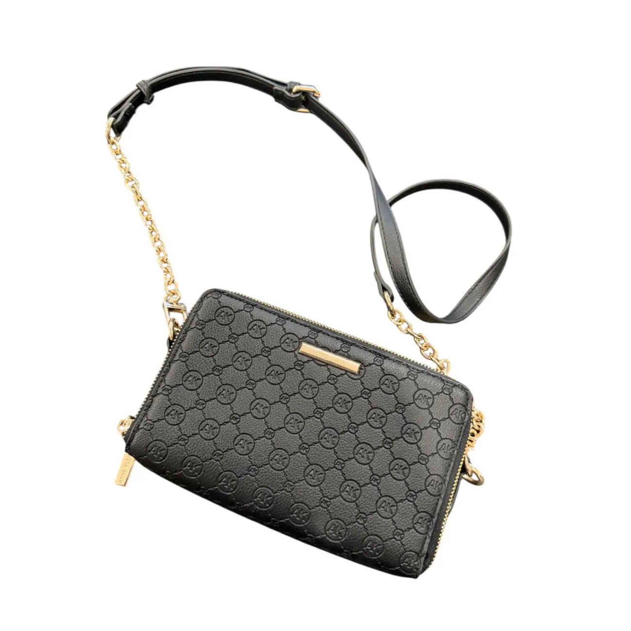 Elevate your ensemble with this elegant black crossbody bag, featuring a signature embossed pattern that highlights the brand's iconic initials. The luxurious pebbled texture of the leather enhances its premium feel, while the gold-tone chain and leather strap add a refined contrast, creating a sophisticated accessory for day or night. Designed for both style and convenience, this bag offers a secure zip closure and versatile strap length, ensuring it complements your look effortlessly while keeping essentials close at hand. • Color: Black • Material: Pebbled leather • Hardware: Gold-tone • Strap: Chain and leather • Closure: Zip • Brand: Anne Klein • Measurements: 8”L x 5”H
