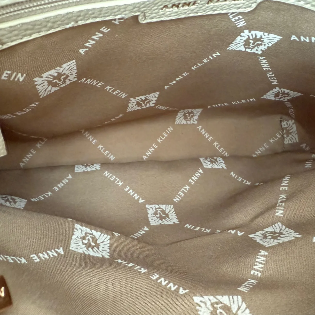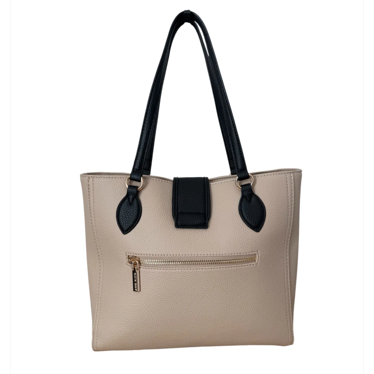This Anne Klein shoulder bag features a sophisticated beige and black two-tone design. Perfect for daily use, it includes a spacious interior with signature Anne Klein lining, a black top handle, and a secure zip closure. The exterior also has a convenient zip pocket for easy access to small essentials. Ideal for work or casual outings. #AnneKlein #ShoulderBag #TwoTone • Taupe pebbled faux leather • Black faux leather handles and tab • Gold-tone Anne Klein logo • Zippered exterior back pocket • Interior lined with branded fabric • Medium to large capacity • Structured rectangular shape • Measurements: 11” L x 9 1/2” H ••REASONABLE OFFERS ARE WELCOMED••