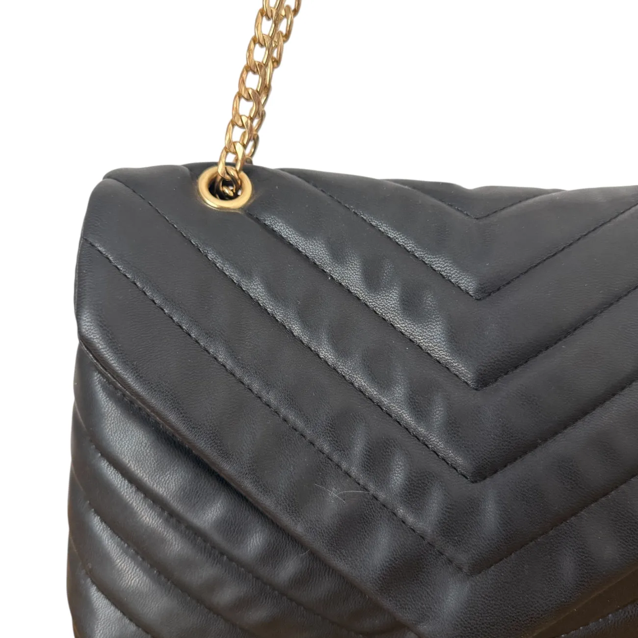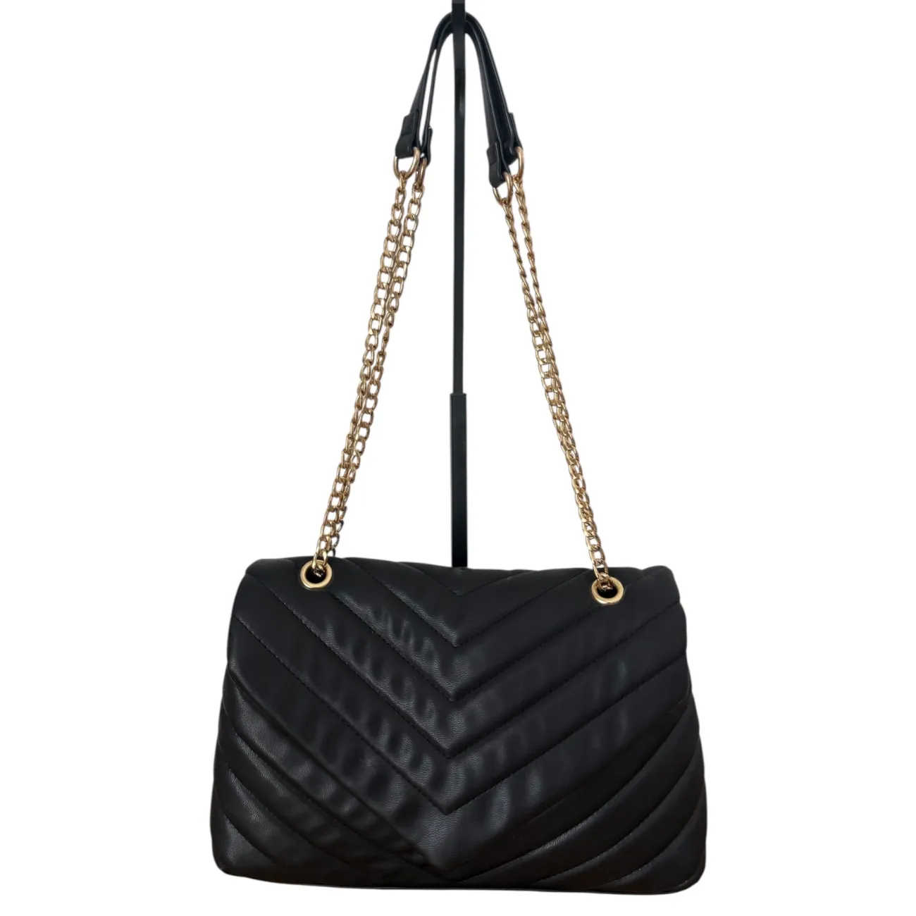 Elegant black quilted shoulder bag featuring a stylish chevron pattern. It has a gold-tone chain strap for a touch of luxury. The interior includes a zippered pocket for secure storage. Perfect for both casual outings and evening events. #bag #quilted #chic #accessory • Approximate size: medium-large 12” L x 6 1/2” H ••REASONABLE OFFERS ARE WELCOMED••