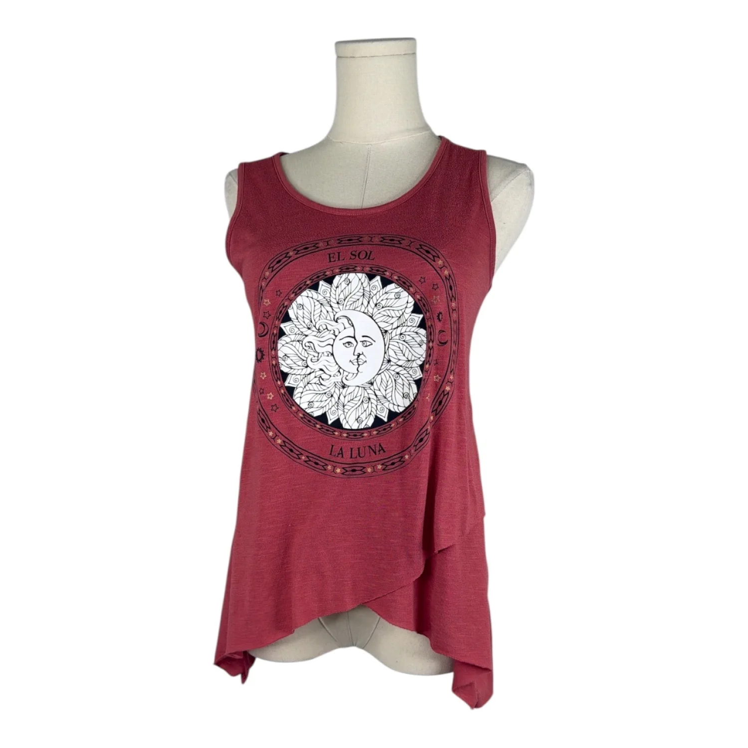 Flowy burgundy tank top featuring an artistic 'El Sol La Luna' graphic print. Designed with a relaxed asymmetric hem for a casual, stylish look. Perfect for summer or layering. Tags: #casual #graphic #sleeveless