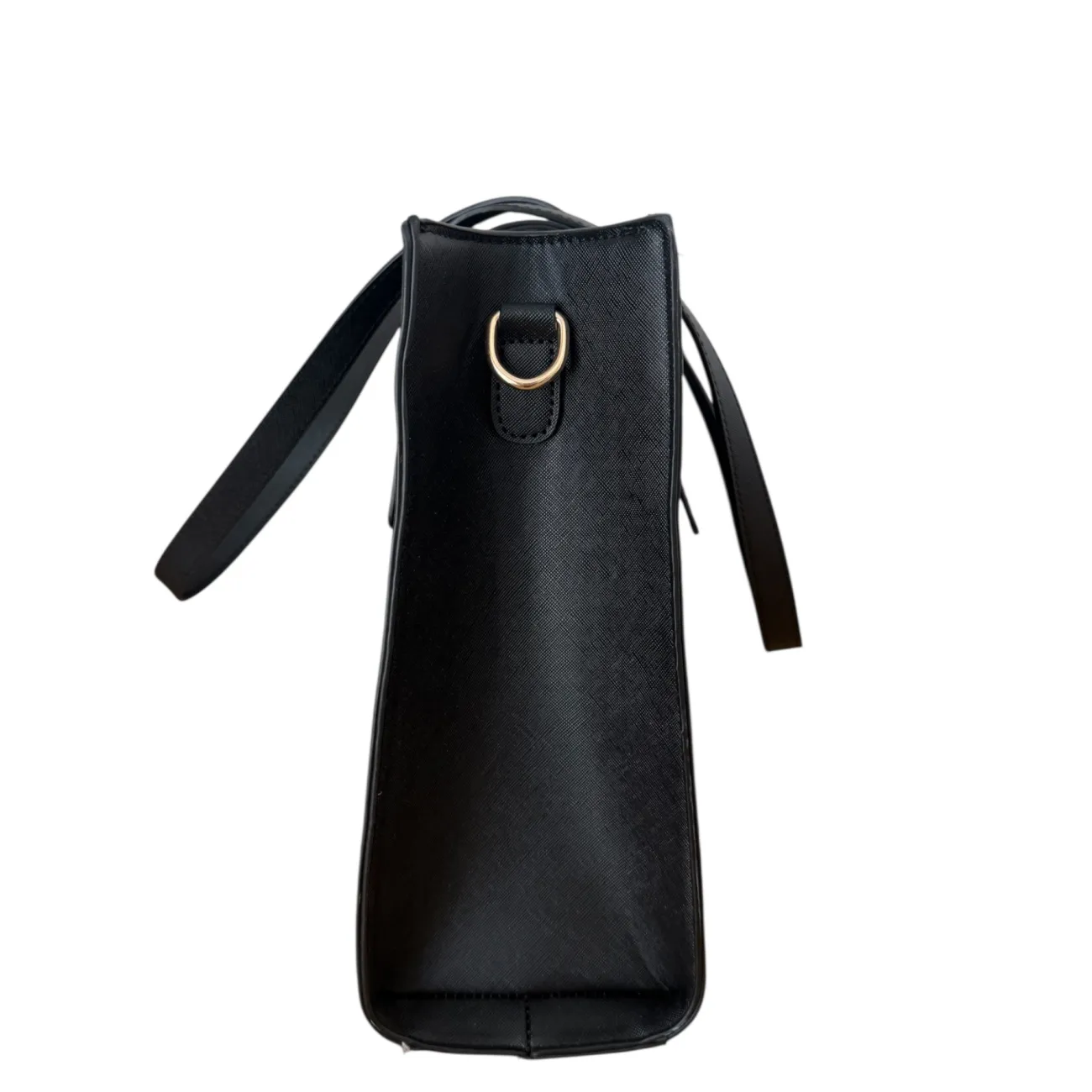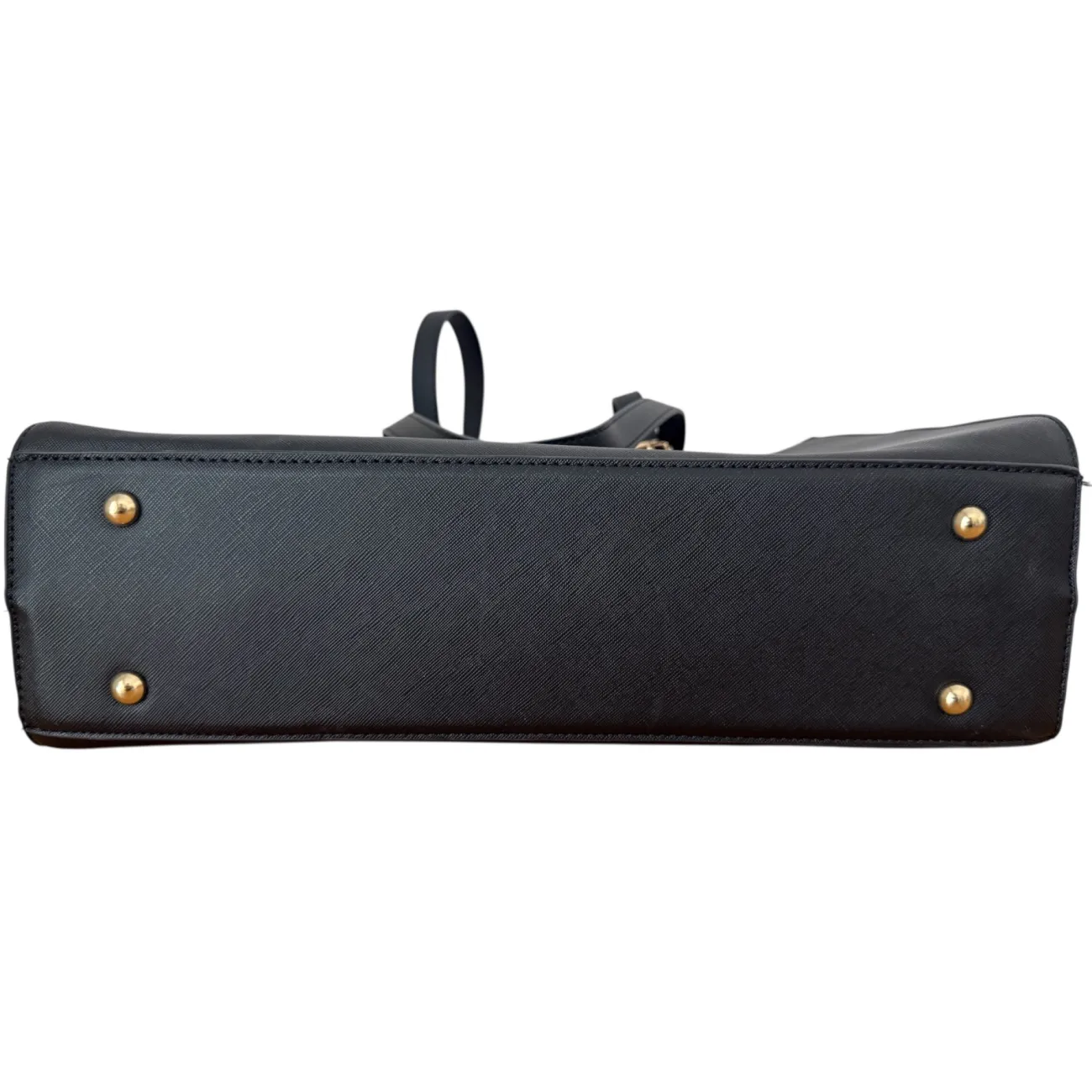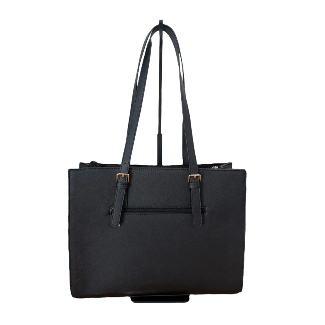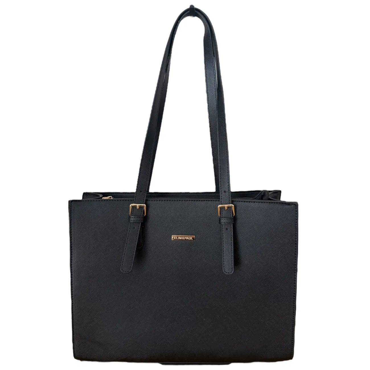 Stylish black structured tote bag with long straps and gold hardware. Features a zip closure and an additional zip pocket at the back for convenience. Perfect for everyday use, this bag offers ample space and a chic appearance. Ideal for work or casual outings. #black #tote #structuredbag • Fits laptops up to 14” • Measurements: 14” L x 11” H ••REASONABLE OFFERS ARE WELCOMED••