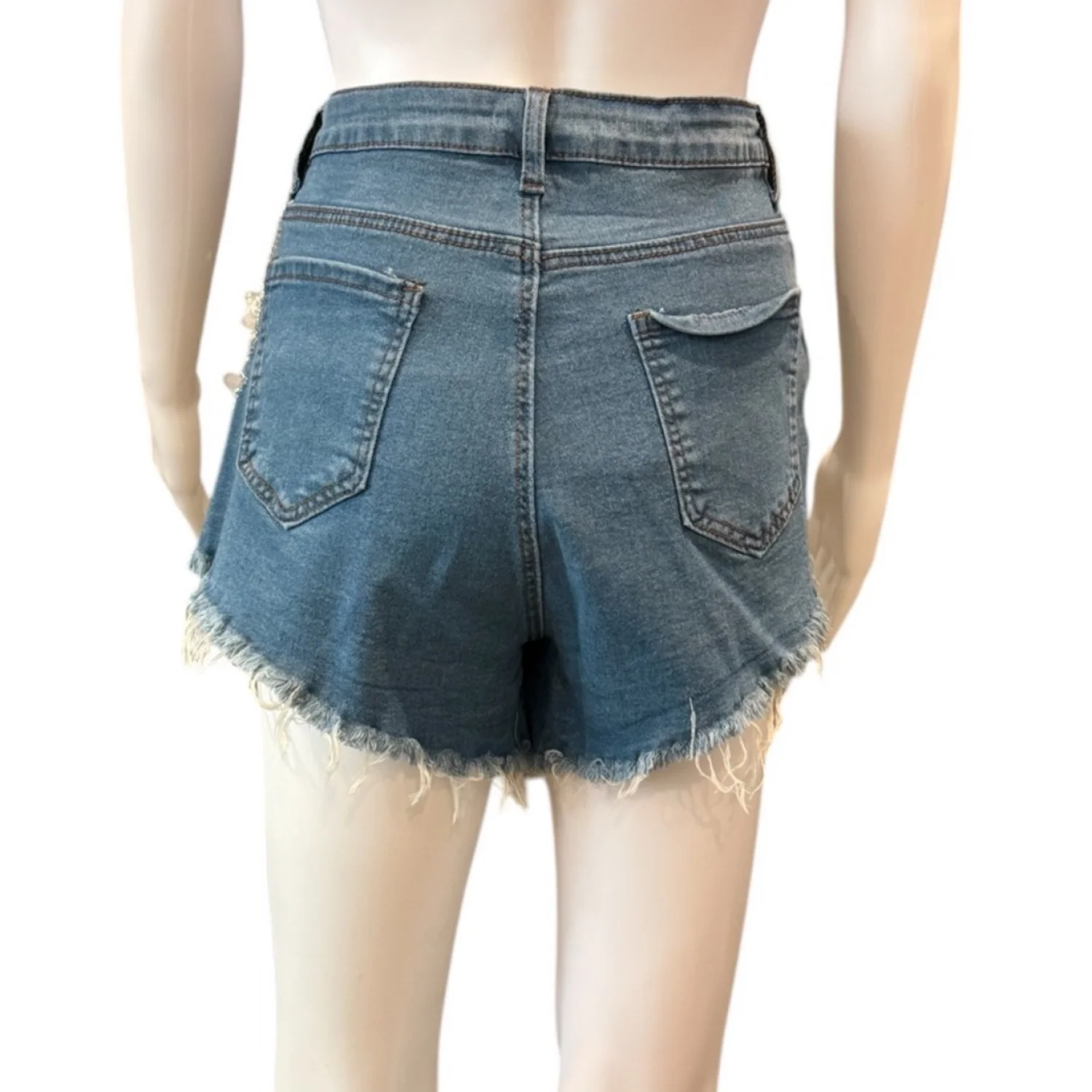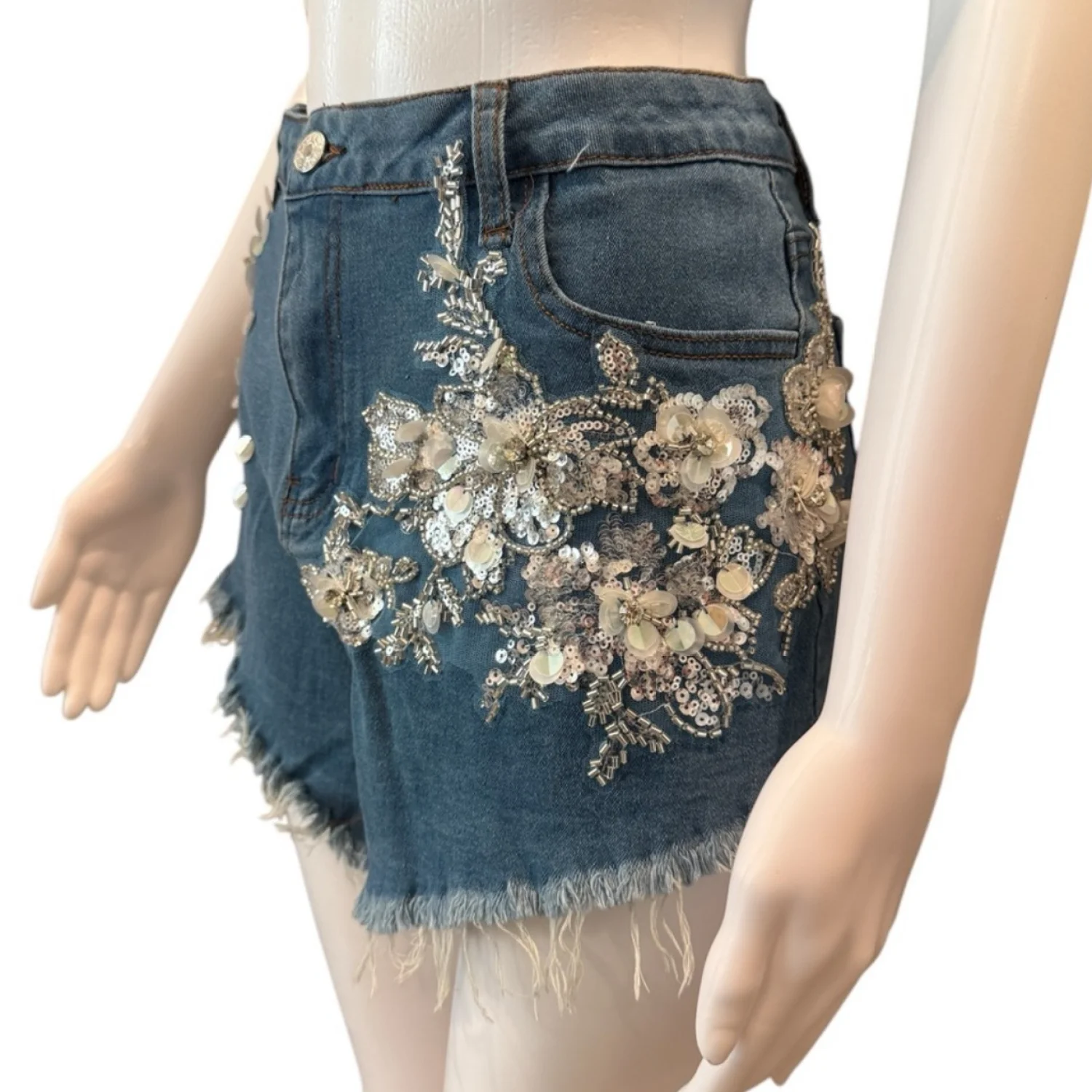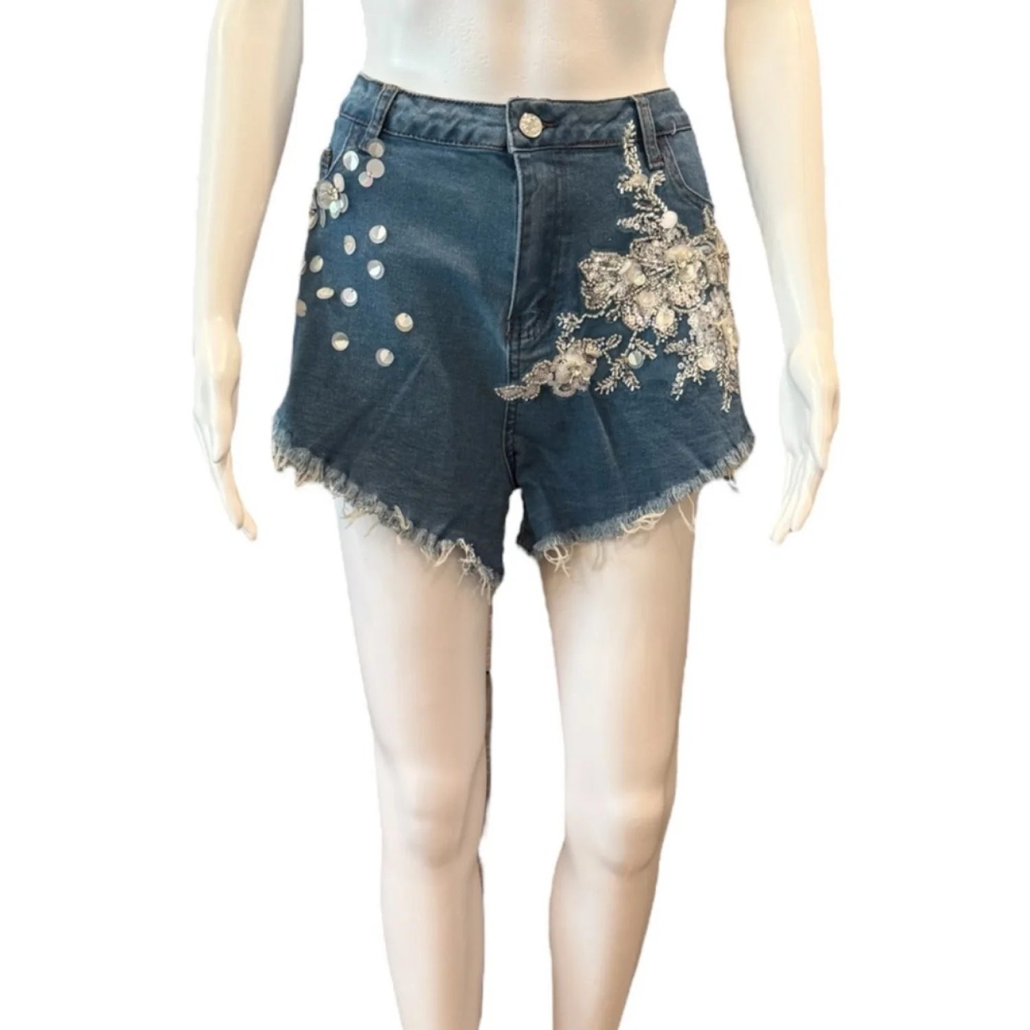 Stylish high-waisted denim shorts featuring intricate floral embroidery and sequin embellishments. These shorts have a frayed hem for a trendy look. Perfect for casual summer outfits or festival wear. Made from durable denim material. Includes classic five-pocket styling. ••REASONABLE OFFERS ARE WELCOMED••