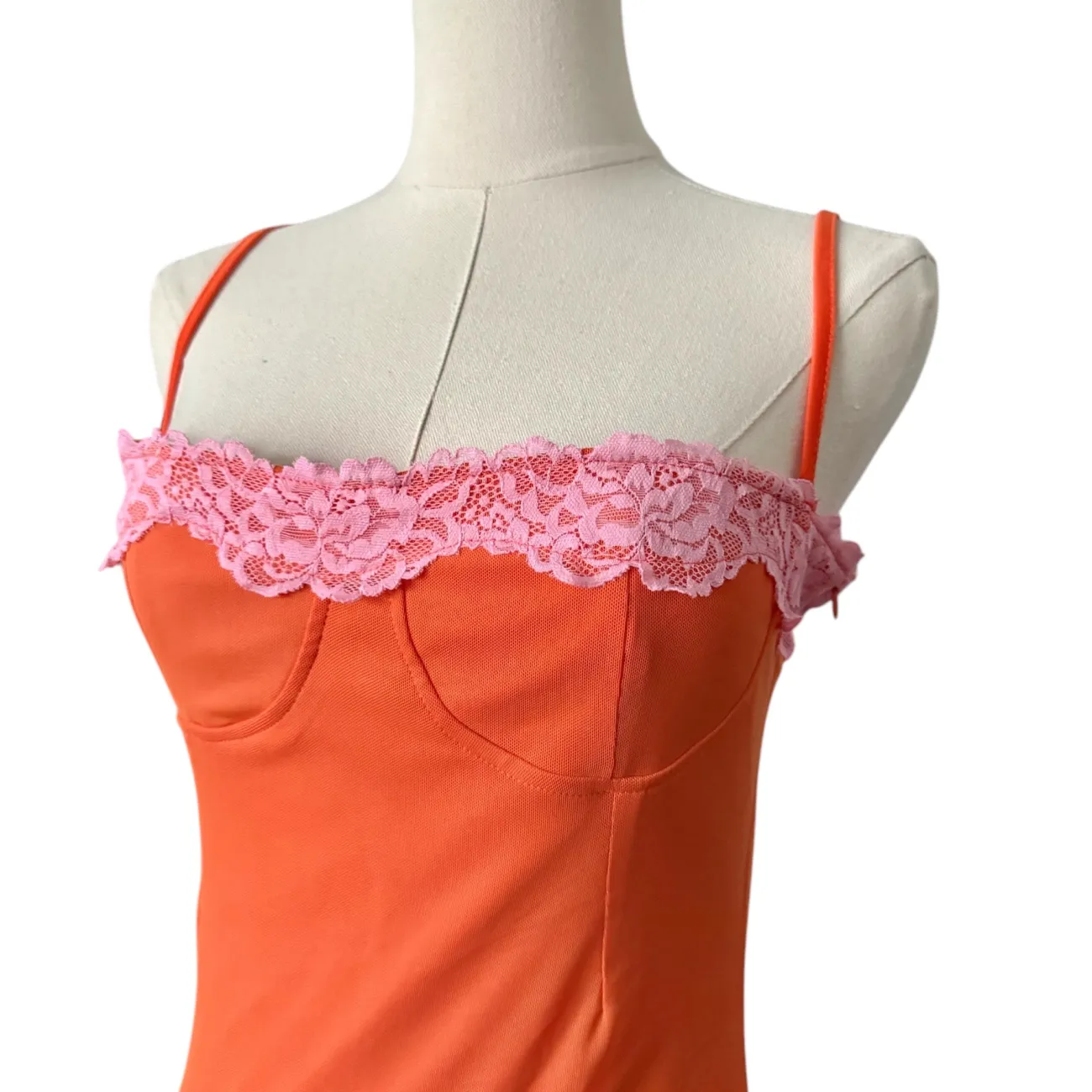 Discover an elegant blend of bold color and delicate detail with this striking orange maxi dress, accentuated by a soft pink lace trim at the bust. The slim silhouette and adjustable spaghetti straps create a flattering, body-conscious fit that gracefully elongates your frame for a poised and polished appearance. Tailored from a lightweight fabric, this dress offers both comfort and sophistication, making it ideal for upscale events or intimate gatherings where you want to make a memorable impression. • Color: Orange with pink lace trim • Size: Large, women’s regular • Style: Maxi dress • Straps: Adjustable spaghetti straps • Fit: Slim, figure-hugging • Length: Full length • REASONABLE OFFERS ARE WELCOMED•