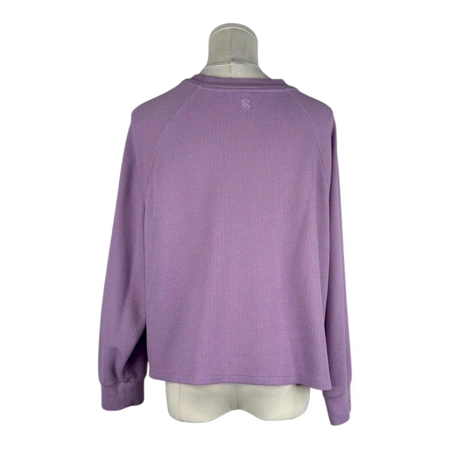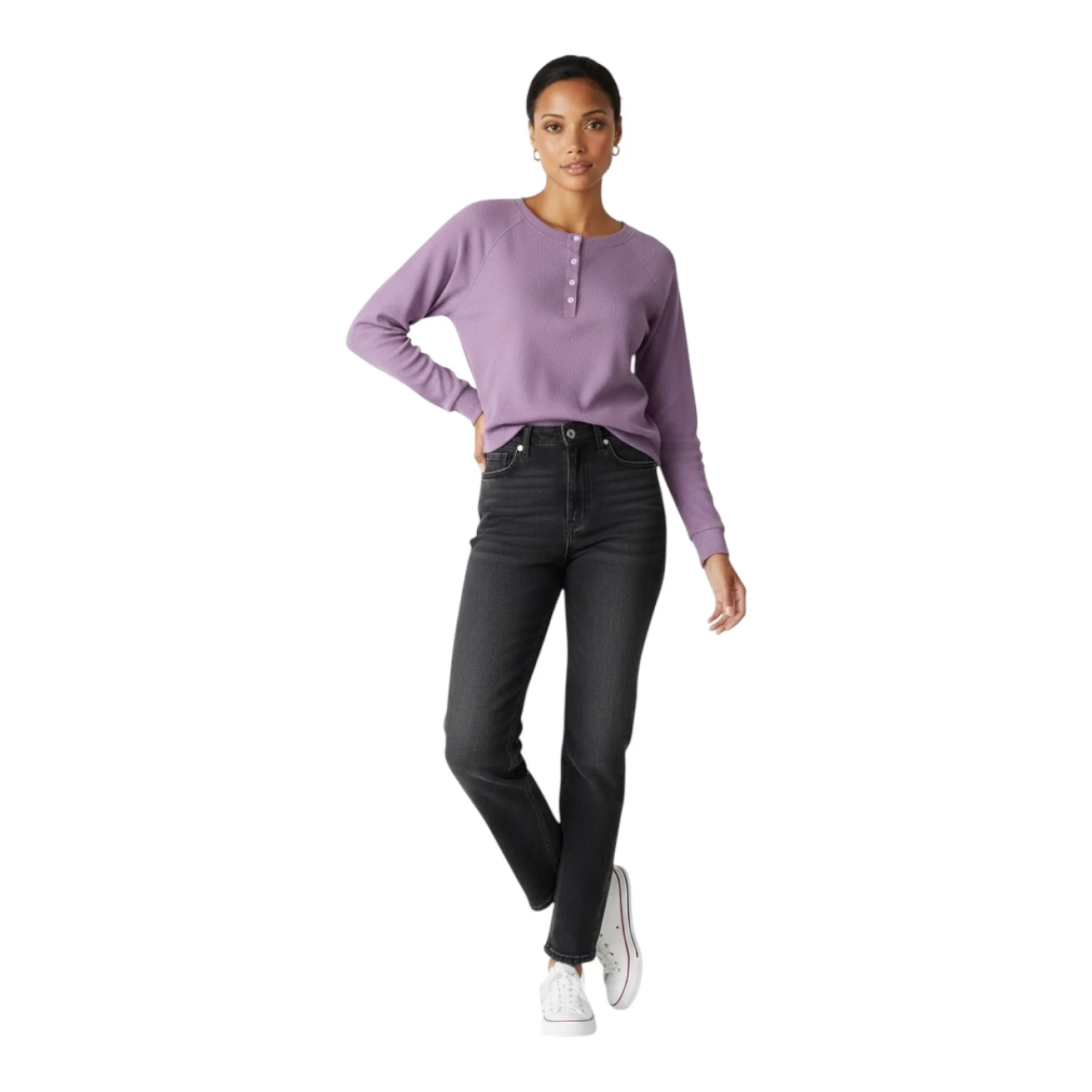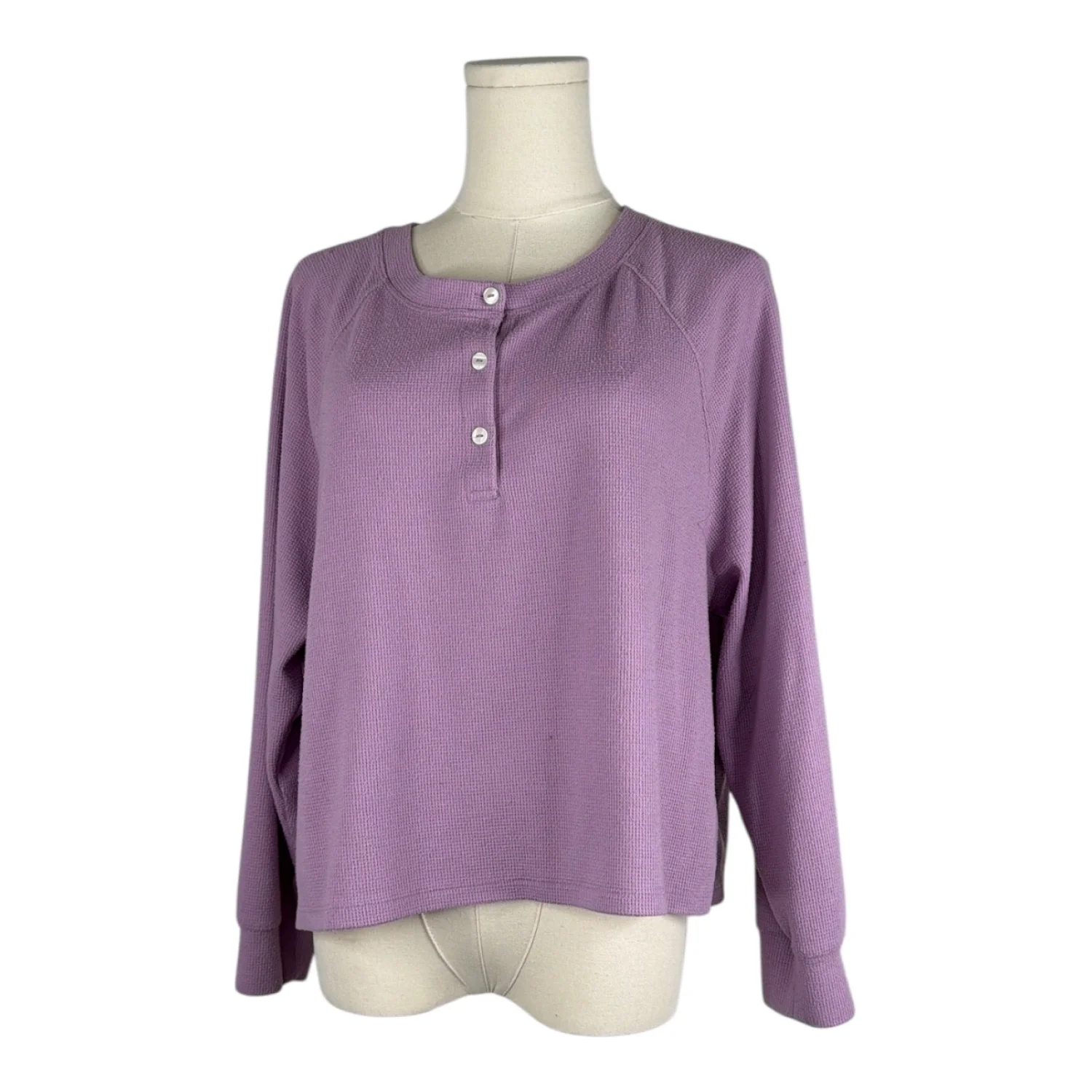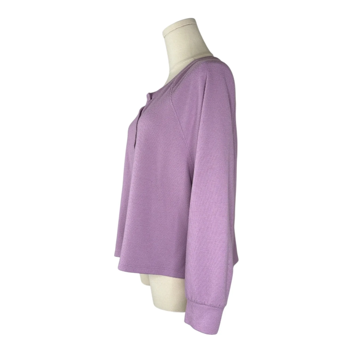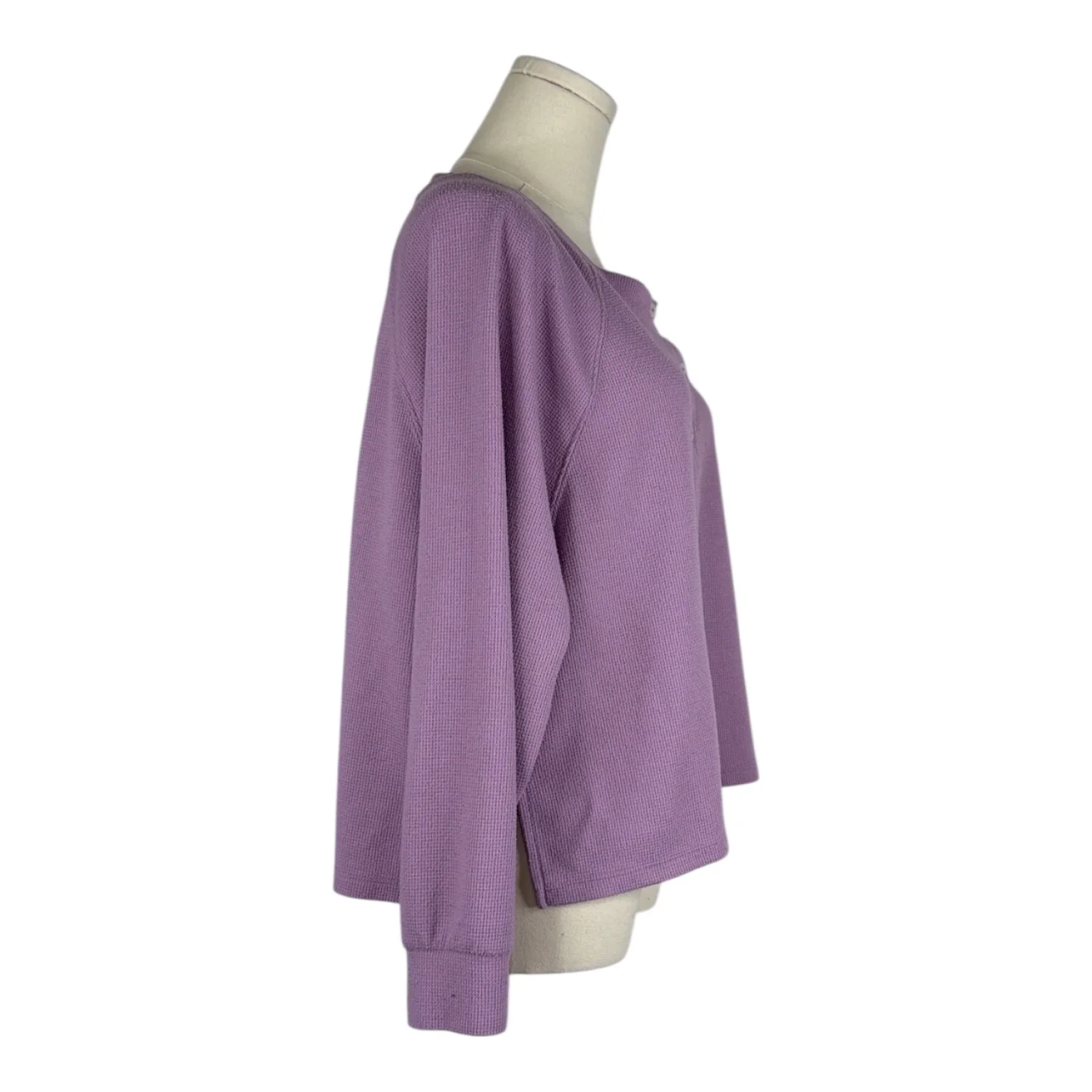 This purple waffle knit Henley top features a round neckline with a three-button placket. The long sleeves and relaxed fit offer comfort and style, perfect for casual wear. Material is soft and cozy, making it ideal for layering. Tags: #casual #henley #waffleknit.