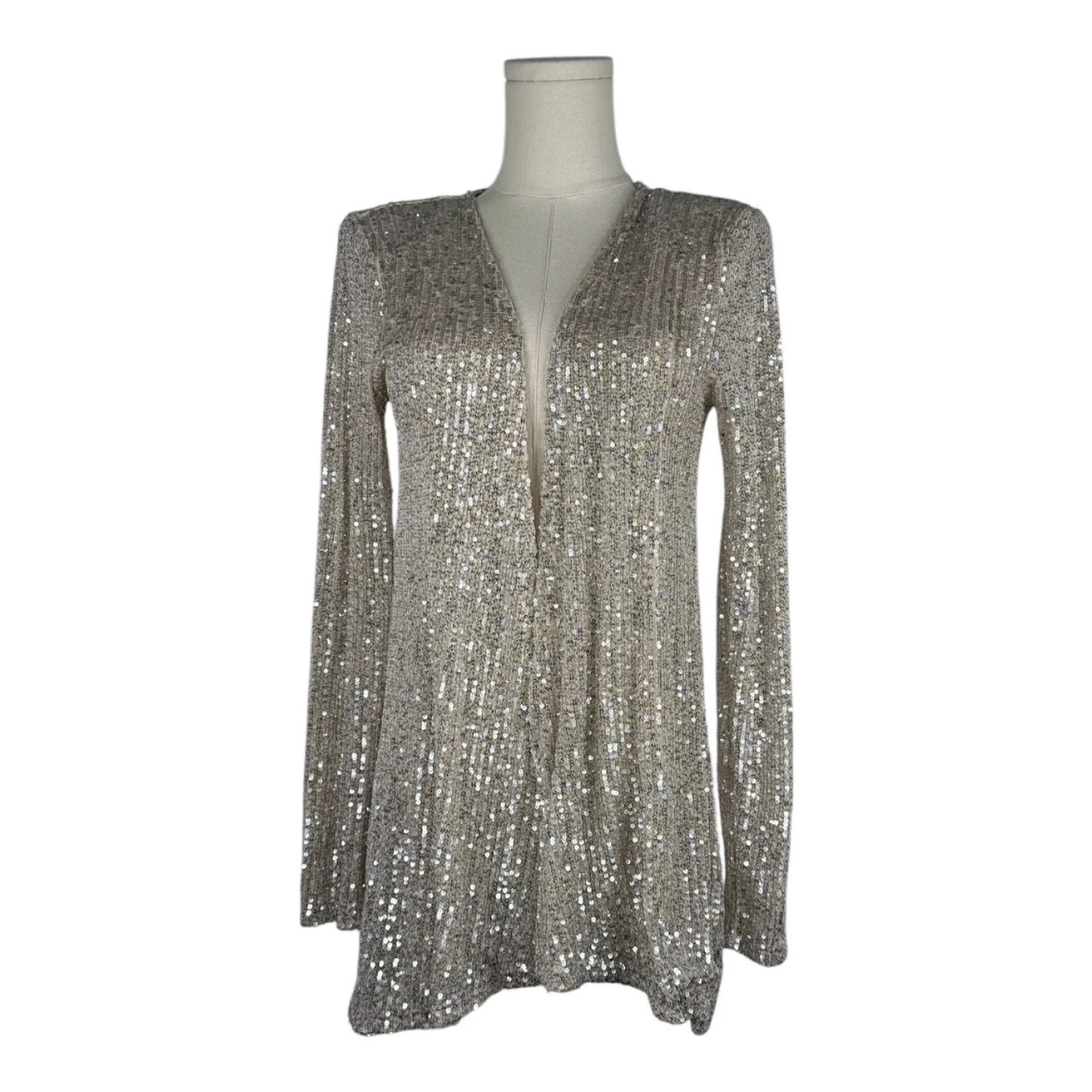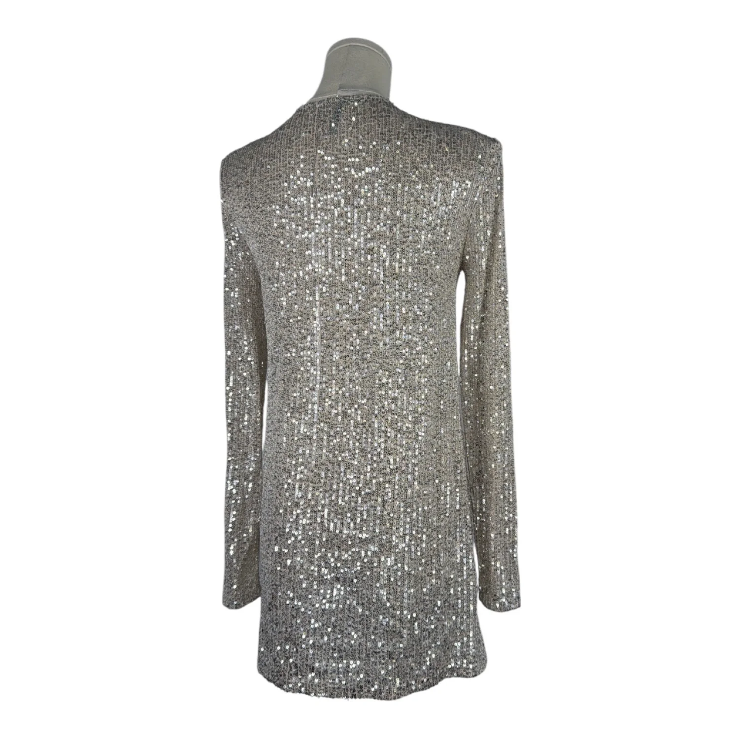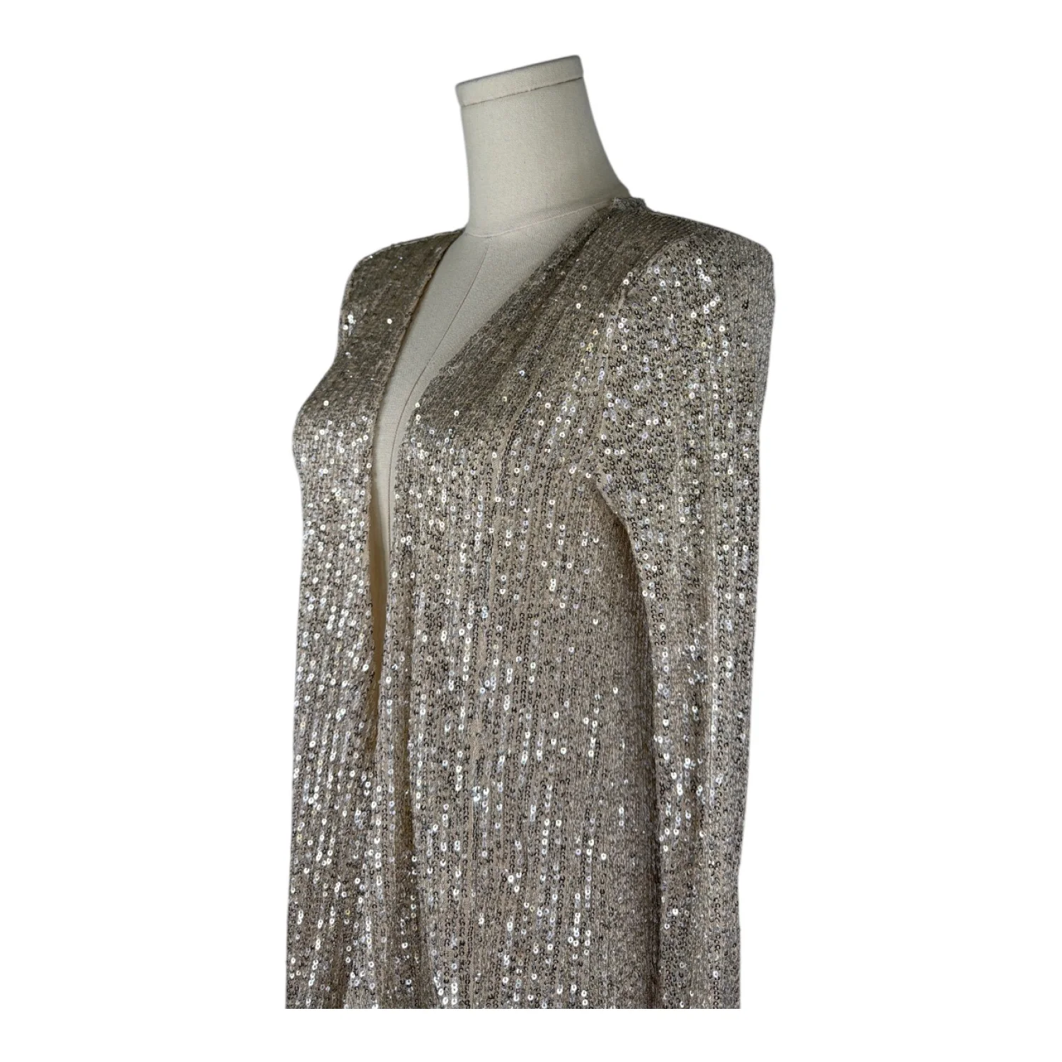 This stunning silver sequin long cardigan is perfect for adding a touch of sparkle to any outfit. Featuring an open front design with long sleeves, it drapes elegantly for both casual and formal occasions. Ideal for layering over tops or dresses. Tags: #sequins, #glam, #cardigan